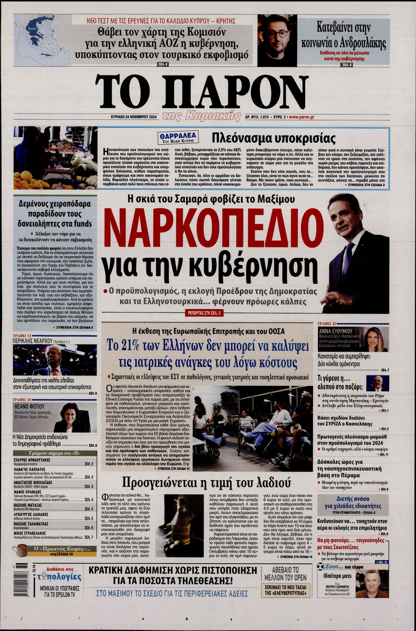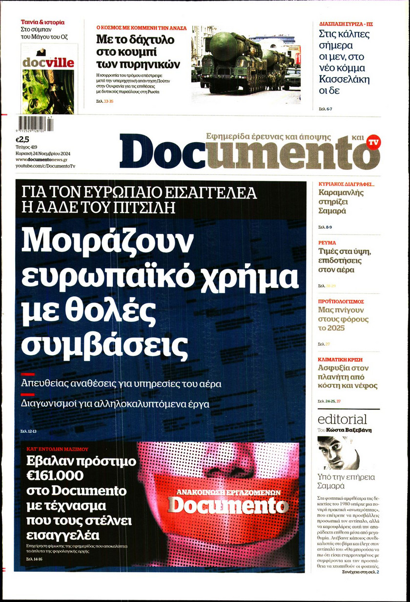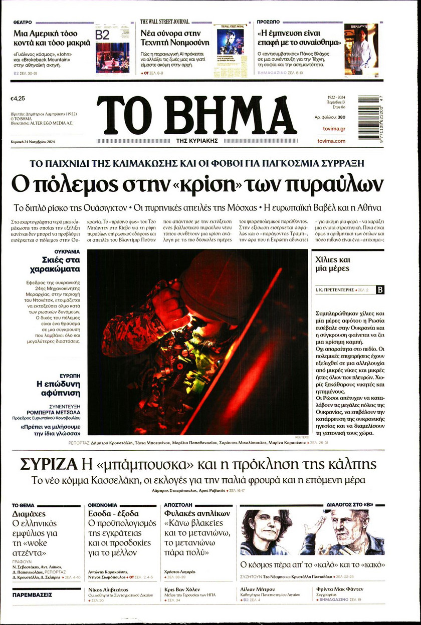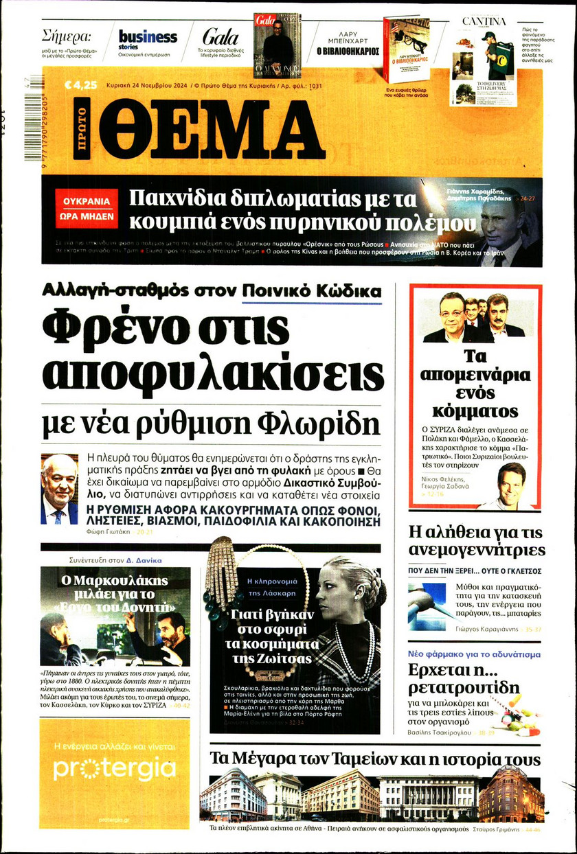 Οι φόβοι για παγκόσμια σύρραξη μετά και τις τελευταίες πυρηνικές απειλές του Βλαντίμιρ Πούτιν, τα 10 νέα μέτρα για την υγεία που που ετοιμάζει η κυβέρνηση για το 2025, η αλλαγή-σταθμός στον ποινικό κώδικα με τη ρύθμιση του υπουργού Δικαιοσύνης Γιώργου Φλωρίδη που βάζει φρένο στις αποφυλακίσεις και το διήμερο της Αριστεράς και το νέο κόμμα Κασσελάκη και την εκλογή νέου αρχηγού στον ΣΥΡΙΖΑ-ΠΣ ξεχωρίζουν στα πρωτοσέλιδα των κυριακάτικων εφημερίδων.