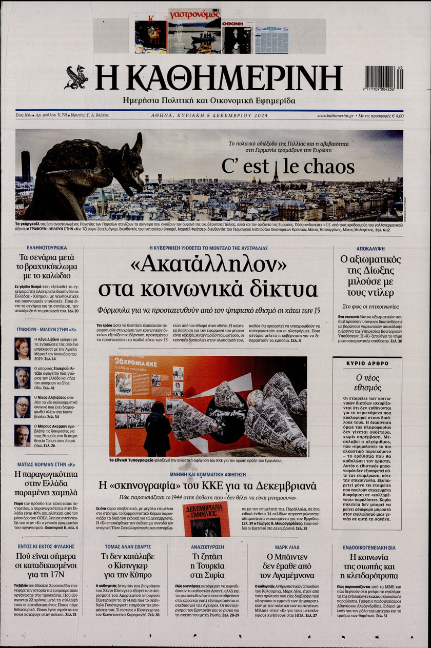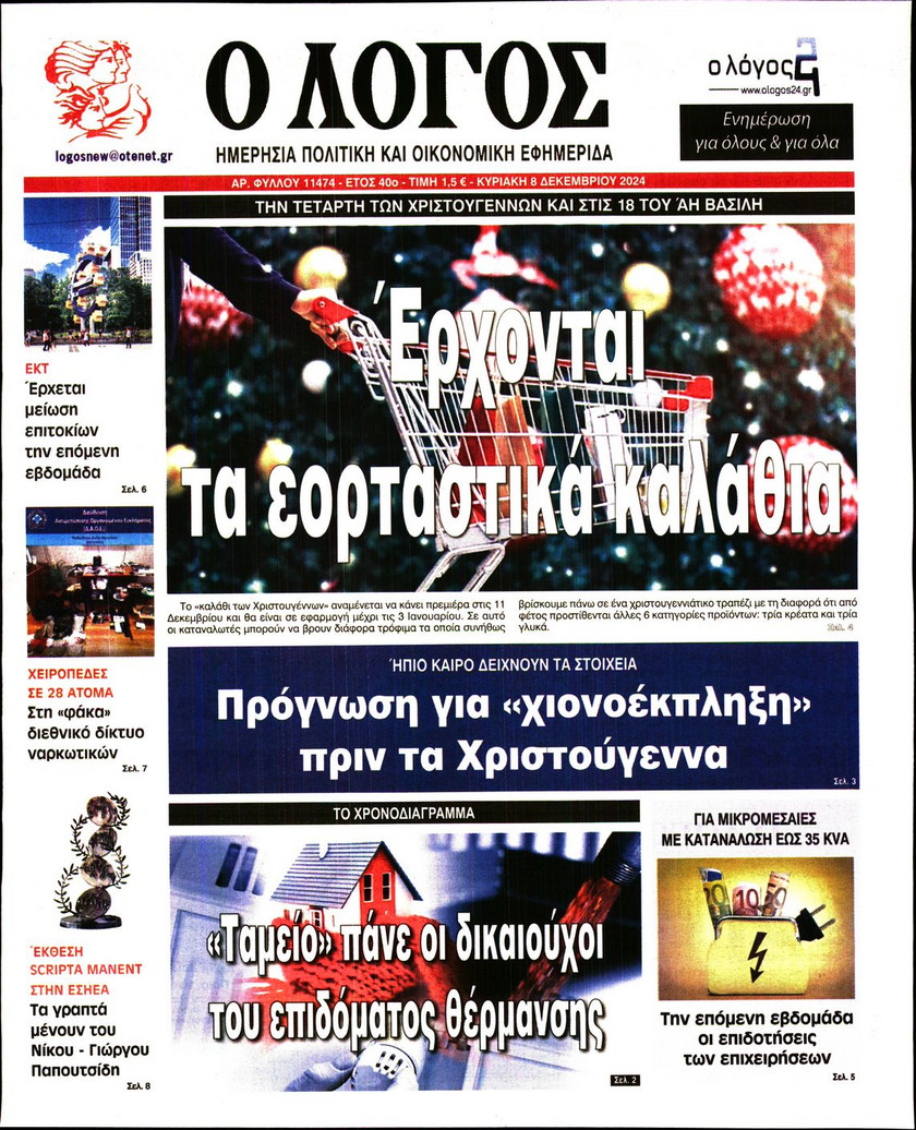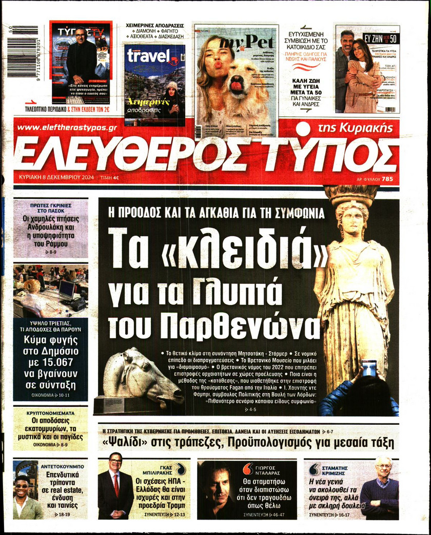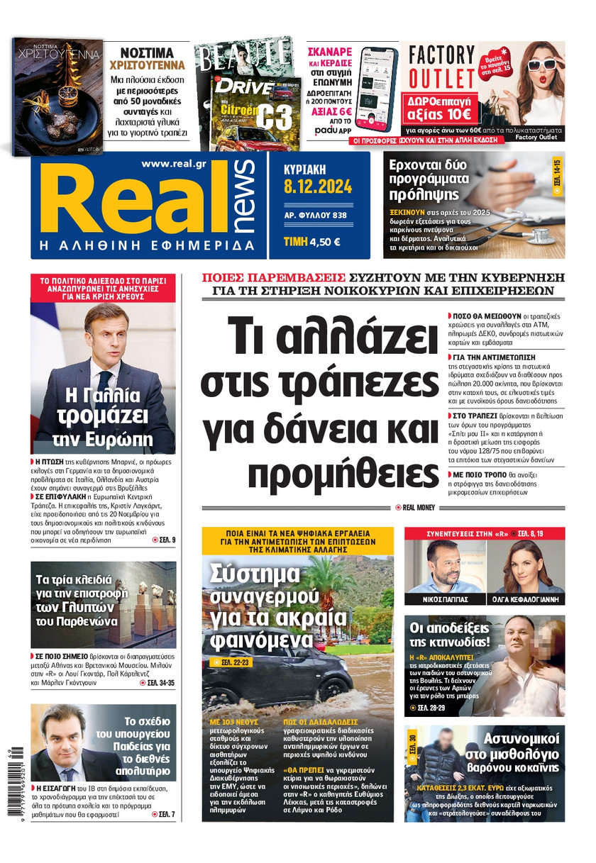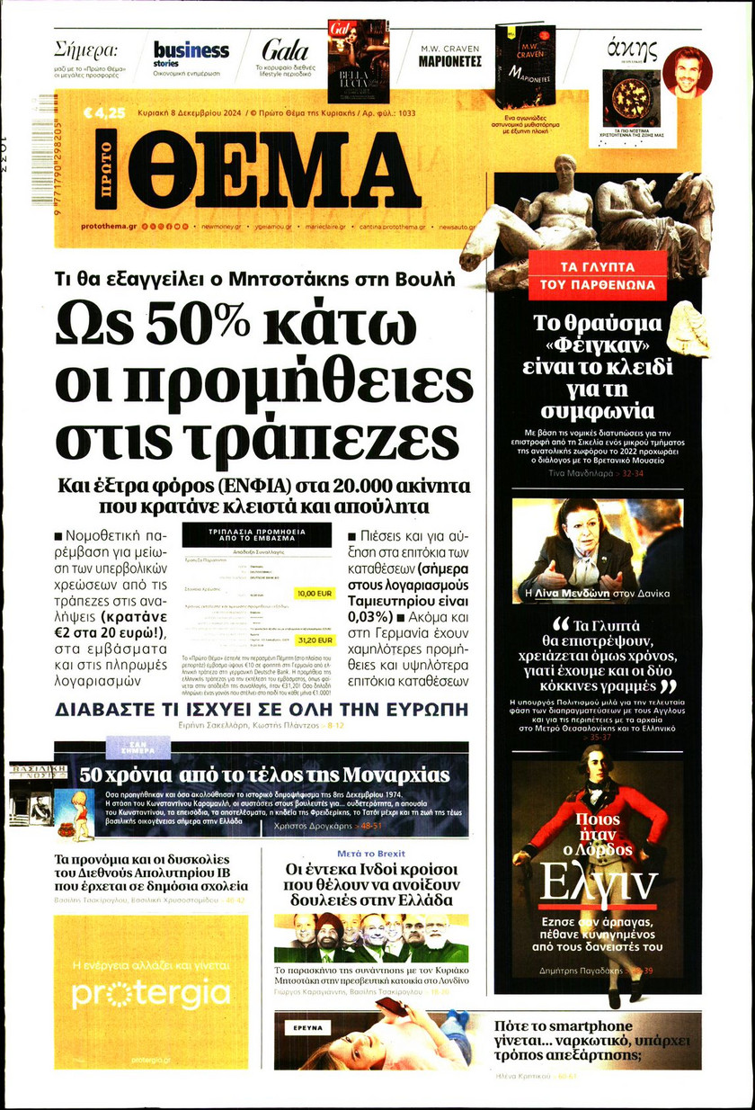 Οι εξαγγελίες του πρωθυπουργού Κυριάκου Μητσοτάκη όσον αφορά στις τράπεζες και οι παρεμβάσεις που συζητούνται για την προστασία των νοικοκυριών και των επιχειρπήσεων, η πρόοδος και τα «αγκάθια» για την επιστρογή των Γλυπτών του Παρθενώνα, τα σενάρια που εξετάζει η κυβέρνηση ώστε να προστατέψει τα παιδιά κάτω των 15 από τον διαδικτυακό εθισμό και τα νέα ψηφιακά εργαλεία για την αντιμετώπιση των ακραίων καιρικών φαινομένων και των επιπτώσεων από την κλιματική κρίση ξεχωρίζουν στα πρωτοσέλιδα των κυριακάτικων εφημερίδων.
