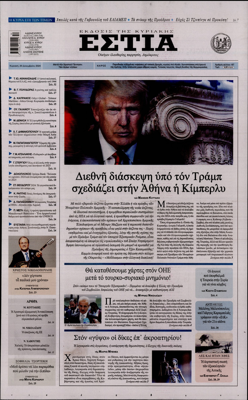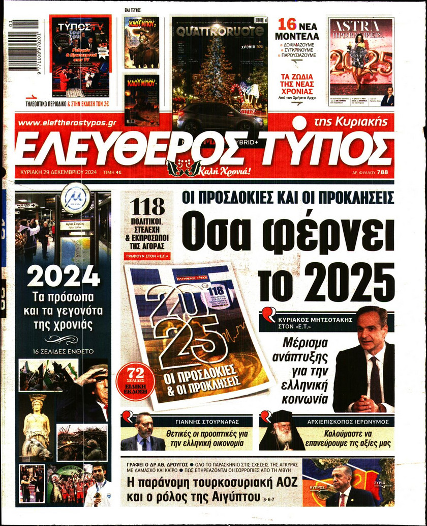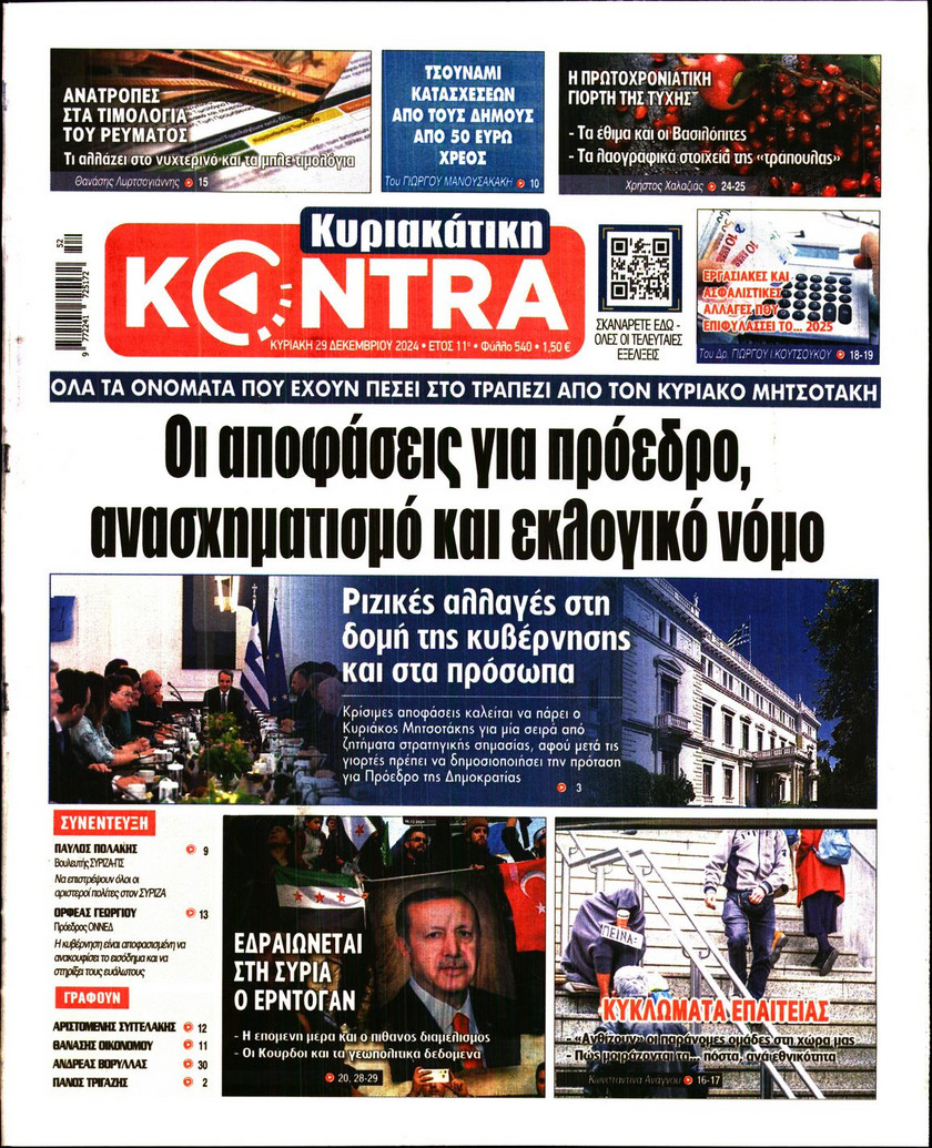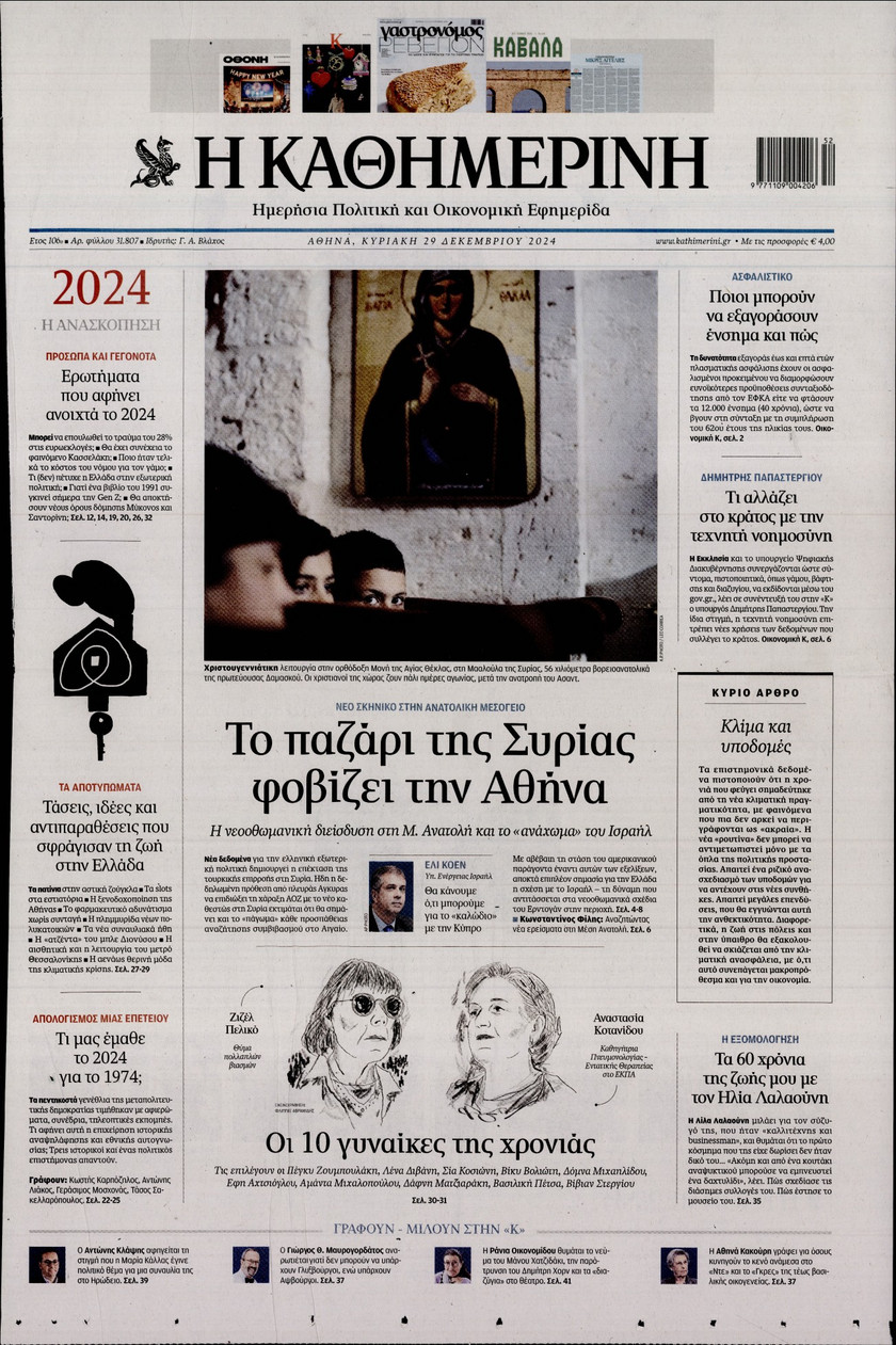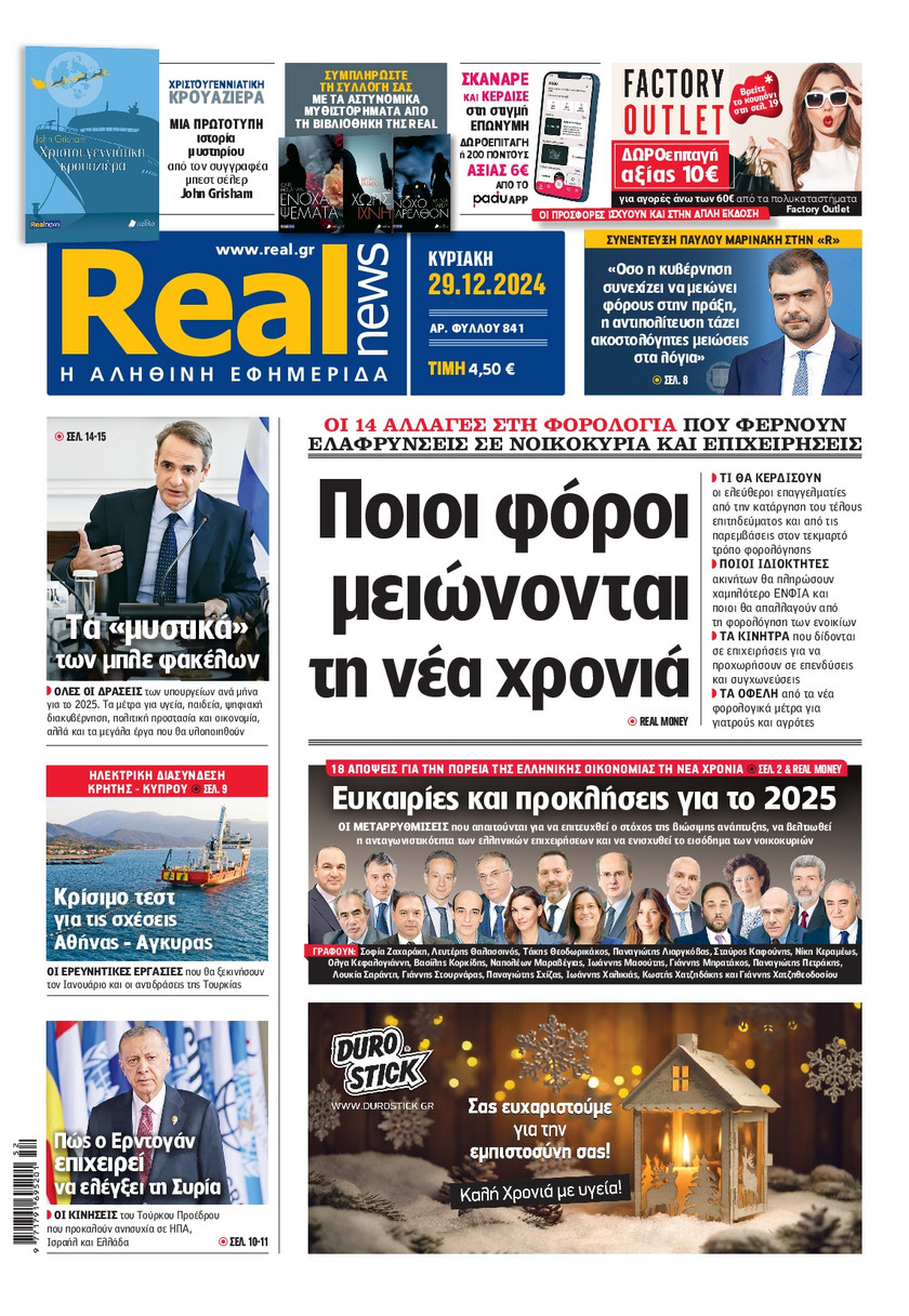 Οι 14 αλλαγές στη φορολογία που φέρνουν ελαφρύνσεις σε νοικοκυριά και επιχειρήσεις, οι κινήσεις του Ρετζέπ Ταγίπ Ερντογάν στη Συρία που προκαλούν ανησυχίες σε ΗΠΑ, Ισραήλ και Ελλάδα, τα νέα φάρμακα που έρχονται για καρκίνο, Αλτσχάιμερ, χρόνιο πόνο και παχυσαρκία που υπόσχονται εντυπωσιακά θεραπευτικά αποτελέσματα και οι αλλαγές που έρχονται στις τιμές των ακινήτων το 2025 ξεχωρίζουν στα πρωτοσέλιδα των κυριακάτικων εφημερίδων.
