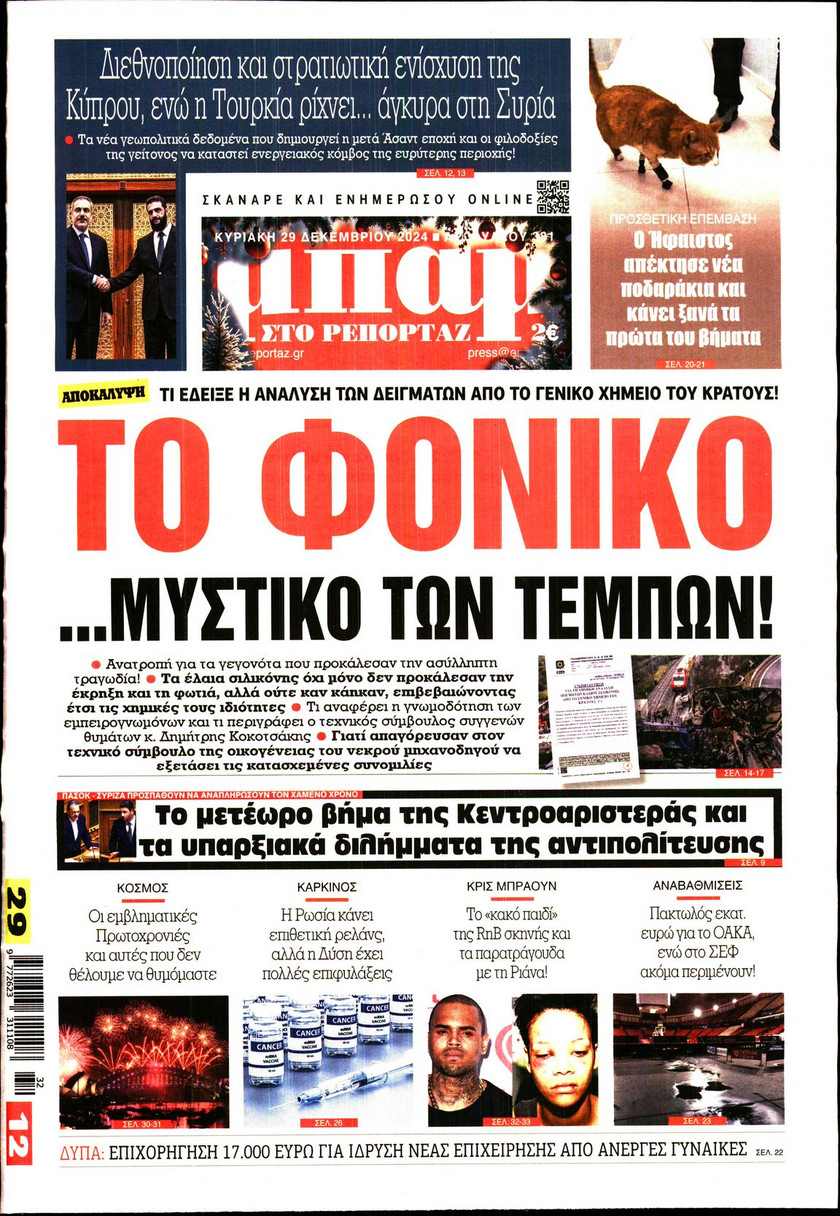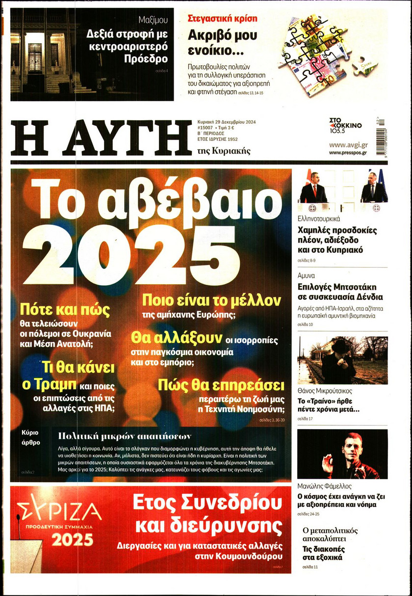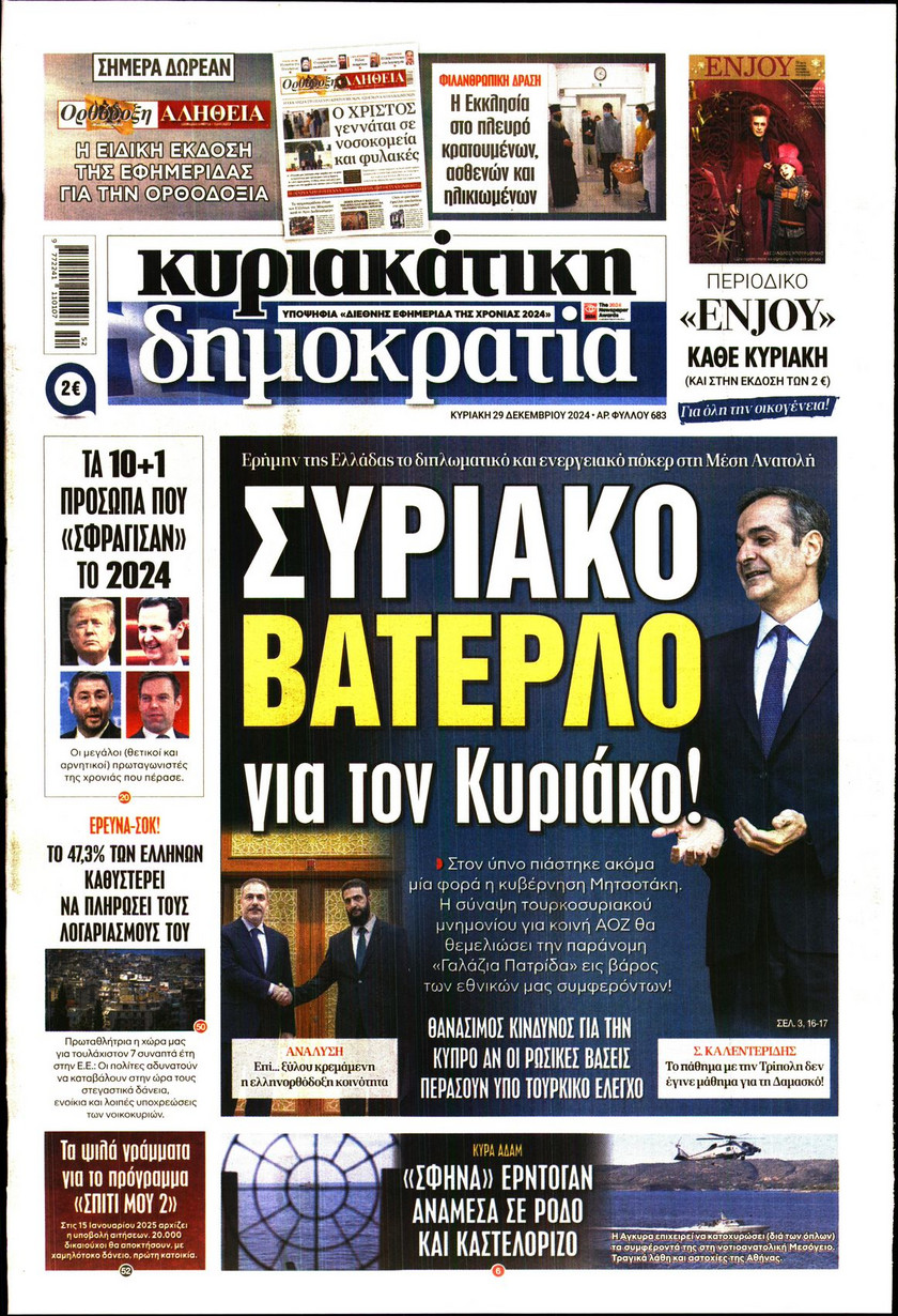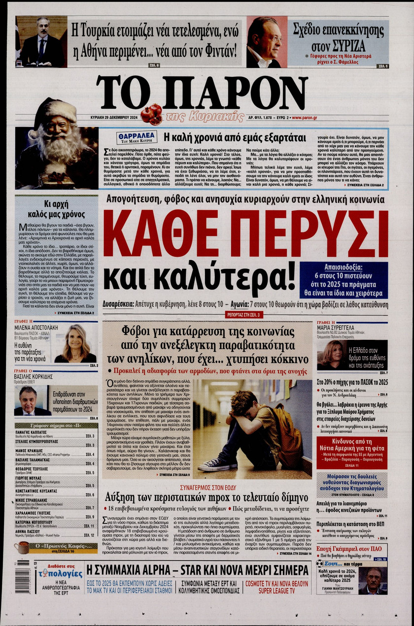 Οι 14 αλλαγές στη φορολογία που φέρνουν ελαφρύνσεις σε νοικοκυριά και επιχειρήσεις, οι κινήσεις του Ρετζέπ Ταγίπ Ερντογάν στη Συρία που προκαλούν ανησυχίες σε ΗΠΑ, Ισραήλ και Ελλάδα, τα νέα φάρμακα που έρχονται για καρκίνο, Αλτσχάιμερ, χρόνιο πόνο και παχυσαρκία που υπόσχονται εντυπωσιακά θεραπευτικά αποτελέσματα και οι αλλαγές που έρχονται στις τιμές των ακινήτων το 2025 ξεχωρίζουν στα πρωτοσέλιδα των κυριακάτικων εφημερίδων.