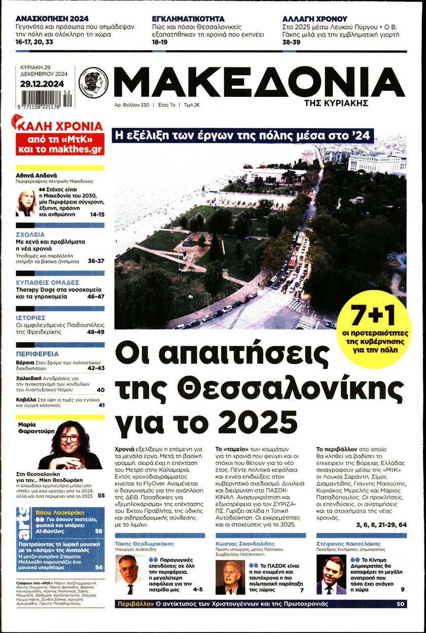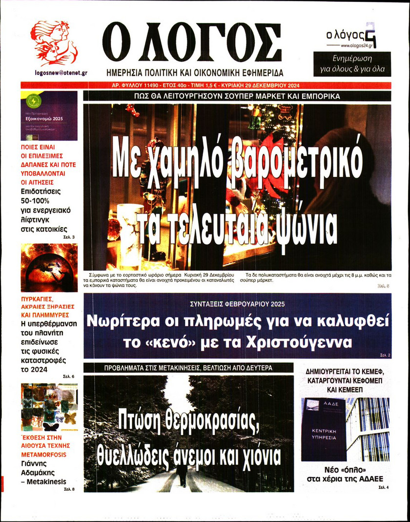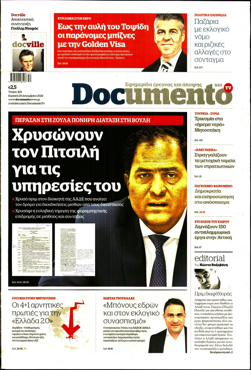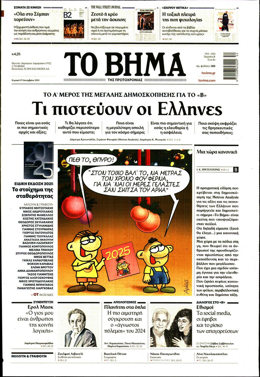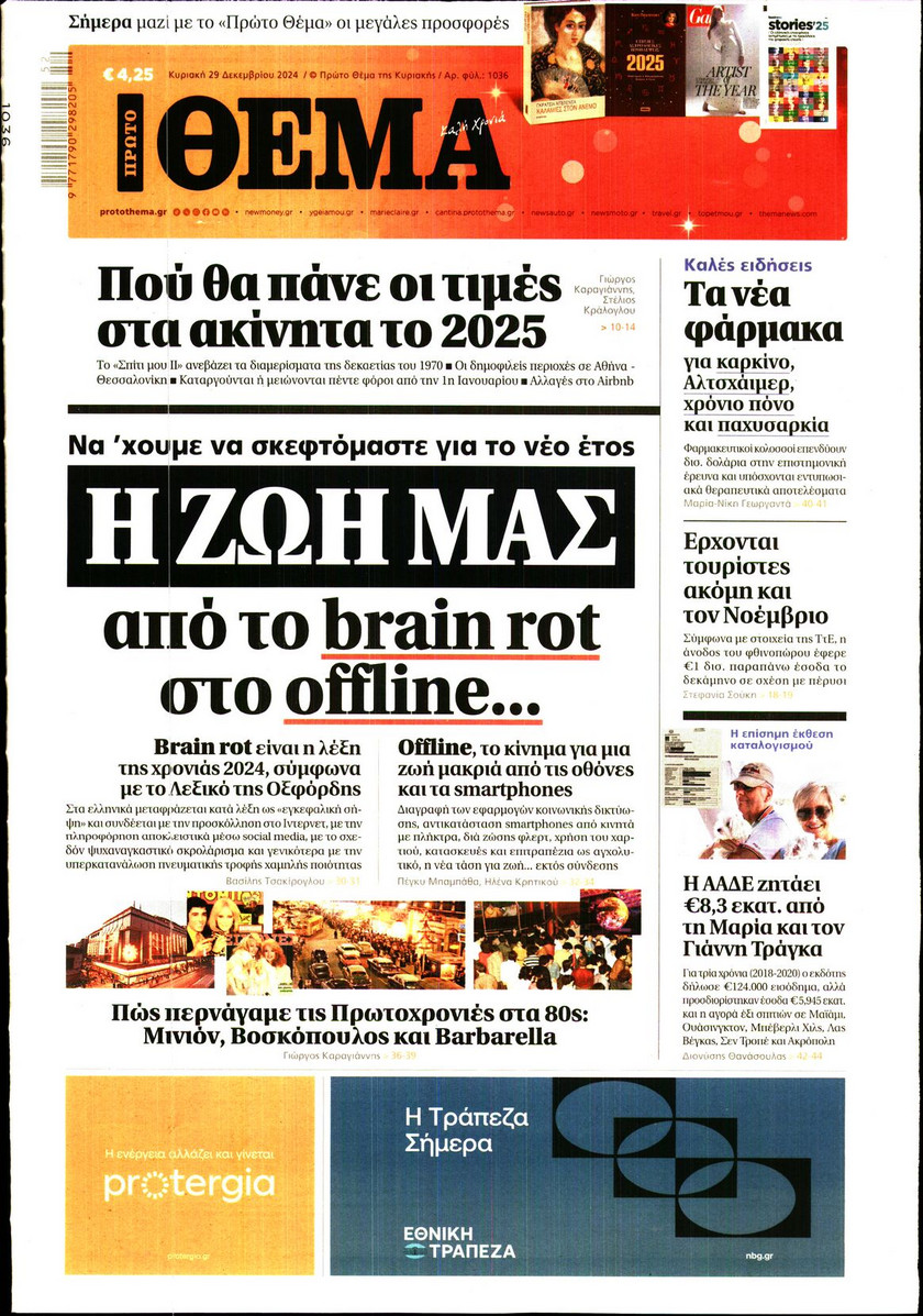 Οι 14 αλλαγές στη φορολογία που φέρνουν ελαφρύνσεις σε νοικοκυριά και επιχειρήσεις, οι κινήσεις του Ρετζέπ Ταγίπ Ερντογάν στη Συρία που προκαλούν ανησυχίες σε ΗΠΑ, Ισραήλ και Ελλάδα, τα νέα φάρμακα που έρχονται για καρκίνο, Αλτσχάιμερ, χρόνιο πόνο και παχυσαρκία που υπόσχονται εντυπωσιακά θεραπευτικά αποτελέσματα και οι αλλαγές που έρχονται στις τιμές των ακινήτων το 2025 ξεχωρίζουν στα πρωτοσέλιδα των κυριακάτικων εφημερίδων.