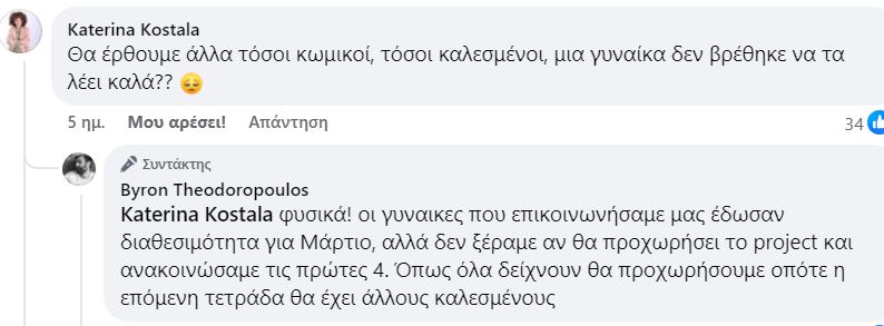 Ότι απουσιάζει η οπτική γωνία. Δεν ξέρω. Εγώ ακόμα και αν θεωρούσα βαθιά ότι οι γυναίκες δεν είναι αστείες για λόγους εικόνας και μόνο θα έκανα οτιδηποτε περνούσε από το χέρι μου, για να υπάρχουν. Έτσι για το φαίνεστε. Αλλιώς δεν θα την ανέβαζα την αφίσα. Είναι λάθος. Πάντως το χαρτί, εν έτη 2025 «Δυσκολία εύρεσης γυναίκας συνάδελφου» αποκλειεται. Είναι εύκολο και αν μου επιτρέπεται φτηνό, και ίσως περιμένω παρά πάνω πράγματα από ανθρώπους που εκτιμώ και τους έχω σε υπόληψη βλέποντας τους στην σκηνή με έκαναν πιο έξυπνη και πιο καλή κωμικό. Και το χειρότερο· αναπαράγει το μήνυμα στον κόσμο «Δεν υπάρχουν γυναίκες στην κωμωδία» ή μάλλον κάτι ακόμα χειρότερο βάσει του φορμάτ της παράστασης: «Δεν χωράνε γενικά οι γυναίκες όσο οι άντρες κωμικοί λένε αστεία».