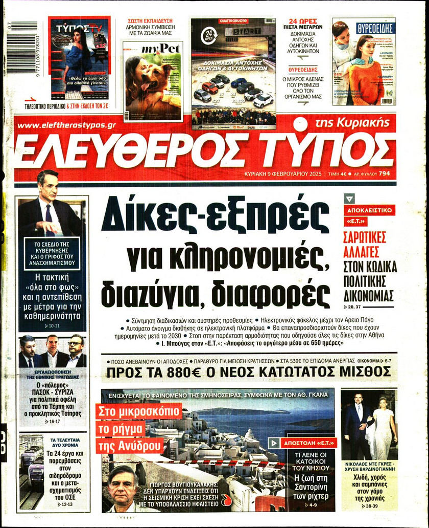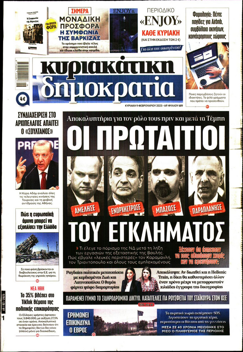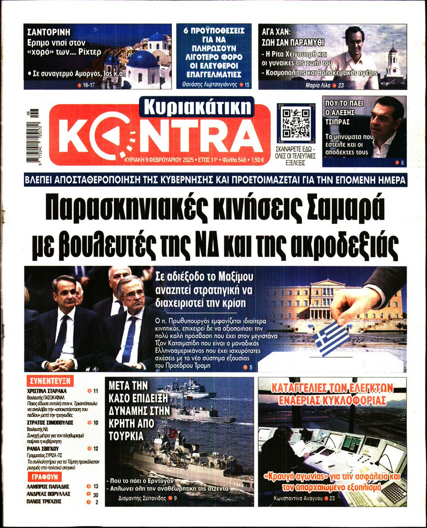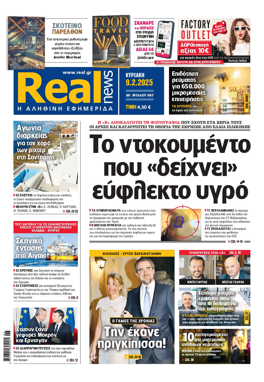Ο χορός των Ρίχτερ στο νησί της Σαντορίνης και οι ανησυχίες που εκφράζονται για δυνατό σεισμό στο νησί, η νέα κατεύθυνση που στρέφονται οι έρευνες για την τραγωδία των Τεμπών σε συνδυασμό με τις έρευνες εξιδεικευμένων ινστιτούτων και φορέων για το ενδεχόμενο παράνομου φορτίου στην εμπορική αμαξοστοιχία, το ξέπλυμα μαύρου χρήματος πίσω από την δολοφόνία του τοπογράφου στο Ψυχικό και όλα τα παραλειπόμενα από τον γάμο του Νικόλαου Ντε Γκρες με την Χρυσή Βαρδινογιάννη ξεχωρίζουν στα πρωτοσέλιδα των κυριακάτικών εφημερίδων.
