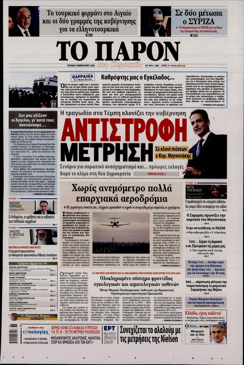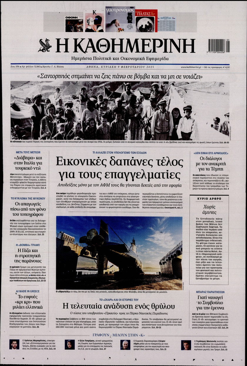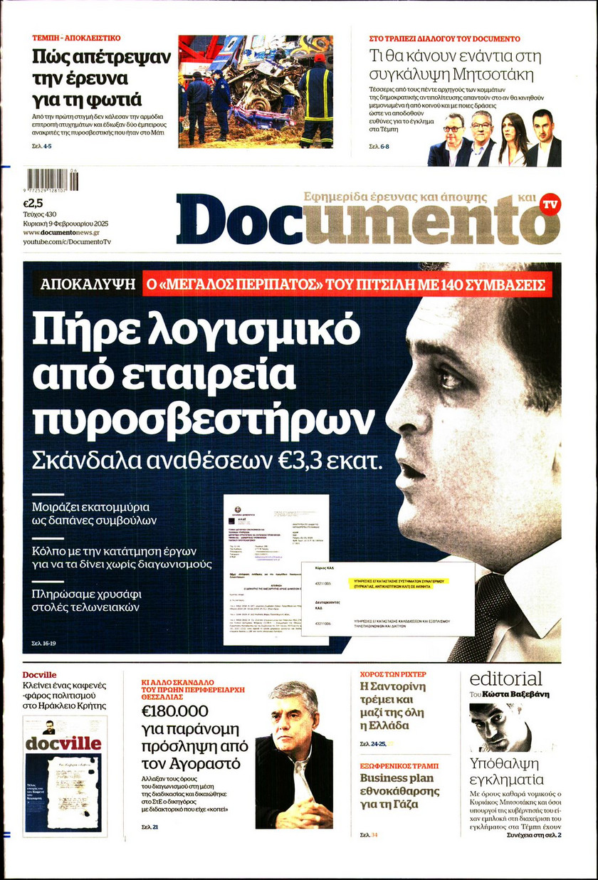 Ο χορός των Ρίχτερ στο νησί της Σαντορίνης και οι ανησυχίες που εκφράζονται για δυνατό σεισμό στο νησί, η νέα κατεύθυνση που στρέφονται οι έρευνες για την τραγωδία των Τεμπών σε συνδυασμό με τις έρευνες εξιδεικευμένων ινστιτούτων και φορέων για το ενδεχόμενο παράνομου φορτίου στην εμπορική αμαξοστοιχία, το ξέπλυμα μαύρου χρήματος πίσω από την δολοφόνία του τοπογράφου στο Ψυχικό και όλα τα παραλειπόμενα από τον γάμο του Νικόλαου Ντε Γκρες με την Χρυσή Βαρδινογιάννη ξεχωρίζουν στα πρωτοσέλιδα των κυριακάτικών εφημερίδων.