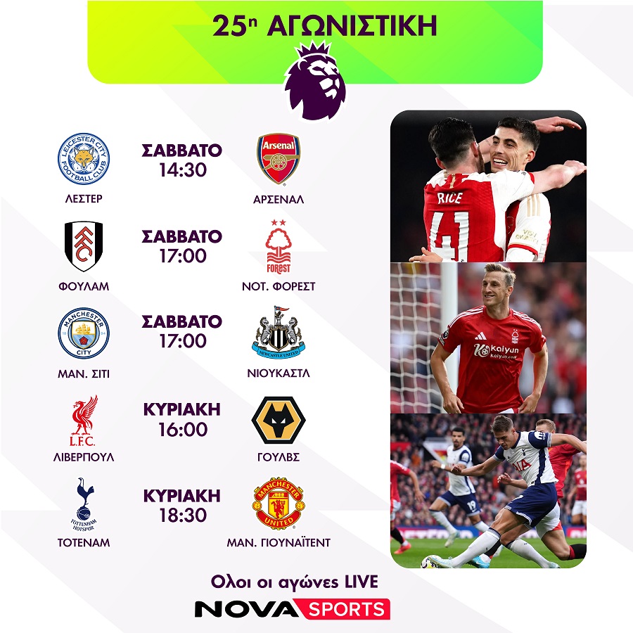Η Premier League, το κορυφαίο πρωτάθλημα στον κόσμο, επιστρέφει στην αγωνιστική δράση και το ενδιαφέρον στρέφεται στους αγώνες Λέστερ – Άρσεναλ (15/2, 14:30), Μάντσεστερ Σίτι-Νιουκάστλ (15/2, 17:00), Φούλαμ – Νότιγχαμ (15/2, 17:00), Λίβερπουλ – Γουλβς (16/2, 16:00) και Τότεναμ – Μάντσεστερ Γιουνάιτεντ (16/2, 18:30) που καλυφθούν από τα κανάλια Novasports. Παράλληλα, την Τετάρτη 12/2 (21:30) θα μεταδοθεί και το εξ’ αναβολής τοπικό ντέρμπι Έβερτον – Λίβερπουλ.