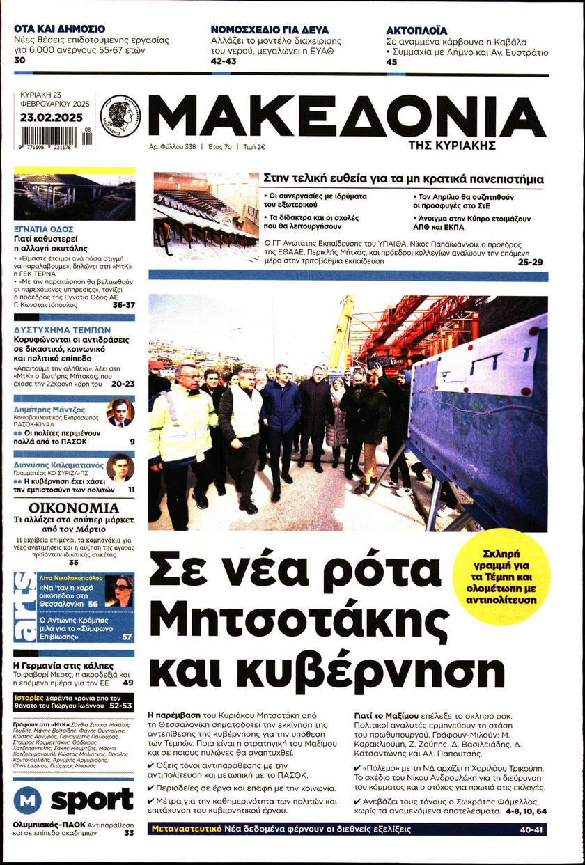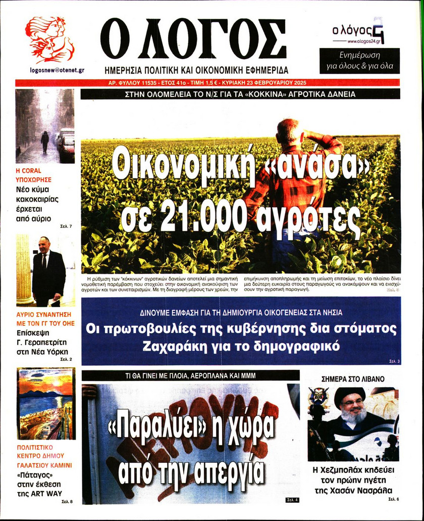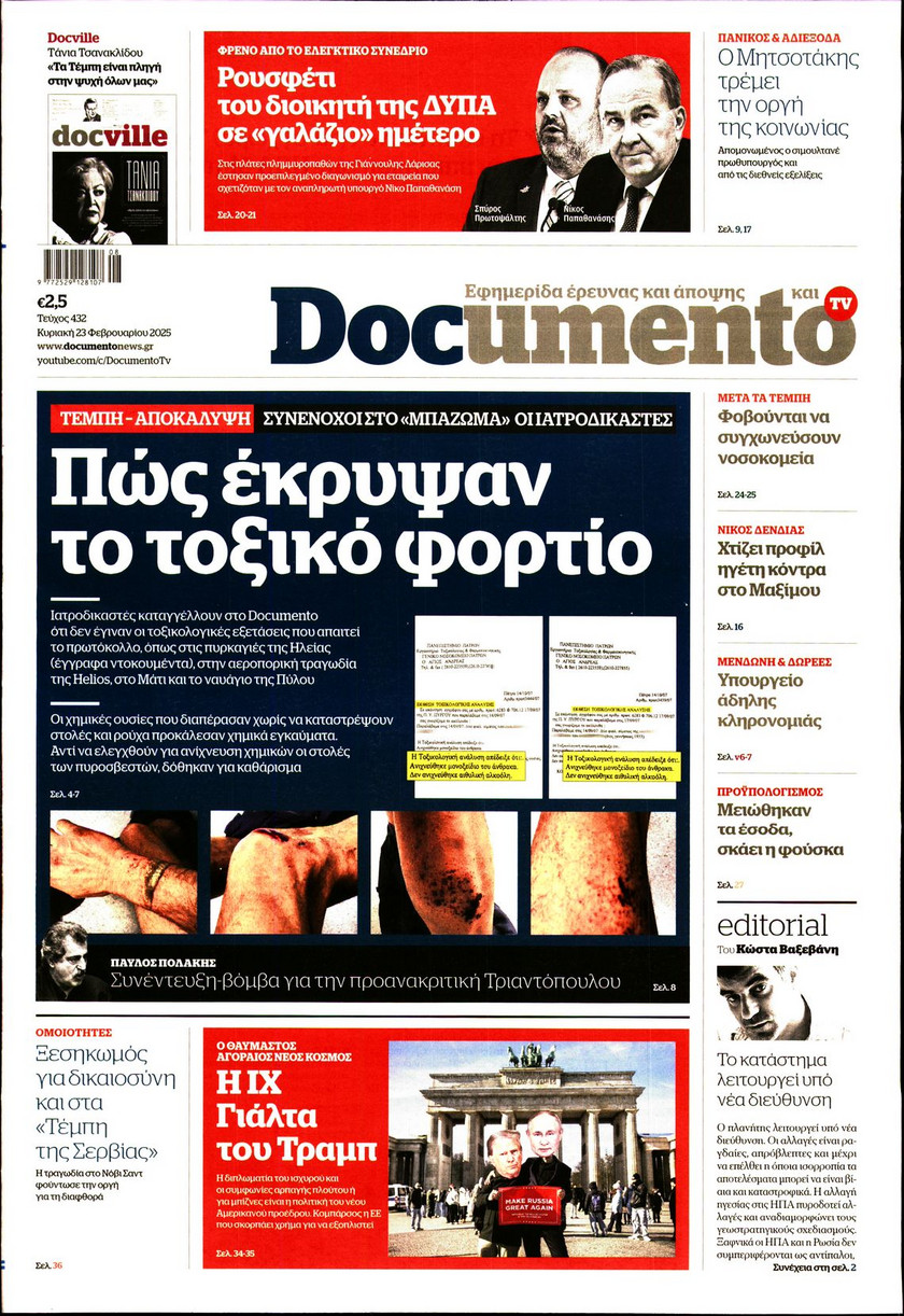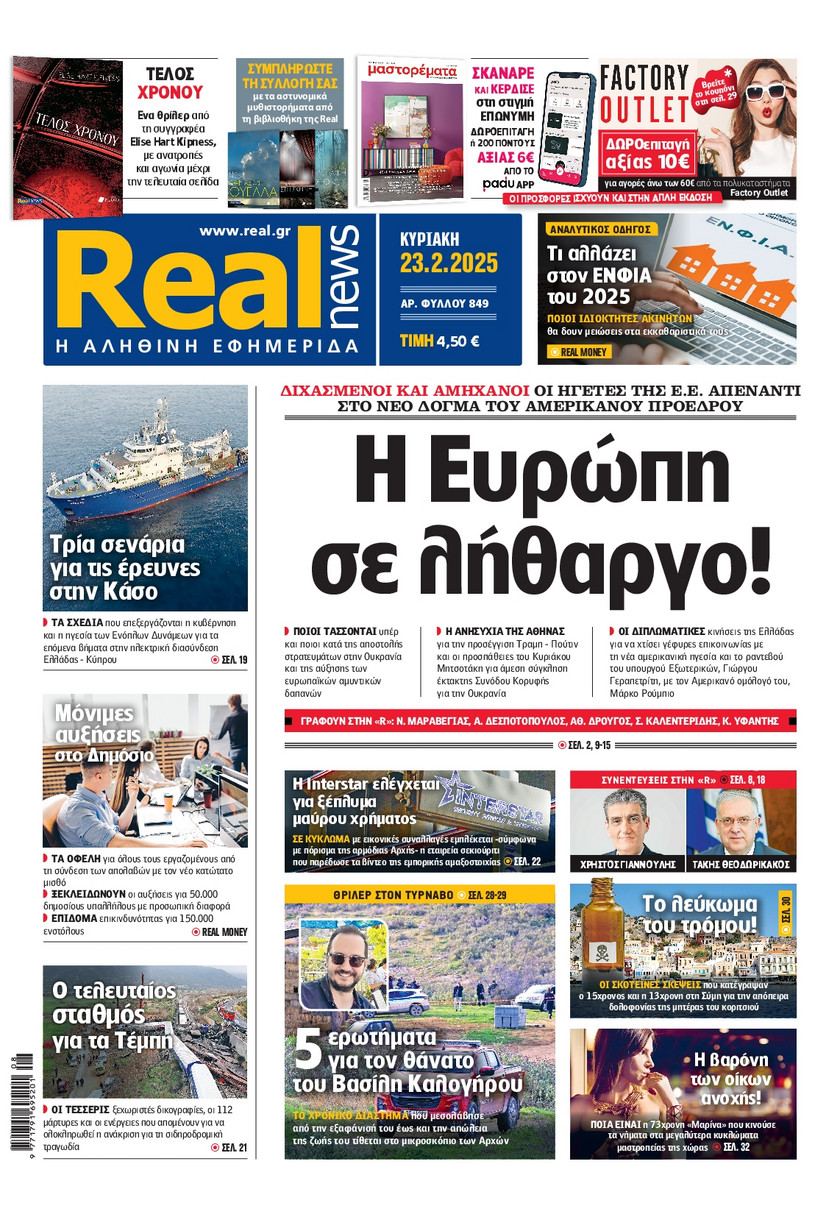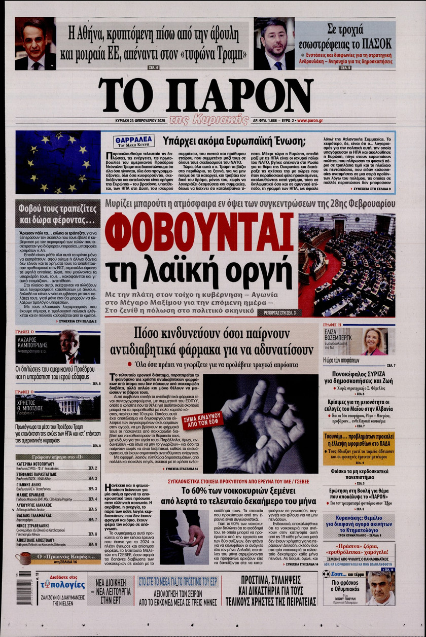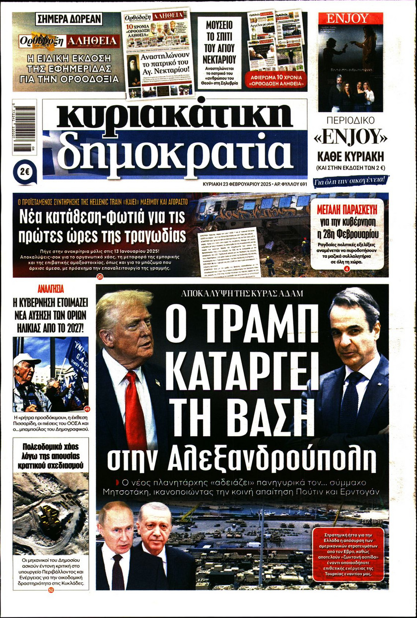 Η αμηχανία της Ευρώπης για την προσέγγιση Τραμπ-Πούτιν και τις κινήσεις του αμερικανού προέδρου να τελειώσει με τους δικούς του όρους τον πόλεμο στην Ουκρανία, η 28η Φεβρουαρίου όπου θα πραγματοποιηθούν τα μαζικά συλλαλητήρια για την τραγωδία των Τεμπών που έχει πυροδοτήσει τεράστια πολιτική κόντρα μεταξύ κυβέρνησης και αντιπολίτευσης, και τα αναπάντητα ερωτήματα για τον θάνατο του Βασίλη Καλογήρου ξεχωρίζουν στα πρωτοσέλιδα των κυριακάτικών εφημερίδων.