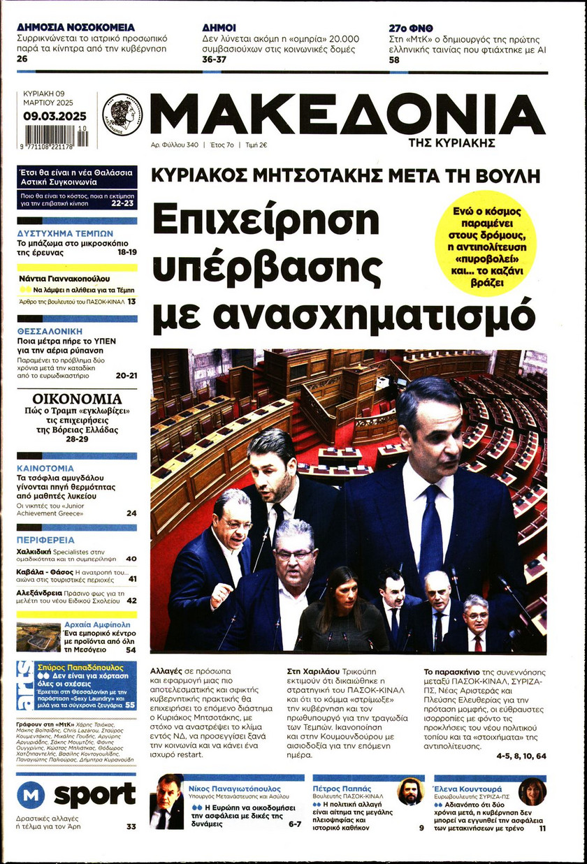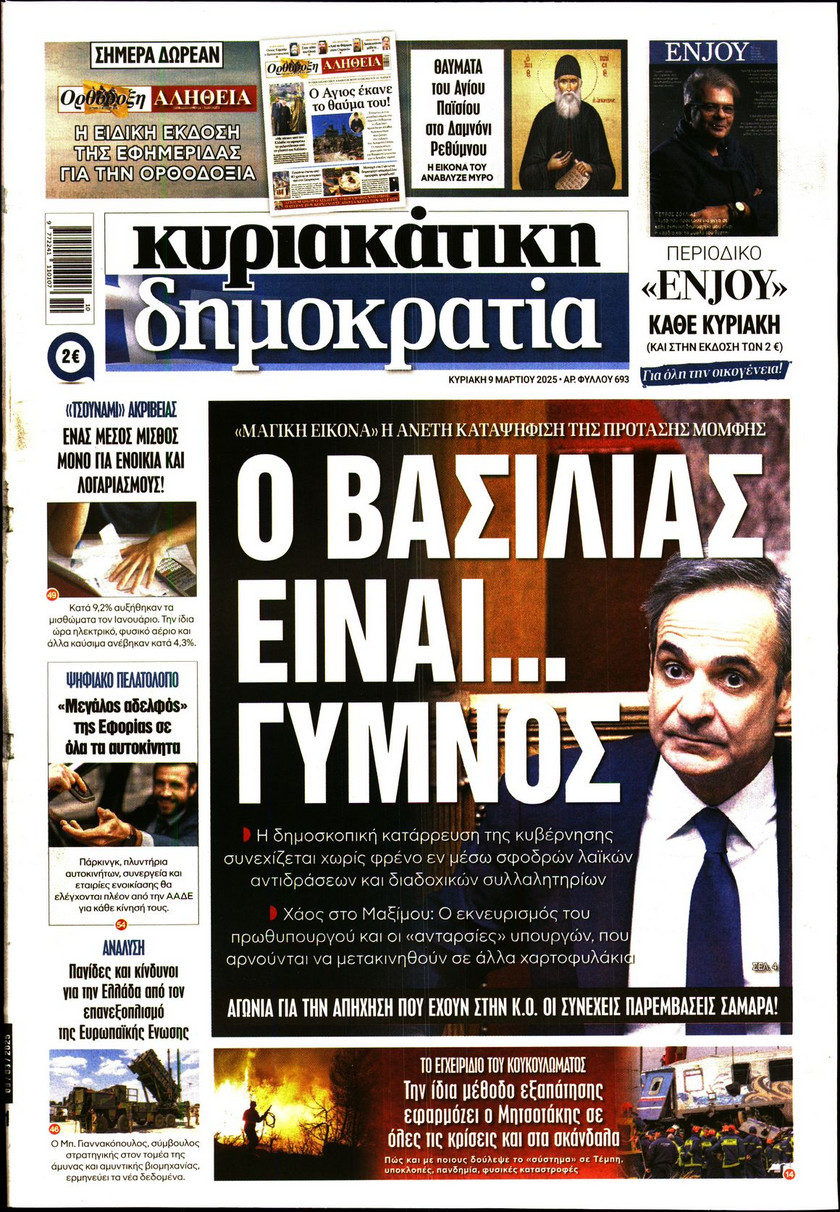 Ο επικείμενος ανασχηματισμός που ετοιμάζει ο πρωθυπουργός Κυριάκος Μητσοτάκης πουαναμένεται μέχρι την επόμενη Παρασκευή και όλα τα ονόματα που συζητούνται, οι δασμοί του Ντόναλντ Τραμπ σε Καναδά, Μεξικό και Κίνα αλλά και οι κινήσεις που κάνει ο αμερικανός πρόεδρος για να λήξει ο πόλεμος στην Ουκρανία, ο απόηχος των μεγαλειωδών συλλαλητηρίων για το δυστύχημα των Τεμπών και το «κούρεμα» στον φόρο εισοδήματος που σχεδιάζει το υπουργείο Οικονομικών ξεχωρίζουν στα πρωτοσέλιδα των κυριακάτικών εφημερίδων.