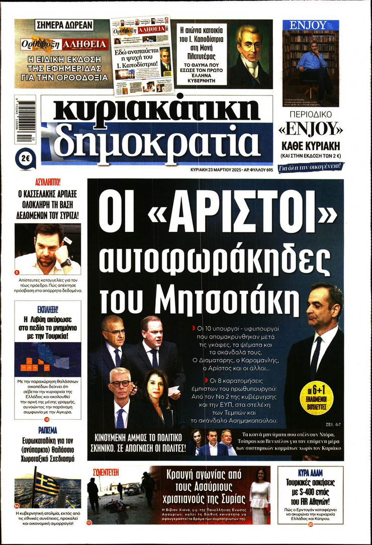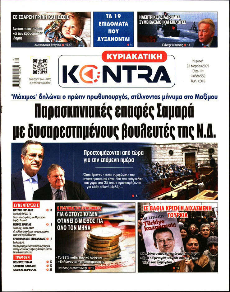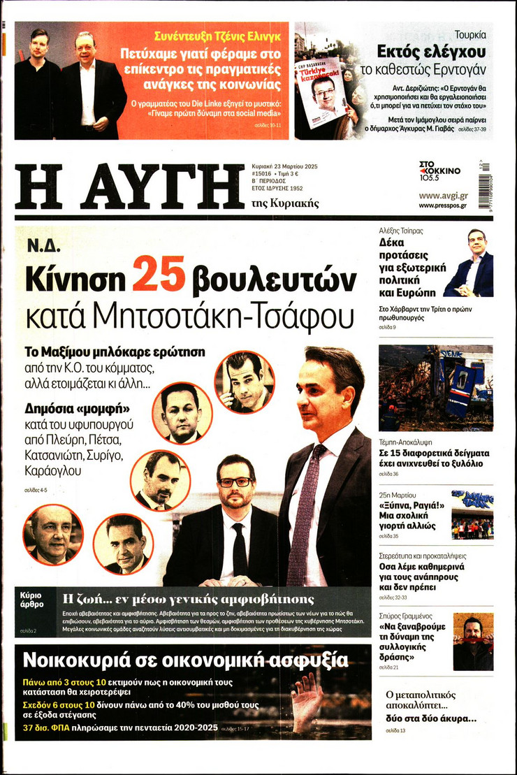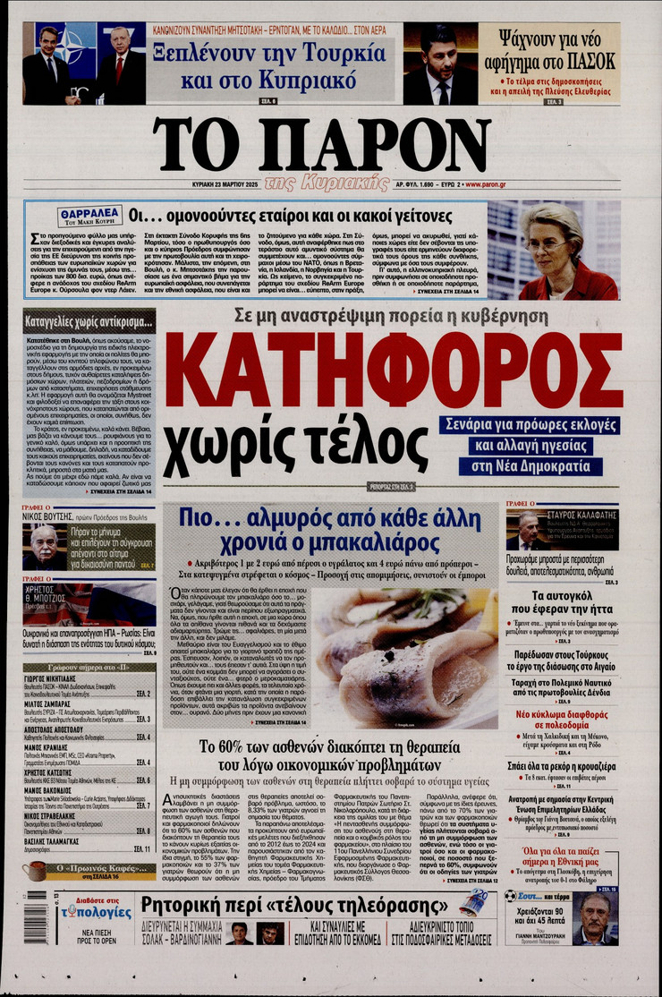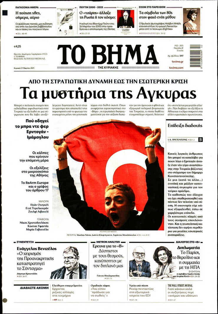 Ο πολιτικός σεισμός που εκδηλώθηκε στην Τουρκία μετά τη σύλληψη του Εκρέμ Ιμάμογλου ο οποίος είναι ο μεγάλος αντίπαλος του Ρετζέπ Ταγίπ Ερντογάν, η πολιτική της Ευρώπης που ακολουθώντας τα χνάρια του προέδρου των ΗΠΑ Ντόναλντ Τραμπ σκληραίνει τη στάση της στο μεταναστευτικό, το σχέδιο που εξετάζει το υπουργείο Οικονομικών για περαιτέρω ελαφρύνσεις των ιδιοκτητών ακινήτων και το νομοσχέδιο εξπρές που προβλέπει συγχώνευση ΟΣΕ, ΕΡΓΟΣΕ και ΓΑΙΟΣΕ σε μια εταιρεία (Σιδηρόδρομοι Α.Ε.) ξεχωρίζουν στα πρωτοσέλιδα των κυριακάτικών εφημερίδων.