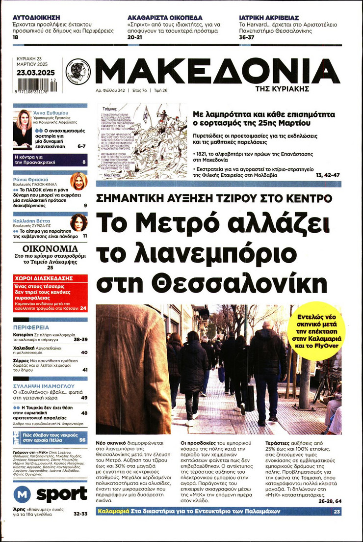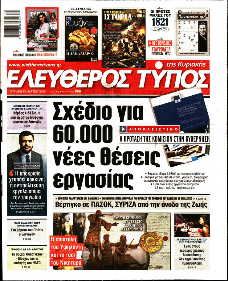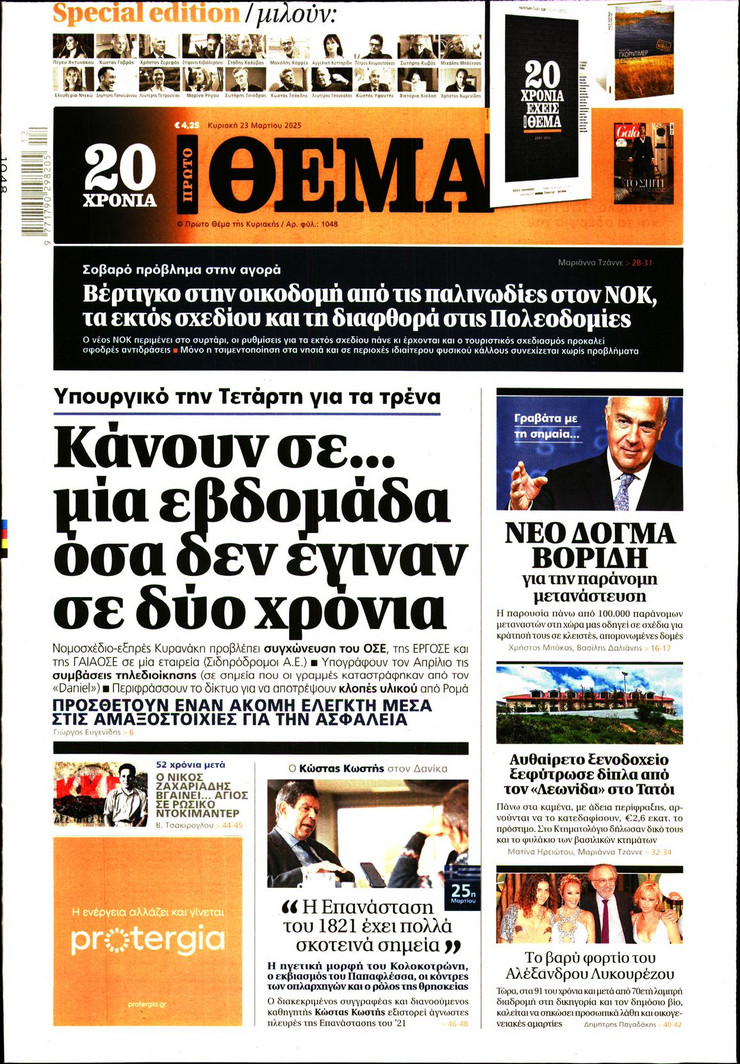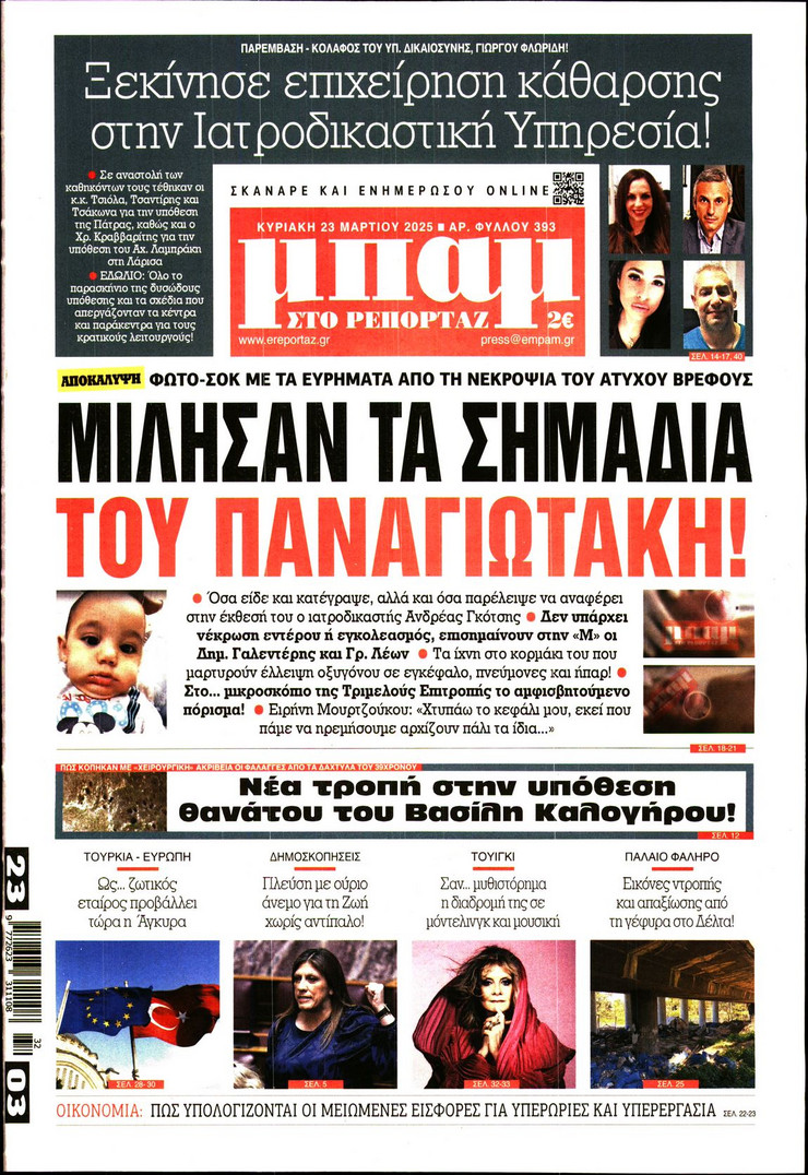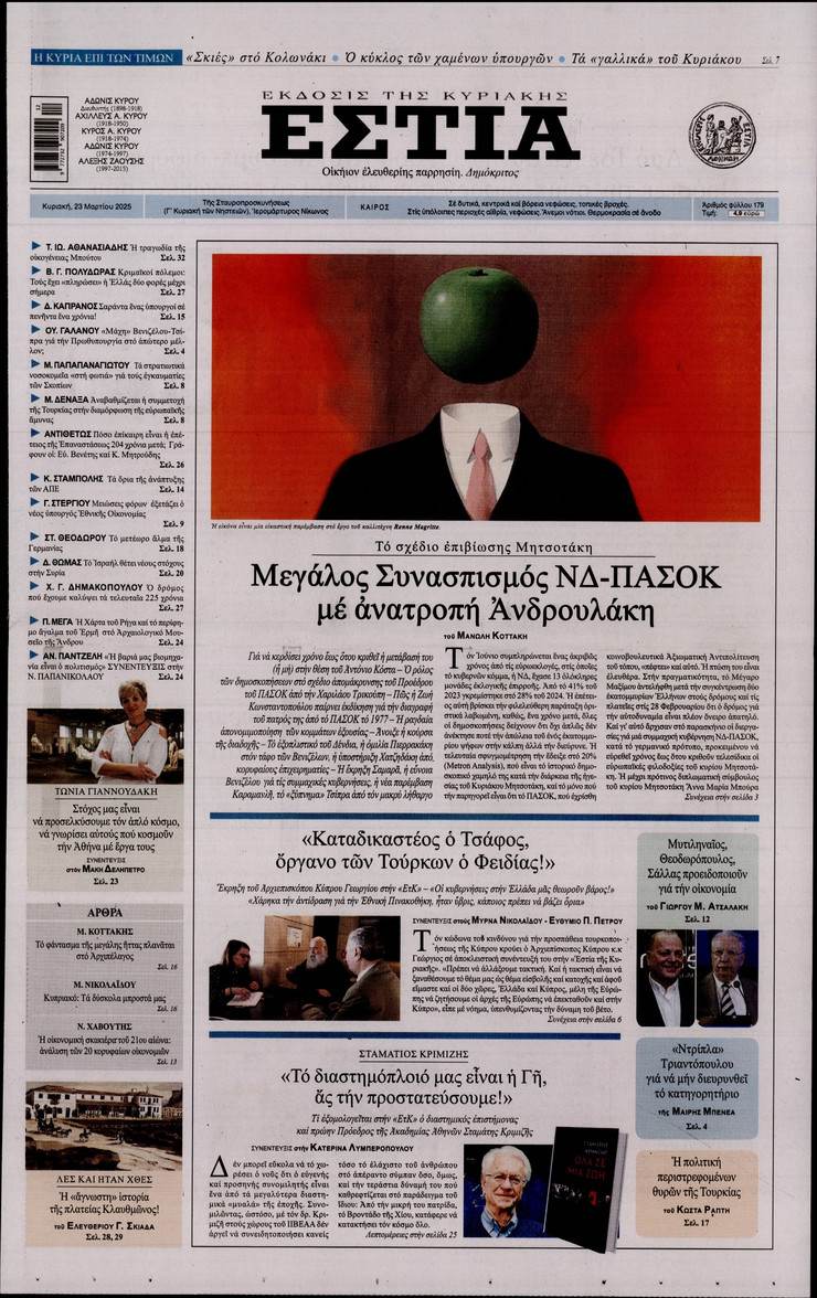 Ο πολιτικός σεισμός που εκδηλώθηκε στην Τουρκία μετά τη σύλληψη του Εκρέμ Ιμάμογλου ο οποίος είναι ο μεγάλος αντίπαλος του Ρετζέπ Ταγίπ Ερντογάν, η πολιτική της Ευρώπης που ακολουθώντας τα χνάρια του προέδρου των ΗΠΑ Ντόναλντ Τραμπ σκληραίνει τη στάση της στο μεταναστευτικό, το σχέδιο που εξετάζει το υπουργείο Οικονομικών για περαιτέρω ελαφρύνσεις των ιδιοκτητών ακινήτων και το νομοσχέδιο εξπρές που προβλέπει συγχώνευση ΟΣΕ, ΕΡΓΟΣΕ και ΓΑΙΟΣΕ σε μια εταιρεία (Σιδηρόδρομοι Α.Ε.) ξεχωρίζουν στα πρωτοσέλιδα των κυριακάτικών εφημερίδων.