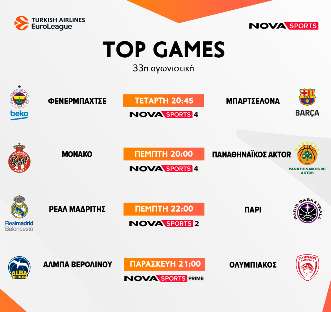 Η EuroLeague η κορυφαία ευρωπαϊκή διασυλλογική διοργάνωση στο χώρο του μπάσκετ, μπαίνει στην τελική ευθεία για την ολοκλήρωση της regular season και την κατάταξη των ομάδων εν όψει των Playoffs και οι συνδρομητές της Nova ετοιμάζονται να απολαύσουν τις αναμετρήσεις της 33ης και προτελευταίας αγωνιστικής Μονακό – Παναθηναϊκός AKTOR (3/4, 20:00) και Άλμπα Βερολίνου – Ολυμπιακός (4/4, 21:00) στο παρκέ του Novasports.