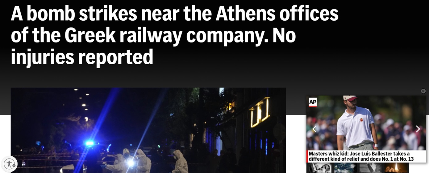 Αναλυτικότερα το AP αναφέρει στο ρεπορτάζ του: «Η έκρηξη έρχεται εν μέσω εκτεταμένης δημόσιας οργής για τη σιδηροδρομική καταστροφή του 2023, τη χειρότερη στην Ελλάδα, κατά την οποία 57 άνθρωποι σκοτώθηκαν και δεκάδες άλλοι τραυματίστηκαν όταν μια εμπορική αμαξοστοιχία και μια επιβατική αμαξοστοιχία που κατευθύνονταν προς αντίθετες κατευθύνσεις μπήκαν κατά λάθος στην ίδια γραμμή.