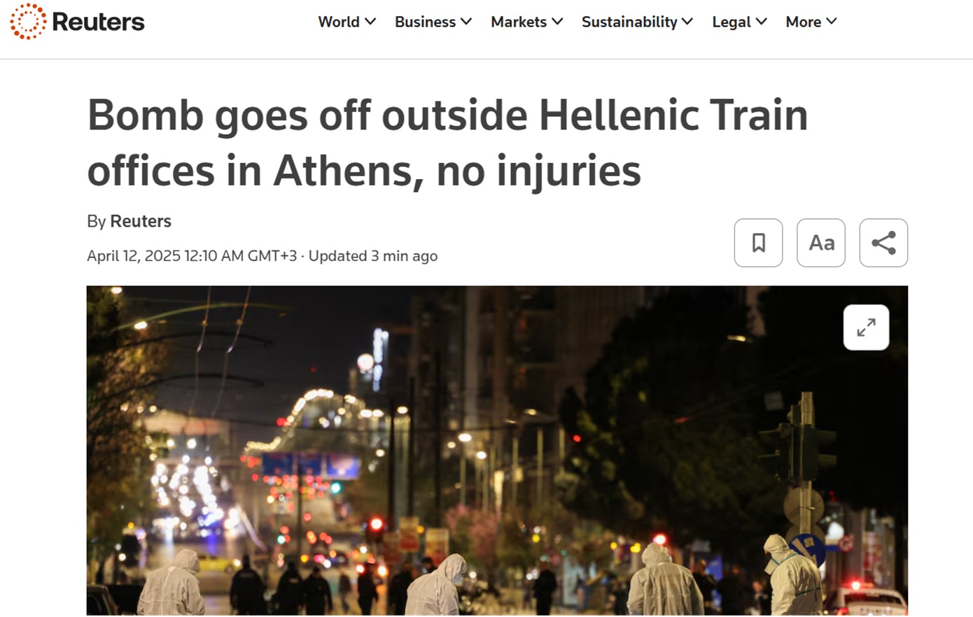 Αντίστοιχα το Reuters σημειώνει: «Έκρηξη σημειώθηκε έξω από τα γραφεία της Hellenic Train στην Αθήνα, ανακοίνωσε η ελληνική αστυνομία την Παρασκευή, προσθέτοντας ότι δεν υπήρξαν άμεσες αναφορές για τραυματισμούς. Η αστυνομία απέκλεισε την περιοχή αφού δύο ελληνικοί οργανισμοί μέσων ενημέρωσης έλαβαν προειδοποιητικά τηλεφωνήματα ότι ένας εκρηκτικός μηχανισμός θα εκραγεί εντός 35 λεπτών, δήλωσαν αξιωματούχοι της αστυνομίας. Μια ύποπτη τσάντα εντοπίστηκε έξω από το κτίριο, το οποίο εκκενώθηκε».