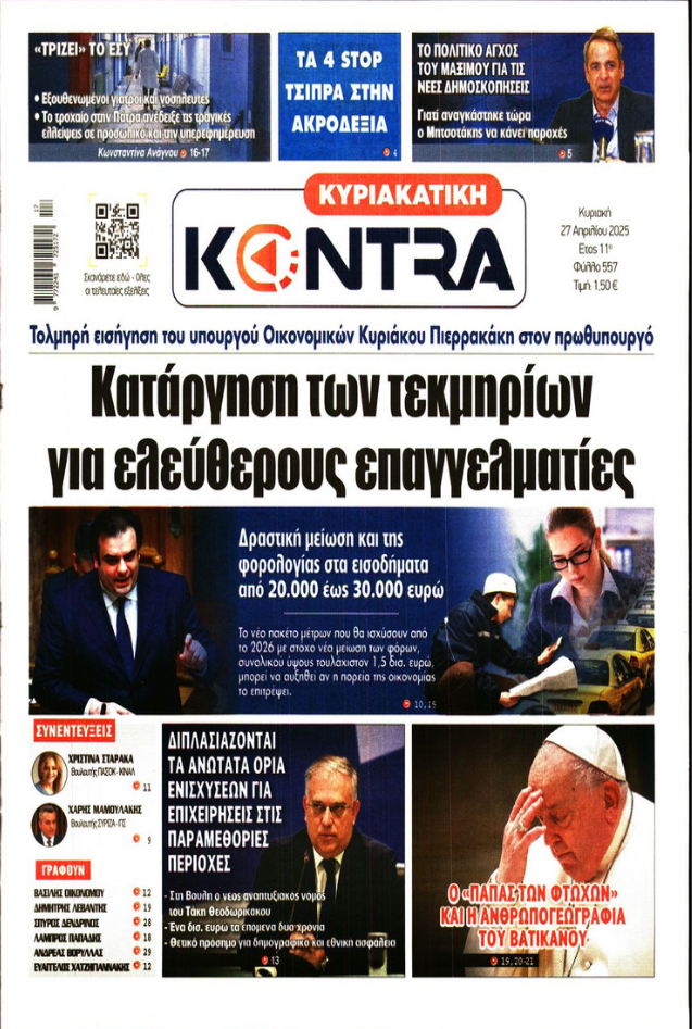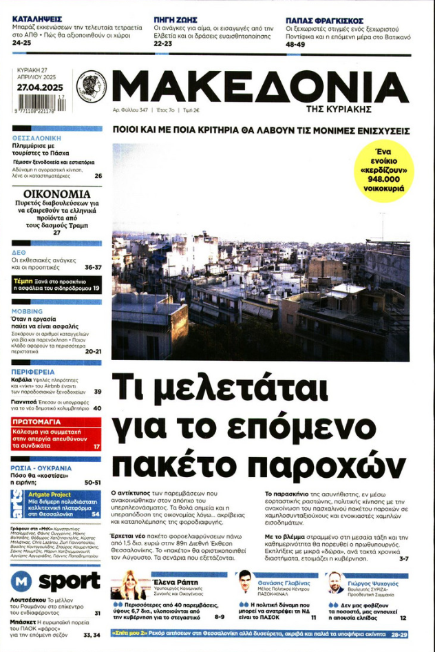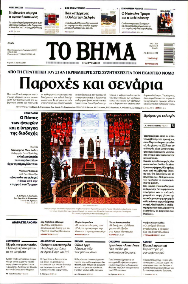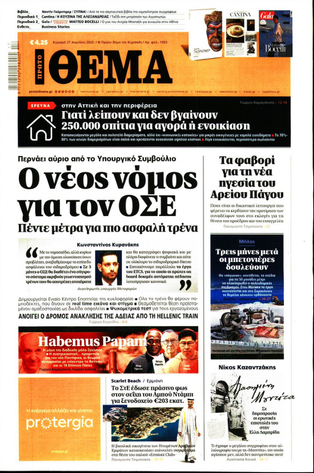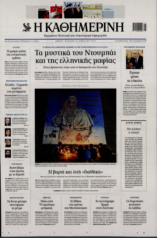 Το νέο νομοσχέδιο για τον ΟΣΕ, ο θάνατος του Πάπα Φραγκίσκου και οι ανακοινώσεις της κυβέρνησης για τα νέα μέτρα στήριξης ενοικιαστών, συνταξιούχων και ευάλωτων πολιτών ξεχωρίζουν στα πρωτοσέλιδα των κυριακάτικων εφημερίδων.