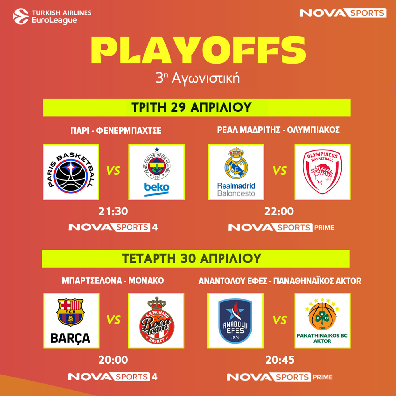 Υπενθυμίζεται ότι οι 4 ομάδες που θα προκριθούν από τη διαδικασία των Playοffs θα δώσουν ραντεβού στην Etihad Arena στο Άμπου Ντάμπι εκεί όπου θα διεξαχθεί 23-25 Μάϊου το φετινό Final Four της διοργάνωσης και θα καλυφθεί αποκλειστικά από τα κανάλια Novasports!