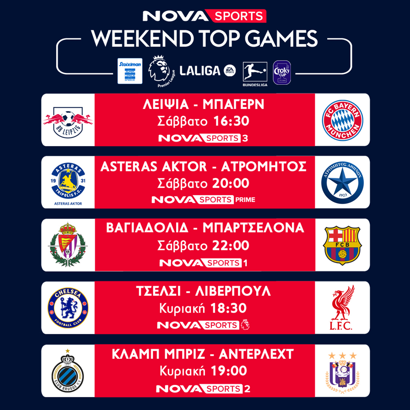 Πλούσια δράση έχουμε σε Eredivisie, Jupiler Pro League, 2.Bundesliga, LaLiga2 και φυσικά τον τελικό του Κυπέλλου Βελγίου Croky Cup, Κλαμπ Μπριζ – Άντερλεχτ στα κανάλια Novasports και Serie Α Sky Bet EFL Championship, Liga Portugal Betclic, στα κανάλια Cosmote Sport.