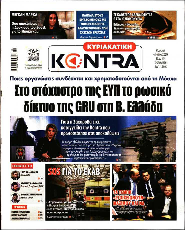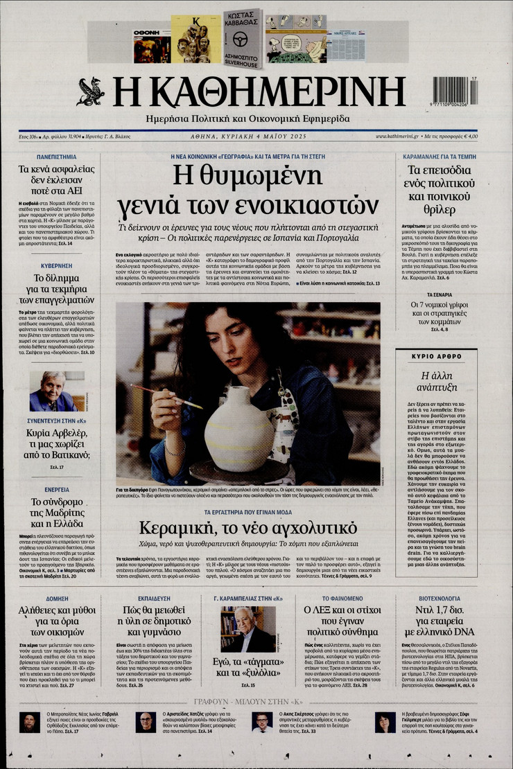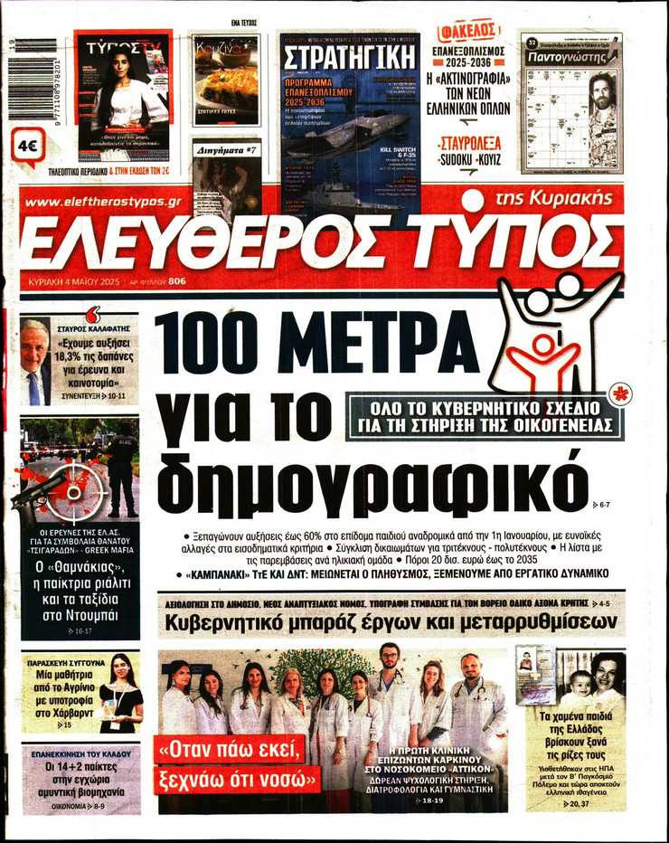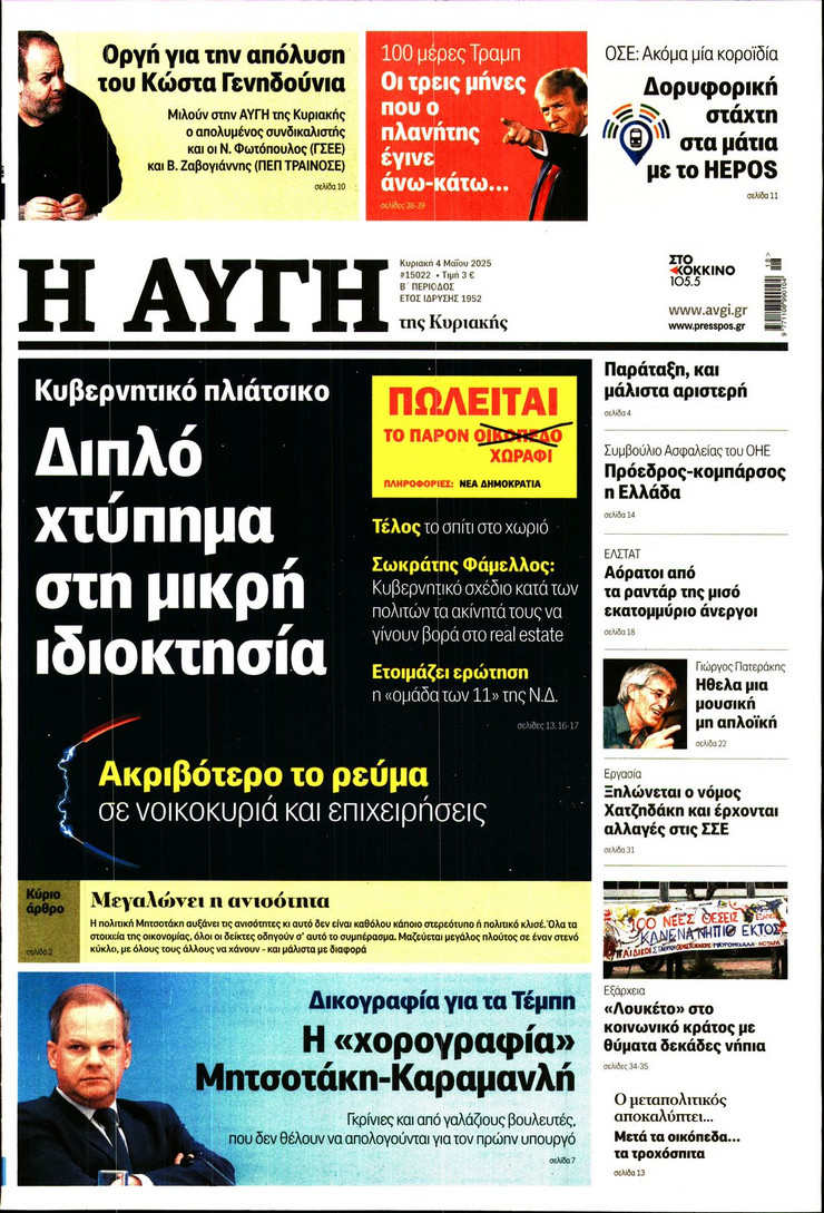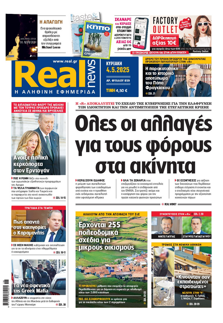 Όλο το σχέδιο της κυβέρνησης για την αντιμετώπιση του δημογραφικού. η έρευνα της ΕΥΠ για το ρωσικό δίκτυο GRU στην Βόρεια Ελλάδα, όλες οι αλλαγές για τους φόρους στα ακίνητα για την ελάφρυνση των ιδιοκτητών και την αντιμετώπιση της στεγαστικής κρίσης, το διπλωματικό «φλέρτ» Μελόνι με Ερντογάν που ανησυχεί Αθήνα και Βρυξέλλες και η νομοθετική ρύθμιση που θα φέρει η κυβέρνηση για το Nέο Οικοδομικό Κανονισμό ώστε να ξεπαγώσει την οικοδομικη δραστηριότητα ξεχωρίζουν στα πρωτοσέλιδα των κυριακάτικων εφημερίδων.
