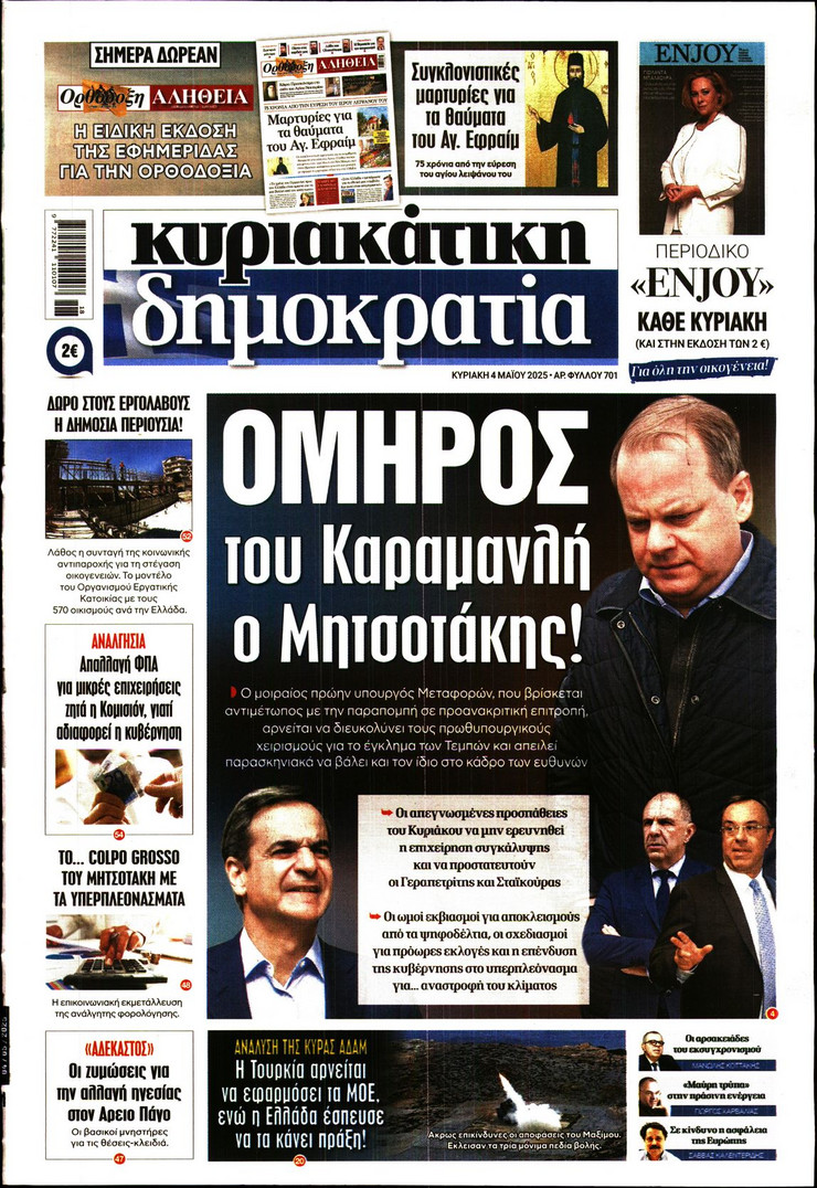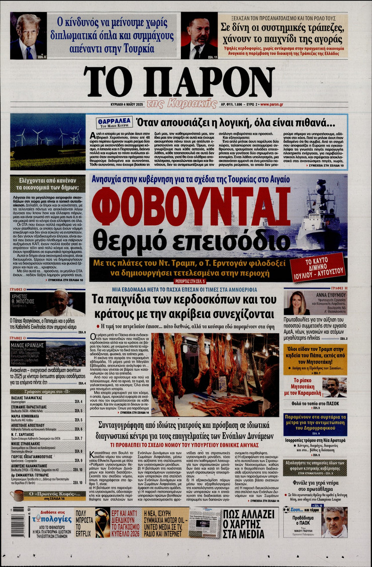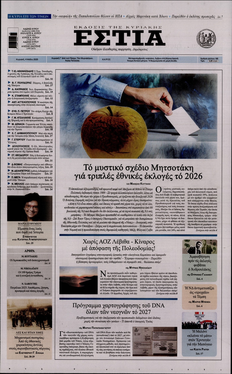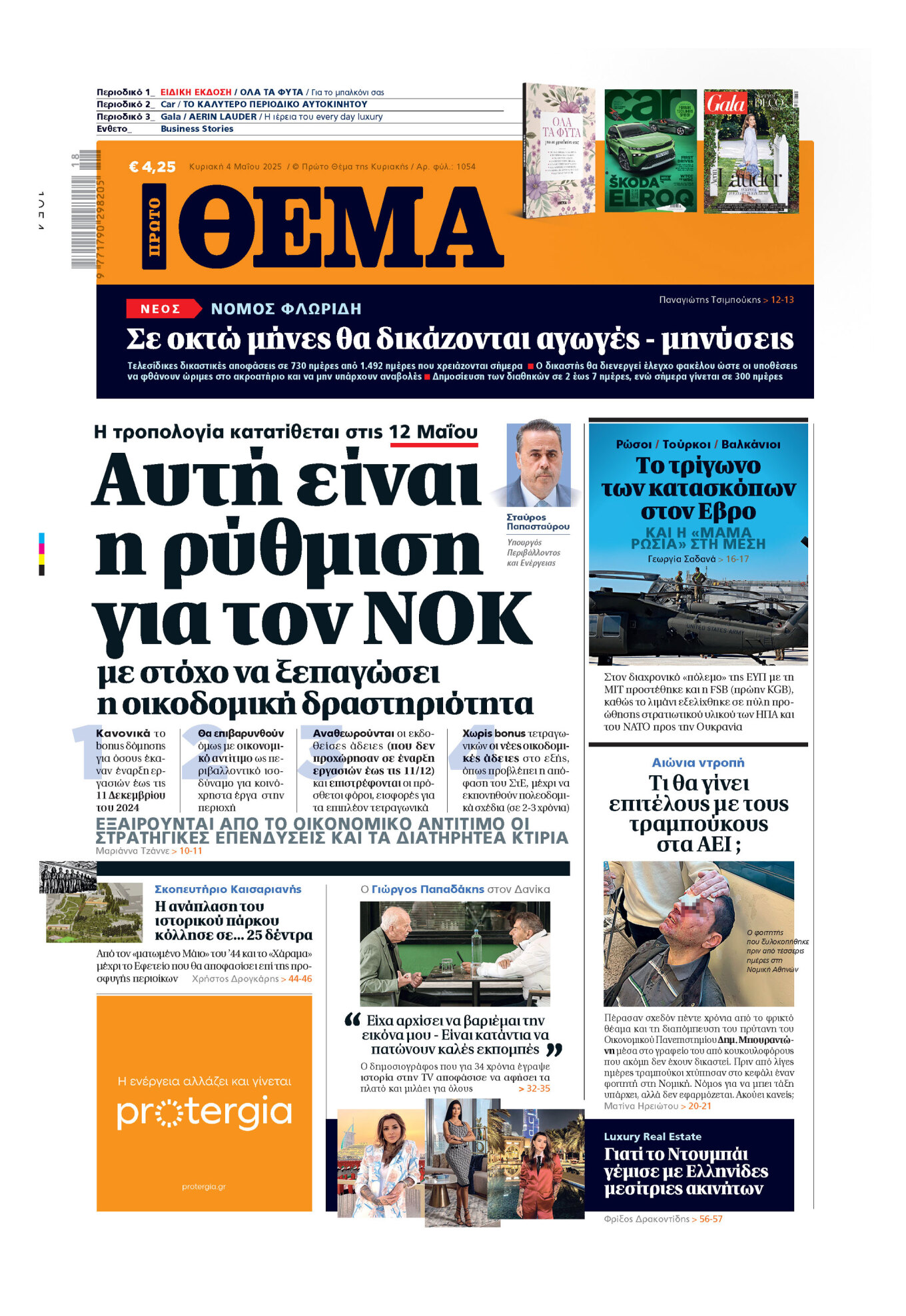 Όλο το σχέδιο της κυβέρνησης για την αντιμετώπιση του δημογραφικού. η έρευνα της ΕΥΠ για το ρωσικό δίκτυο GRU στην Βόρεια Ελλάδα, όλες οι αλλαγές για τους φόρους στα ακίνητα για την ελάφρυνση των ιδιοκτητών και την αντιμετώπιση της στεγαστικής κρίσης, το διπλωματικό «φλέρτ» Μελόνι με Ερντογάν που ανησυχεί Αθήνα και Βρυξέλλες και η νομοθετική ρύθμιση που θα φέρει η κυβέρνηση για το Nέο Οικοδομικό Κανονισμό ώστε να ξεπαγώσει την οικοδομικη δραστηριότητα ξεχωρίζουν στα πρωτοσέλιδα των κυριακάτικων εφημερίδων.