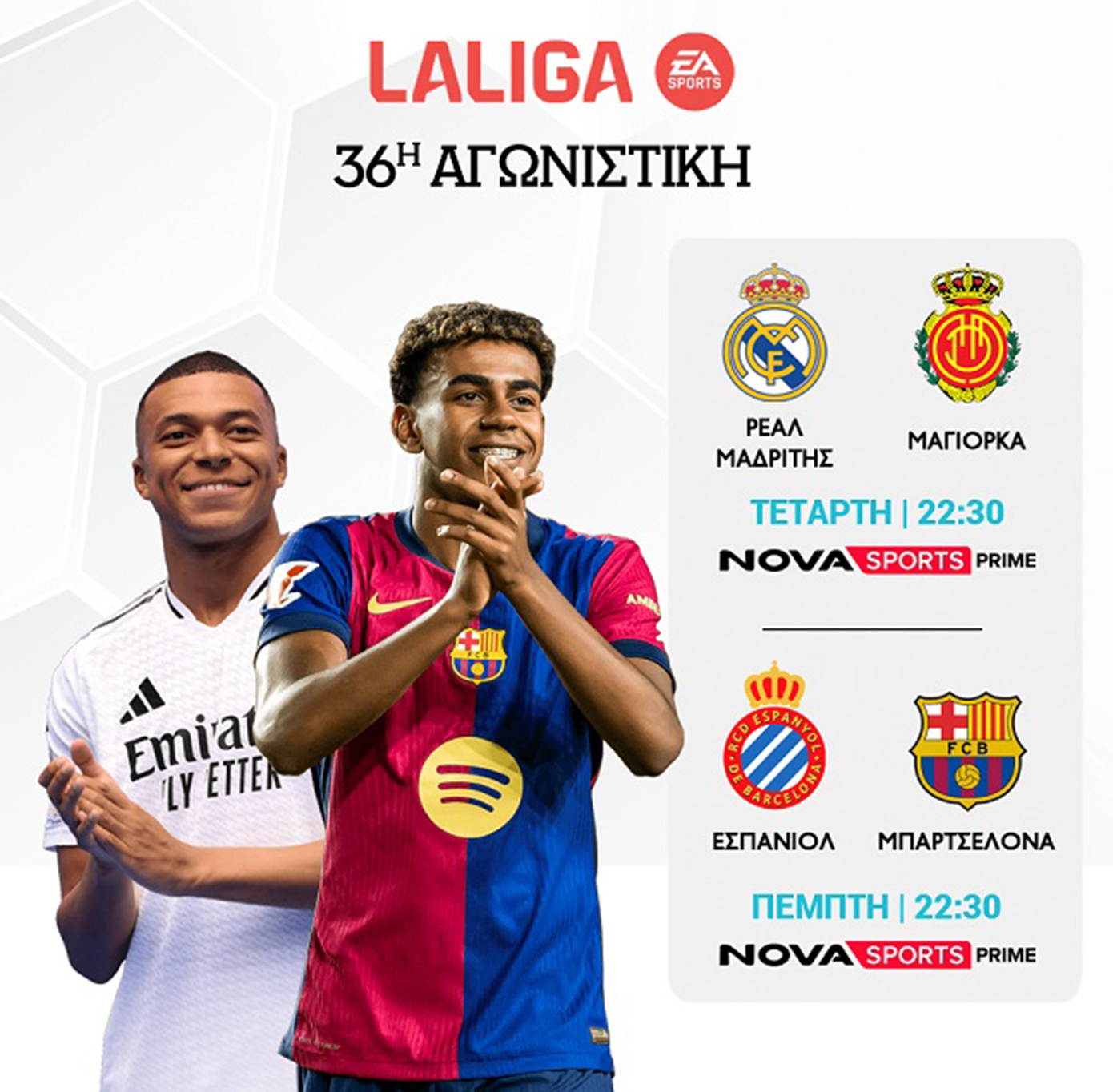 Η συναρπαστική La Liga στην Ισπανία συνεχίζεται στα κανάλια Novasports με διπλή αγωνιστική. Αρχικά το τριήμερο 13-15/5 θα διεξαχθεί η εμβόλιμη 36η αγωνιστική όπου δεσπόζουν οι αγώνες Εσπανιόλ – Μπαρτσελόνα (15/5, 22:30), Ρεάλ Μαδρίτης – Μαγιόρκα (14/5, 22:30) και Οσασούνα – Ατλέτικο Μαδρίτης (15/5, 20:00). Η συνέχεια είναι την Κυριακή 18/5 (20:00) όπου θα διεξαχθούν όλες οι αναμετρήσεις την ίδια ώρα θα προβληθούν LIVE σε παράλληλη μετάδοση από τα κανάλια Novasports. Ξεχωρίζουν οι αγώνες Μπαρτσελόνα – Βιγιαρεάλ, Σεβίλλη – Ρεάλ Μαδρίτης, Ατλέτικο Μαδρίτης – Μπέτις. Η Bundesliga ρίχνει αυλαία το Σάββατο 14/5 (16:30) για τη φετινή σεζόν με την 34η και τελευταία αγωνιστική όπου όλες οι αναμετρήσεις θα προβληθούν LIVE σε παράλληλη μετάδοση από τα κανάλια Novasports. Οι πιο σημαντικές αναμετρήσεις στην τελευταία αγωνιστική είναι Χοφενχάιμ-Μπάγερν, Μάιντς-Λεβερκούζεν και Λειψία-Στουτγκάρδη. Η εκπομπή «Matchday Live» με τον Ηλία Βλάχο μεταφέρει λεπτό προς λεπτό όλη την αθλητική δραστηριότητα από τη Bundesliga.