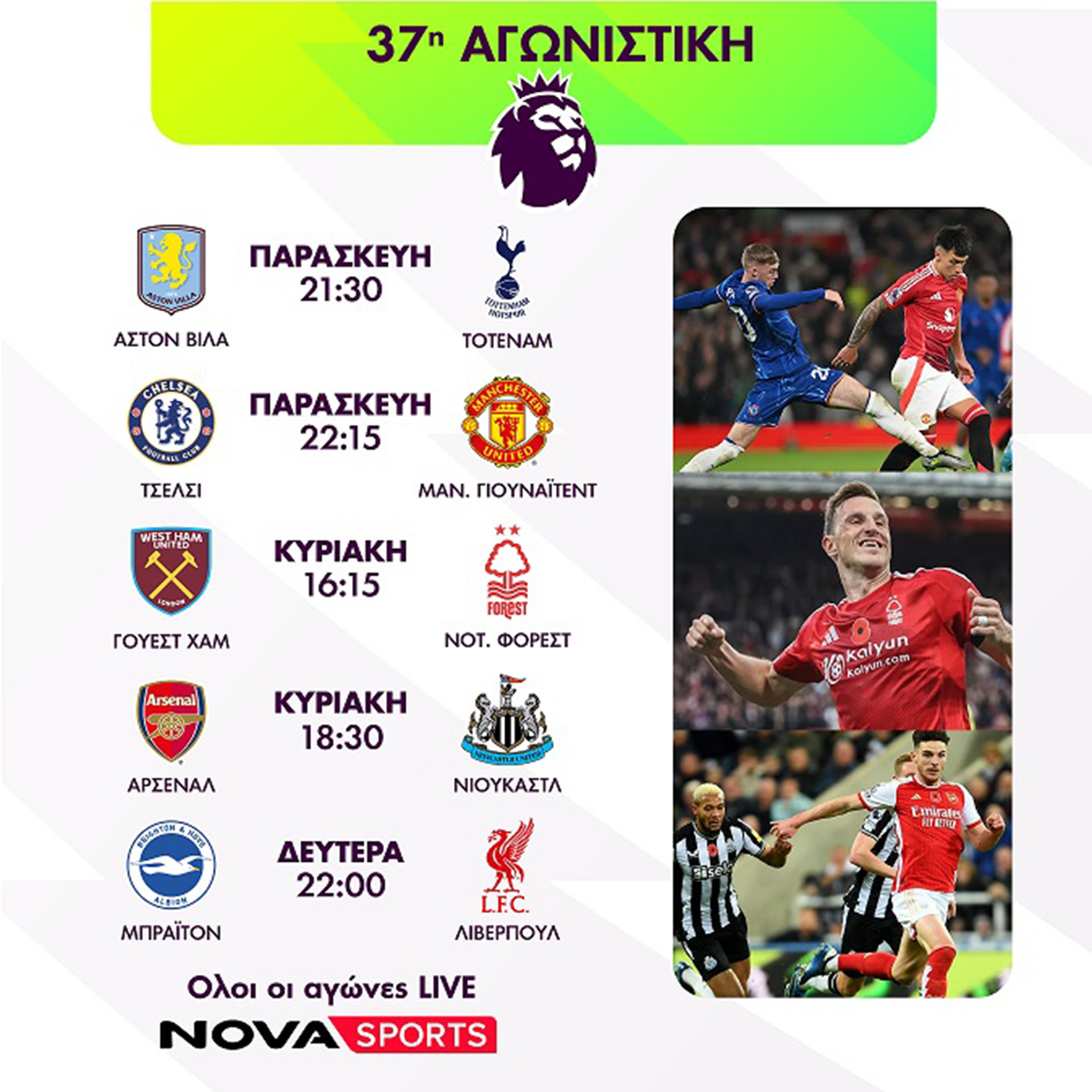 Η Premier League, το κορυφαίο πρωτάθλημα στον κόσμο και με τη φωνή του Χρήστου Σωτηρακόπουλου παίζει μπάλα στο γήπεδο των καναλιών Novasports και οι συνδρομητές θα απολαύσουν την 37η αγωνιστική η οποία θα ολοκληρωθεί την Τρίτη 20/5 με τα παιχνίδια Μάντσεστερ Σίτι-Μπόρνμουθ και Κρίσταλ Πάλας-Γουλβς. Η Μάντσεστερ Σίτι και η Κρίσταλ Πάλας αγωνίζονται στον τελικό του Κυπέλλου Αγγλίας το Σάββατο 17/5 για αυτό και οι εν λόγω αγώνες μεταφέρθηκαν στις 20/5. Από το πρόγραμμα ξεχωρίζουν οι αγώνες Τσέλσι – Μάντσεστερ Γιουνάιτεντ (16/5, 22:15), Άστον Βίλα – Τότεναμ (16/5, 21:30), Γουέστ Χαμ – Νότιγχαμ Φόρεστ (18/5, 16:15), Άρσεναλ – Νιουκάστλ (18/5, 18:30) και Μπράιτον – Λίβερπουλ (19/5, 22:00). Οι αγώνες θα πλαισιωθούν και από τις εκπομπές «Premier League Kick» Off και «Premier League The Show» με τους Άγγελο Στυλιάδη και Γιώργο Σαμαρά.