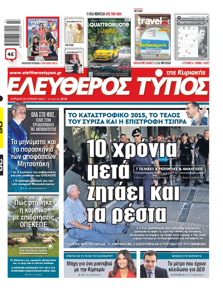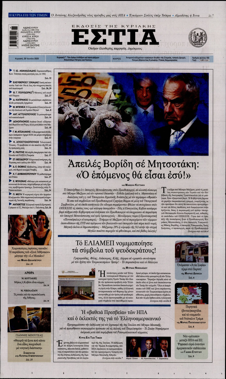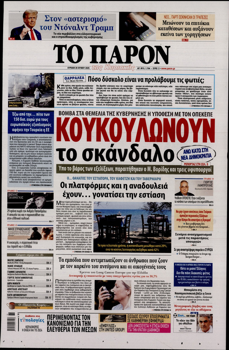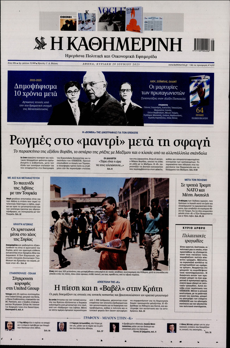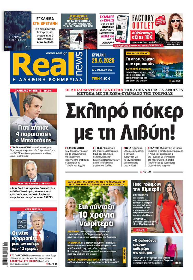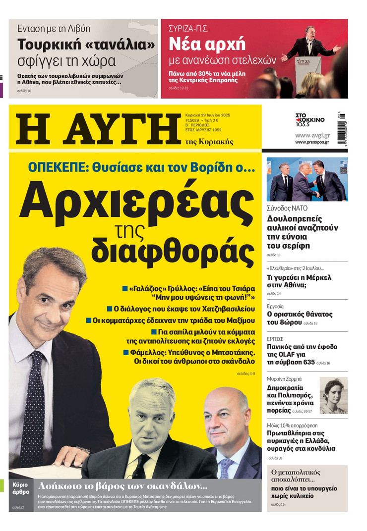 Η υπόθεση ΟΠΕΚΕΠΕ και οι επόμενες κινήσεις του πρωθυπουργού Κυριάκου Μητσοτάκη μετά και τις παραιτήσεις των 4 στελεχών της κυβέρνησης, η έκρηξη των μεταναστευτικών ροών από τη Λιβύη και η ισχυρή παρουσία του Ελληνικού Πολεμικού Ναυτικου στο Λιβικό Πέλαγος και οι νέες ισορροπίες που διαμορφώνονται στη Μέση Ανατολή μετά τον πόλεμο των 12 ημερών μεταξύ Ισραήλ και Ιράν ξεχωρίζουν στα πρωτοσέλιδα των κυριακάτικων εφημερίδων.
