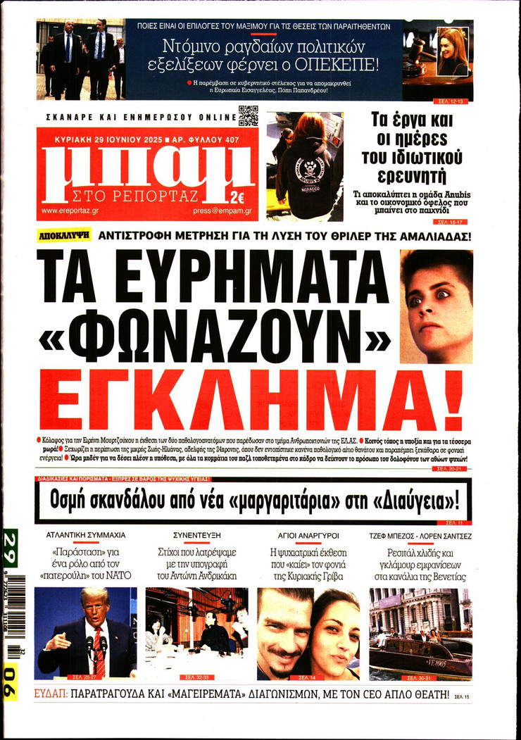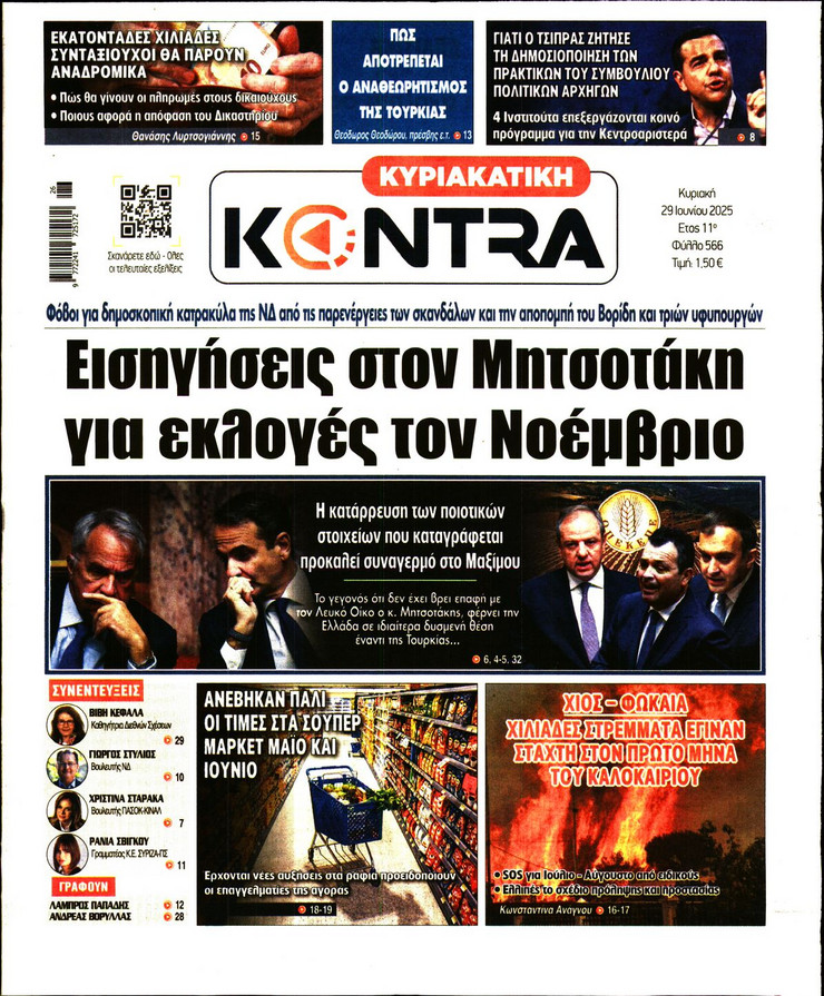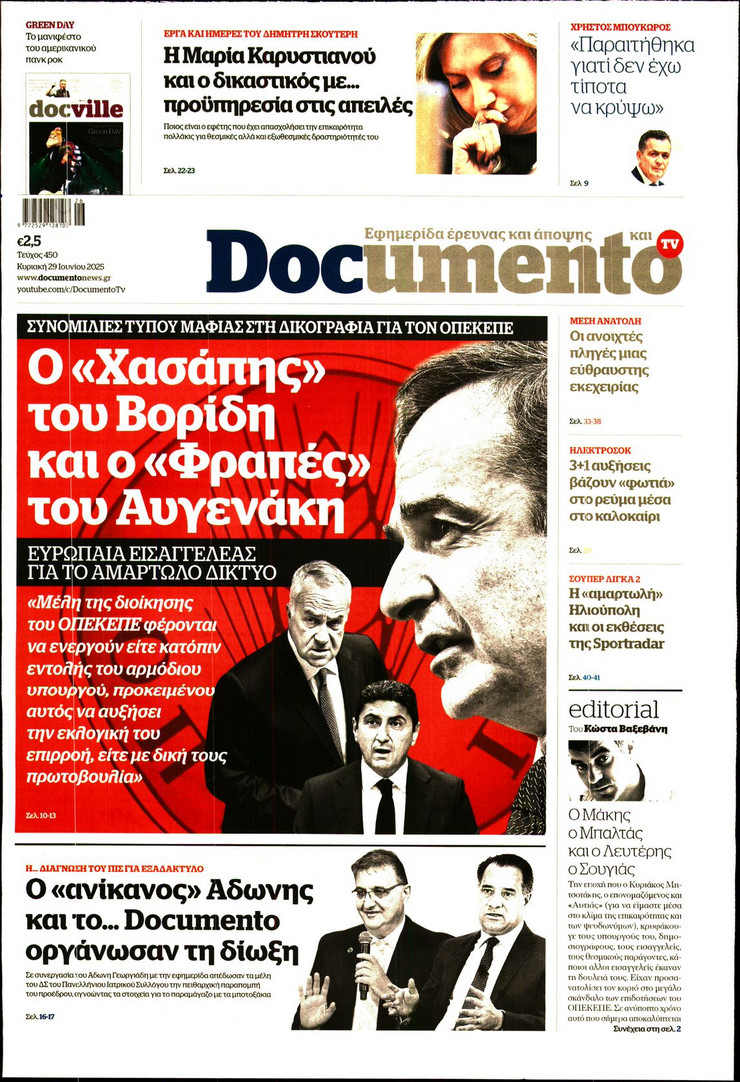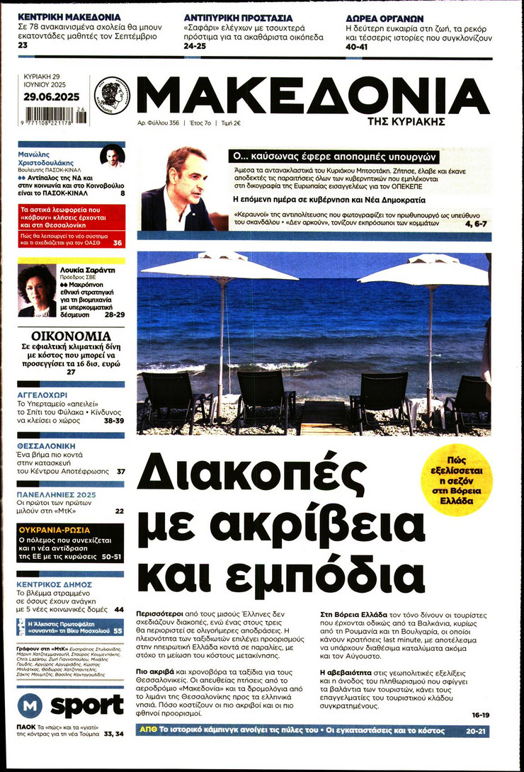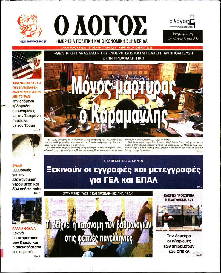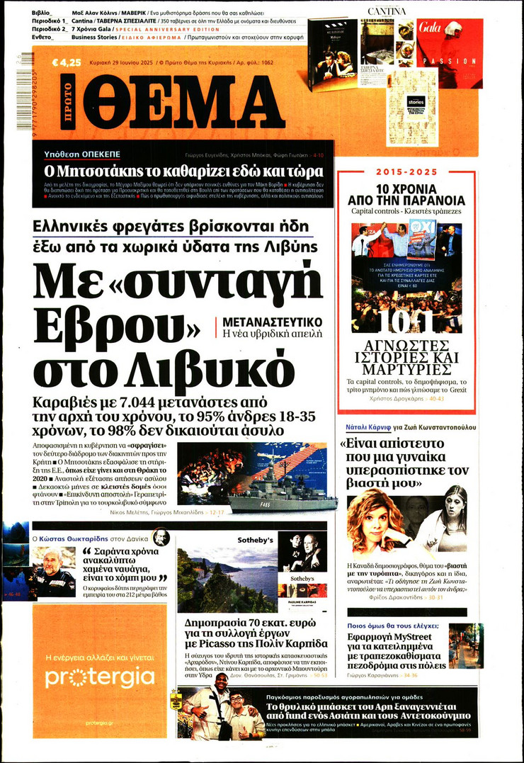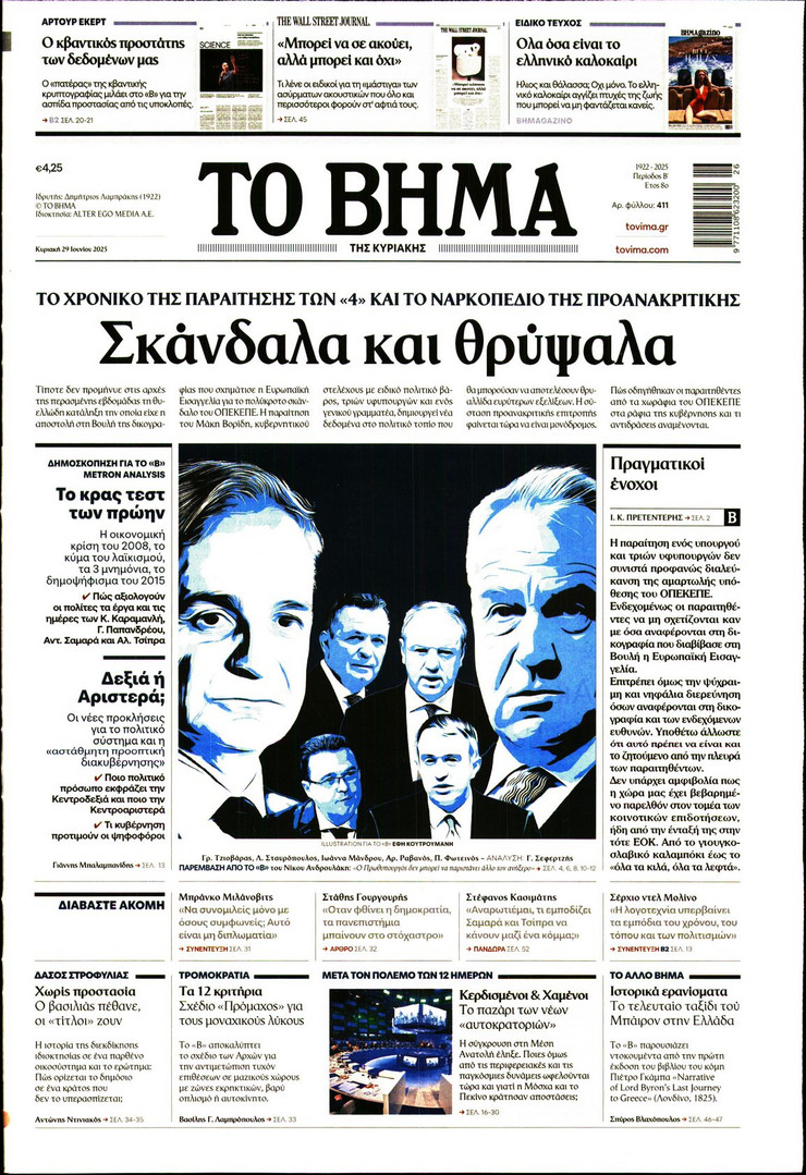 Η υπόθεση ΟΠΕΚΕΠΕ και οι επόμενες κινήσεις του πρωθυπουργού Κυριάκου Μητσοτάκη μετά και τις παραιτήσεις των 4 στελεχών της κυβέρνησης, η έκρηξη των μεταναστευτικών ροών από τη Λιβύη και η ισχυρή παρουσία του Ελληνικού Πολεμικού Ναυτικου στο Λιβικό Πέλαγος και οι νέες ισορροπίες που διαμορφώνονται στη Μέση Ανατολή μετά τον πόλεμο των 12 ημερών μεταξύ Ισραήλ και Ιράν ξεχωρίζουν στα πρωτοσέλιδα των κυριακάτικων εφημερίδων.