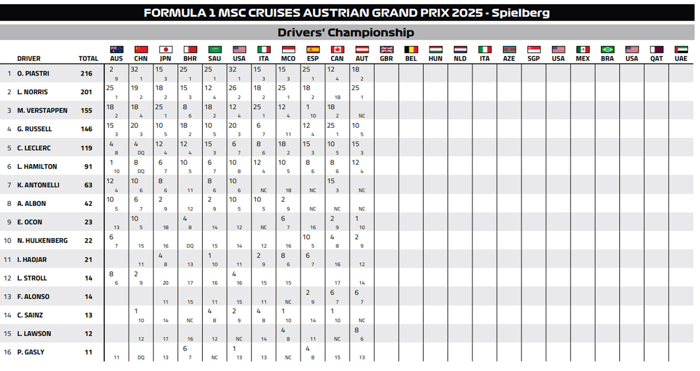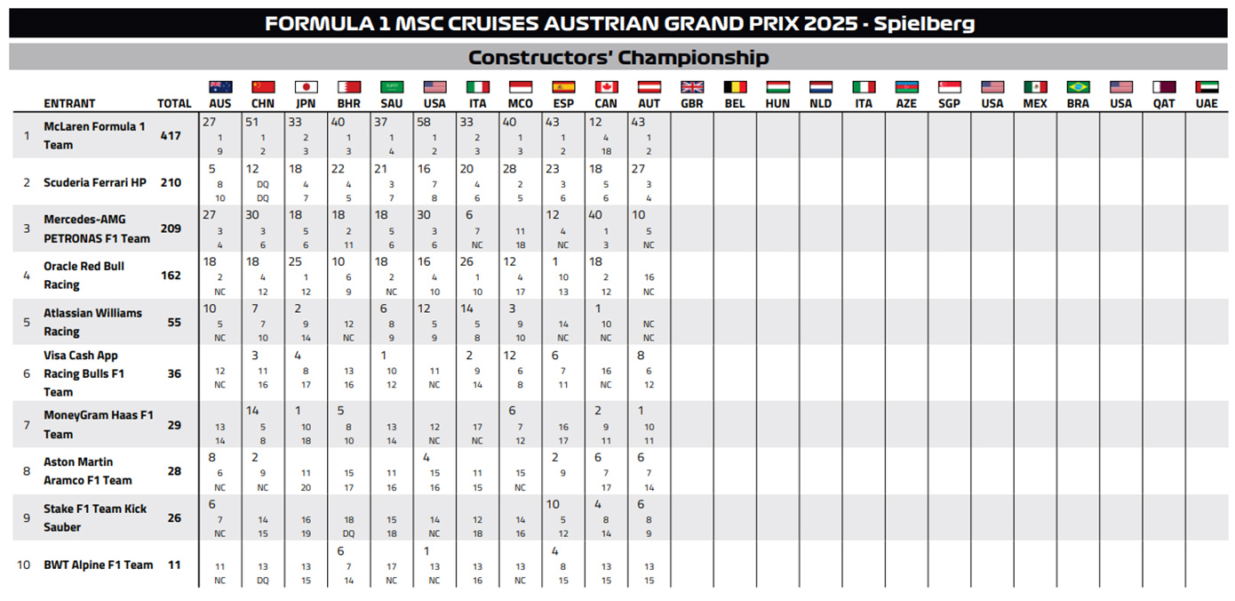 Μετά από 25 χρόνια, η McLaren κατέκτησε και πάλι τη νίκη και τη 2η θέση σε Grand Prix, πετυχαίνοντας ένα εντυπωσιακό «1-2» στην Αυστρία. Η τελευταία φορά που είχε συμβεί αυτό ήταν το 2000, όταν οι Μίκα Χάκινεν και Ντέιβιντ Κούλθαρντ είχαν τερματίσει στις δύο πρώτες θέσεις του αγώνα. Αυτή τη φορά, ο Λάντο Νόρις ήταν ο μεγάλος νικητής στο Σπίλμπεργκ, εξασφαλίζοντας την έβδομη νίκη της καριέρας του και την τρίτη για τη φετινή σεζόν. Δεύτερος, τερμάτισε ο Όσκαρ Πιάστρι, μετά από μία συναρπαστική εσωτερική μονομαχία. Οι δύο οδηγοί της McLaren έδωσαν μάχη για την πρωτοπορία, με τον Πιάστρι να παίρνει προσωρινά το προβάδισμα στα φρένα της στροφής 3. Ο Νόρις απάντησε αμέσως και ανέκτησε τη θέση του στην επόμενη στροφή. Η ομάδα αποφάσισε να παρέμβει, όταν ο Πιάστρι επιχείρησε εκ νέου να περάσει στα φρένα της στροφής 4, αλλά ένα μπλοκάρισμα του μπροστινού τροχού τον έφερε πολύ κοντά σε μία επικίνδυνη επαφή με τον Βρετανό οδηγό. Από εκείνο το σημείο, οι δύο οδηγοί διατήρησαν τις θέσεις τους, εξασφαλίζοντας ένα ιδανικό αποτέλεσμα για τη McLaren.Το βάθρο συμπλήρωσε ο Σαρλ Λεκλέρ με τη Ferrari. Η νίκη αυτή ήταν η 197η στην ιστορία της McLaren στη Formula 1, η 8η για την ομάδα στη φετινή σεζόν και η 7η σε αυτή την πίστα. Το Σπίλμπεργκ φαίνεται πως αποτελεί την αγαπημένη πίστα του Λάντο Νόρις, ο οποίος έχει πλέον μία νίκη, μία pole position, τρεις παρουσίες στο βάθρο και συνολικά 108 βαθμούς σε εννέα εκκινήσεις.