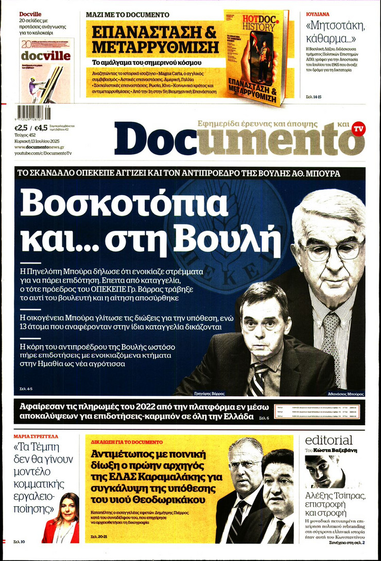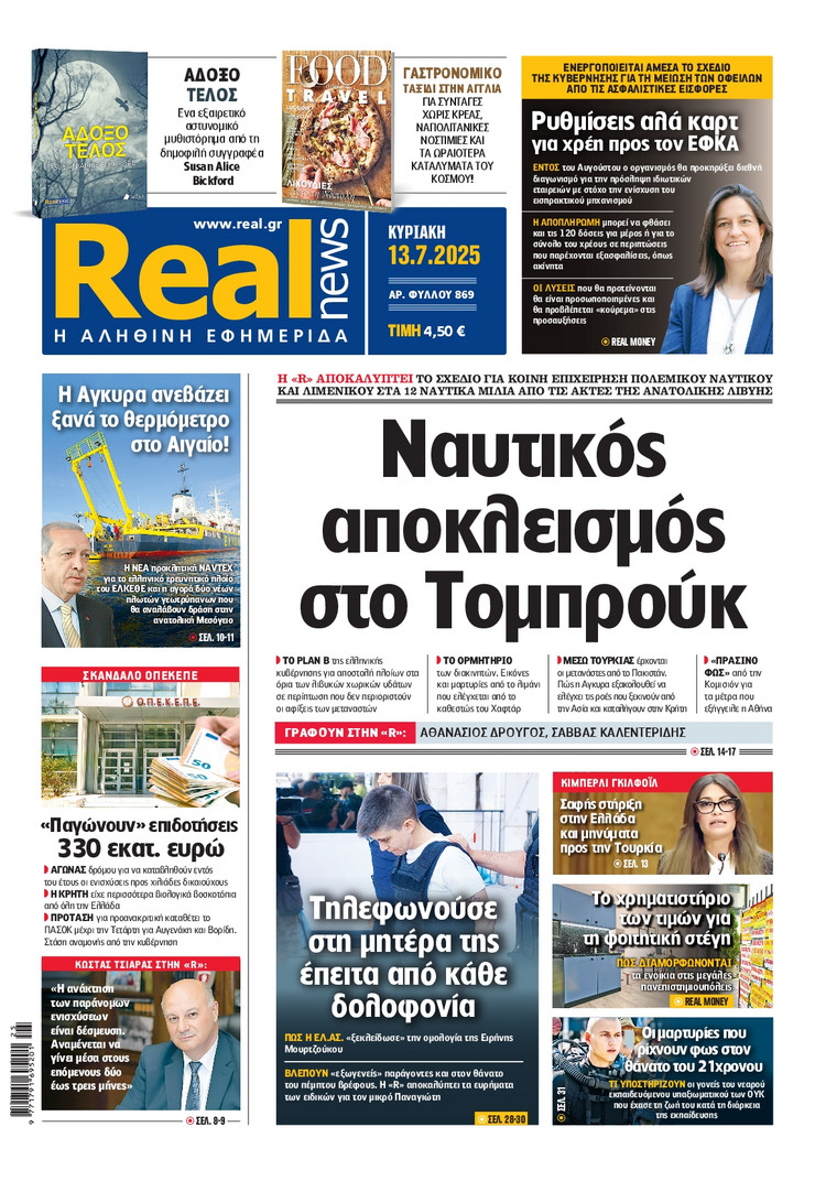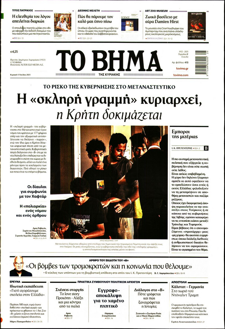 Η «σκληρή γραμμή» της κυβέρνησης στο μεταναστευτικό που έγινε νόμος του κράτους την ίδια ώρα που η Κρήτη συνεχίζει να δέχεται ασφυκτική πίεση από τις μεταναστευτικές ροές, η υπόθεση ΟΠΕΚΕΠΕ με την πρόταση για ανακριτική που θα καταθέσει το ΠΑΣΟΚ για Αυγενάκη και Βορίδη και η συγκλονιστική υπόθεση της Ειρήνης Μουρτζούκου που μετά από μήνες τηλεοπτικών εκπομπών παραδέχτηκε τέσσερις δολοφονίες ξεχωρίζουν στα πρωτοσέλιδα των κυριακάτικων εφημερίδων.