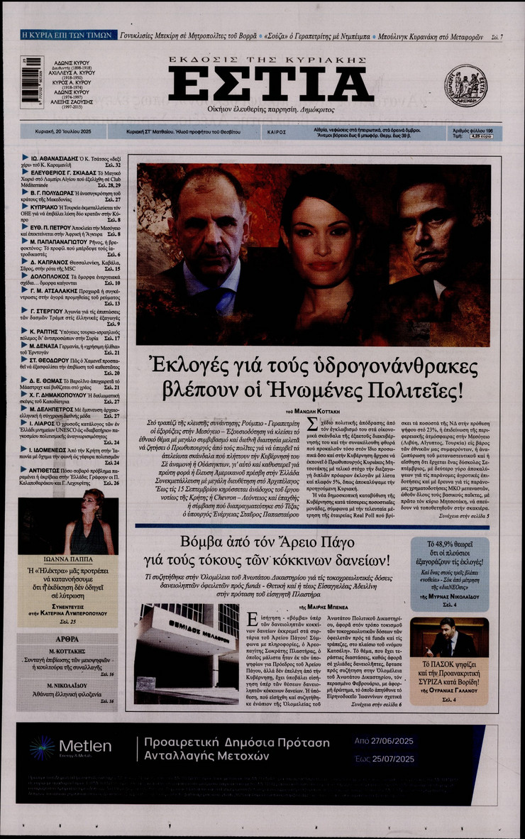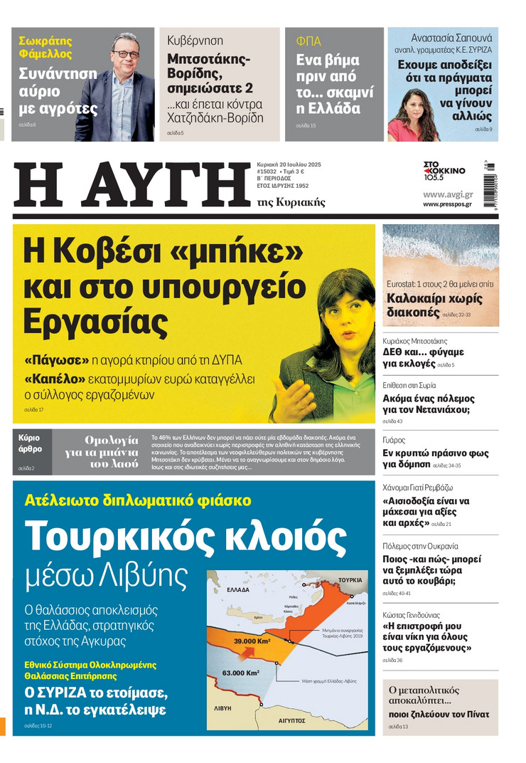 Τα συνεχιζόμενα τουρκολιβυκά παιχνίδια που προσπαθούν να αποδομήσουν όλες τις ελληνικές πρωτοβουλίες των 15 τελευταίων ετών στο θέμα των θαλάσσιων ζωνών, οι παρεμβάσεις που ετοιμάζει το οικονομικό επιτελείο της κυβέρνησης στην φορολογία των εισοδημάτων από τα ενοίκια ώστε να «πέσουν περισσότερα ακίνητα στην αγορά, και οι αλλαγές που προωθούνται για να καταργηθεί κάθε δυνατότητα νομιμοποίησης παράνομων μεταναστών, ξεχωρίζουν στα πρωτοσέλιδα των κυριακάτικων εφημερίδων.