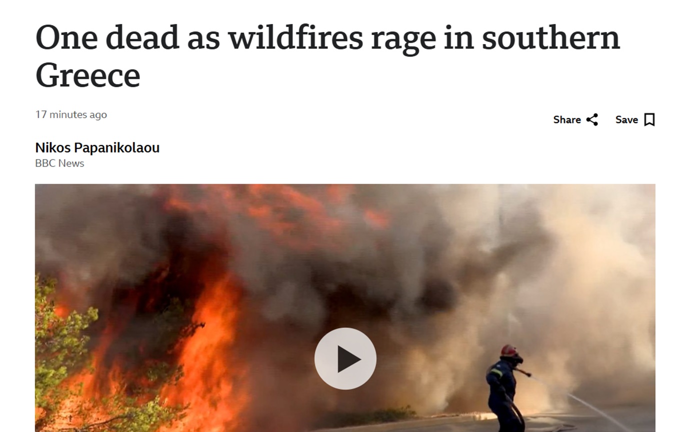 Ένας άνθρωπος έχασε τη ζωή του μετά από μια μεγάλη πυρκαγιά στην Κερατεία, νοτιοανατολικά της Αθήνας, η οποία εξαπλώθηκε γρήγορα, καταστρέφοντας σπίτια και προκαλώντας συναγερμούς εκκένωσης, αναφέρει το BBC.