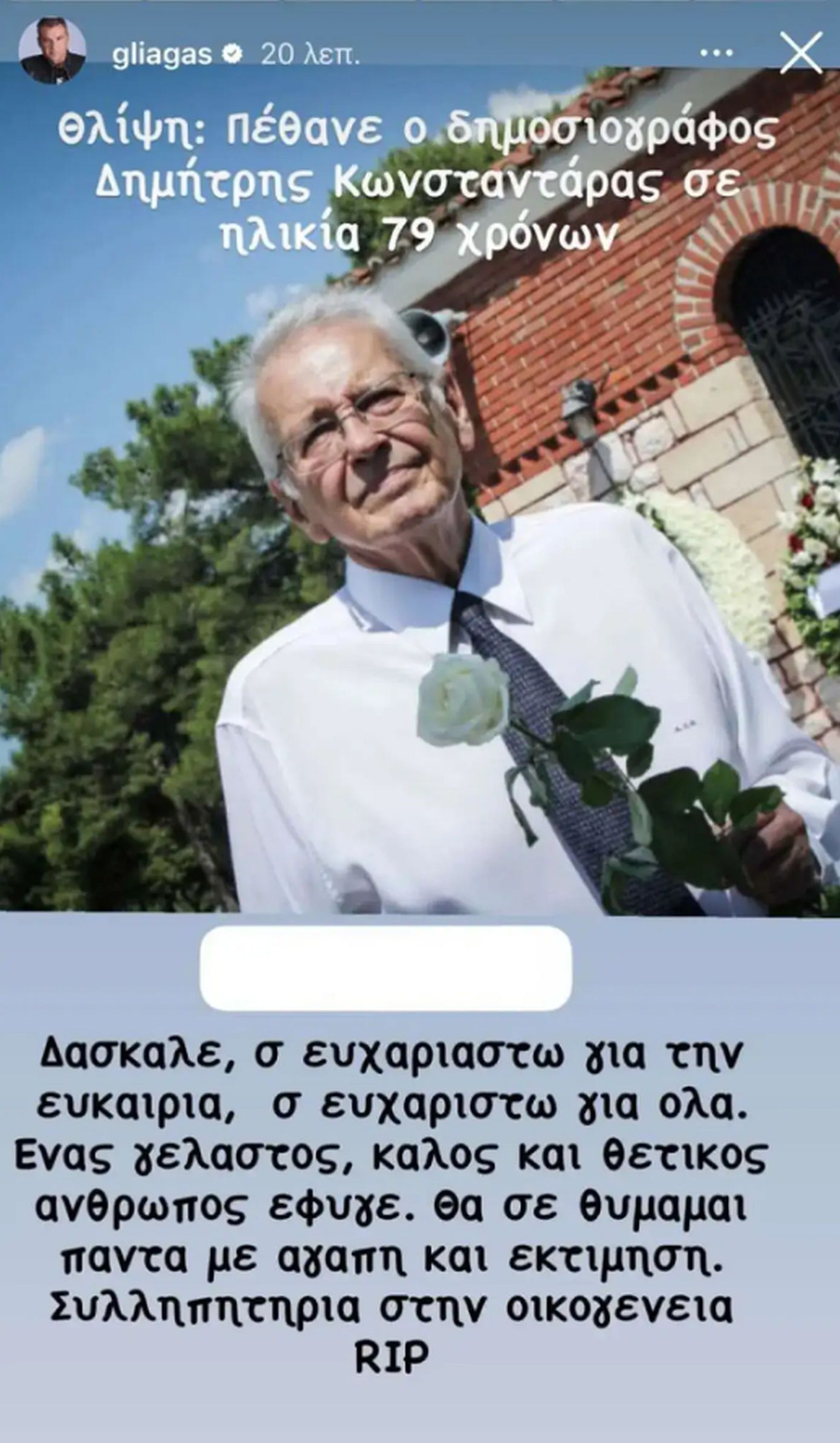 Ο Δημήτρης Κωνσταντάρας υπήρξε δάσκαλος για πολλούς δημοσιογράφους, ένας από τους οποίος ήταν και ο Γιώργος Λιάγκας. Στο άκουσμα της θλιβερής είδησης για τον θάνατο του δημοσιογράφου και πολιτικού, ο παρουσιαστής του ΑΝΤ1 θέλησε να γράψει στα social media το δικό του αντίο στον άνθρωπο που τον επηρέασε και τον καθοδήγησε στη δουλειά.