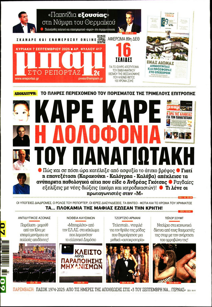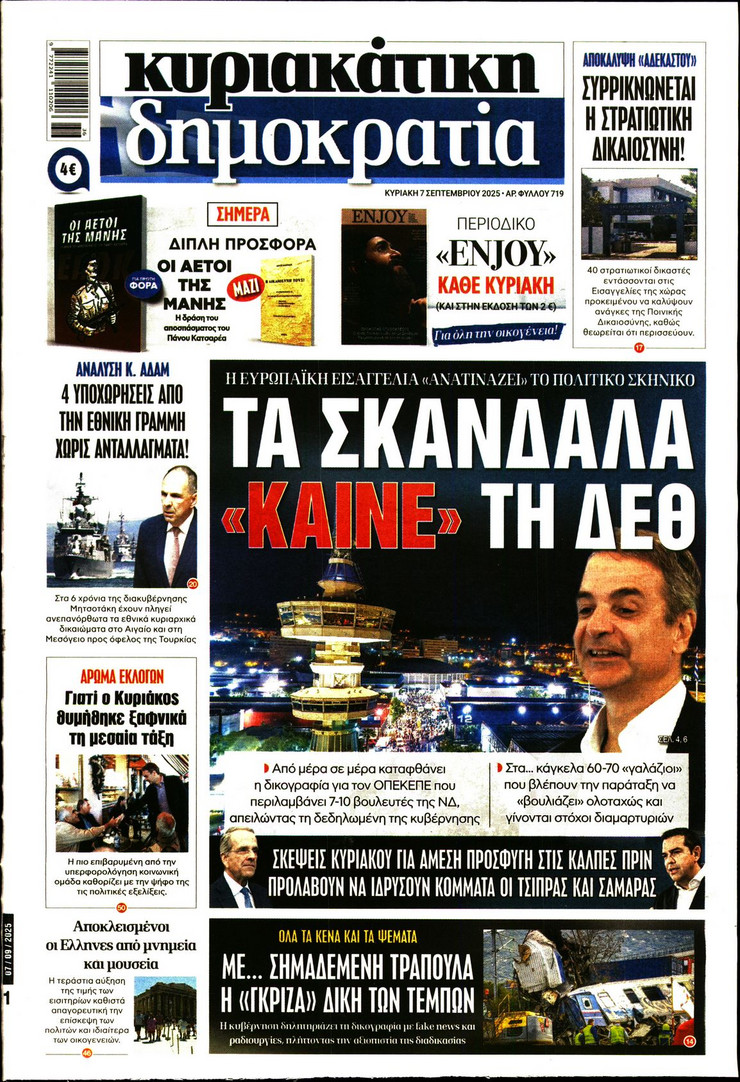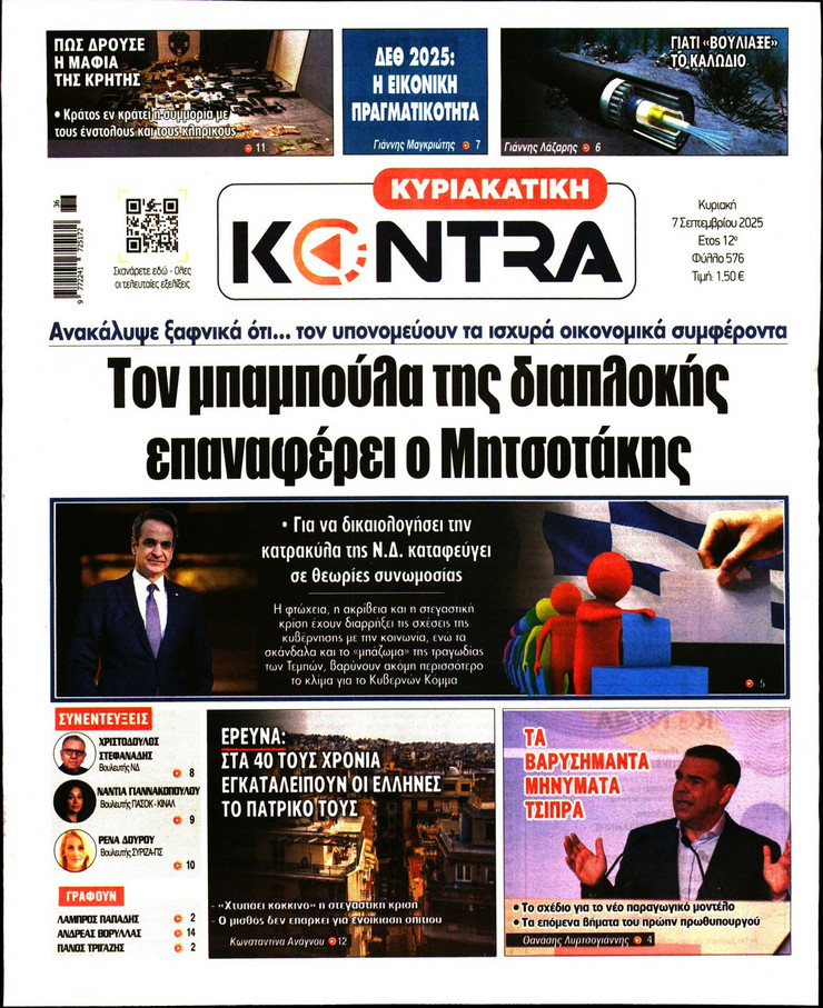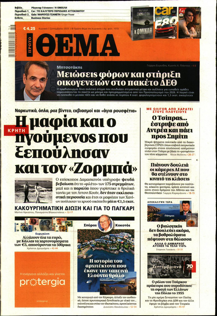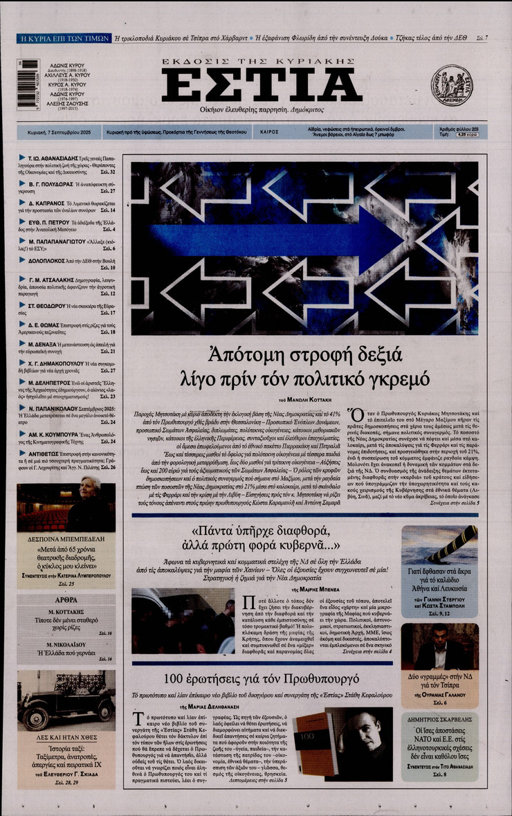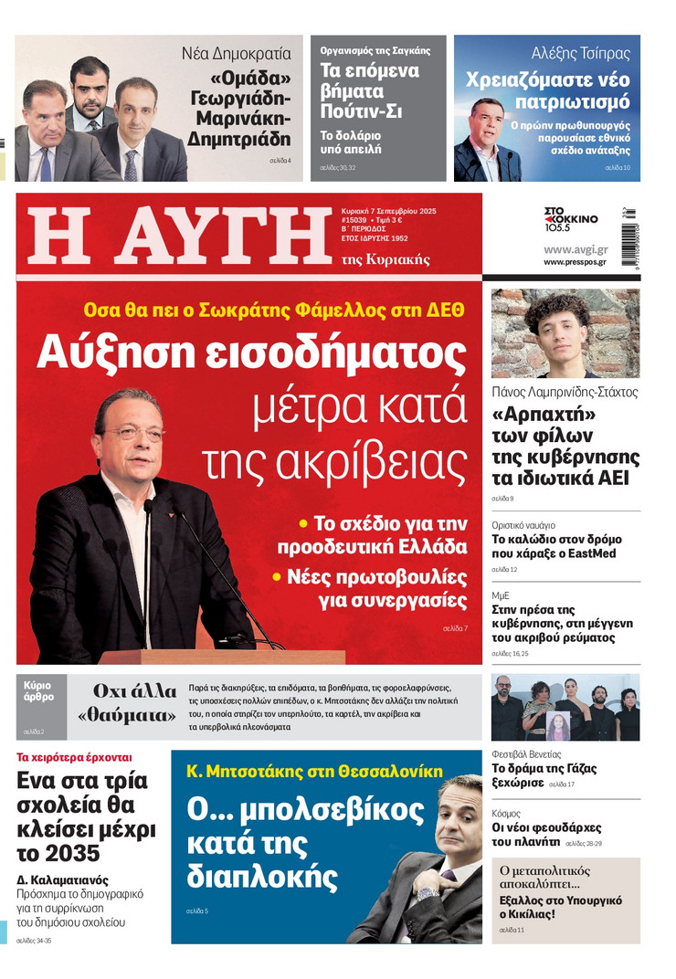 Οι αναμενόμενες εξαγγελίες του πρωθυπουργού Κυριάκου Μητσοτάκη από το Βελλίδειο στα πλαίσια της 89ης ΔΕΘ, η «επιστροφή» του Αλέξη Τσίπρα με το «σχέδιο ριζοσπαστικών μεταρρυθμίσεων», η αλλαγή του γεωπολιτικού χάρτη με την ενίσχυση της Κίνας και τις συνέπειες της πολιτικής του Ντόναλντ Τραμπ και το τοπίο που διαμορφώνεται στις ελληνοτουρκικές σχέσεις ενόψει της συνάντησης Μητσοτάκη-Ερντογάν στη Νέα Υόρκη ξεχωρίζουν στα πρωτοσέλιδα των κυριακάτικων εφημερίδων.