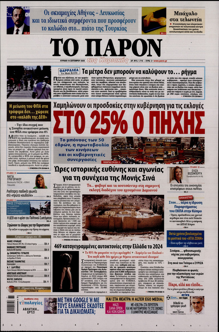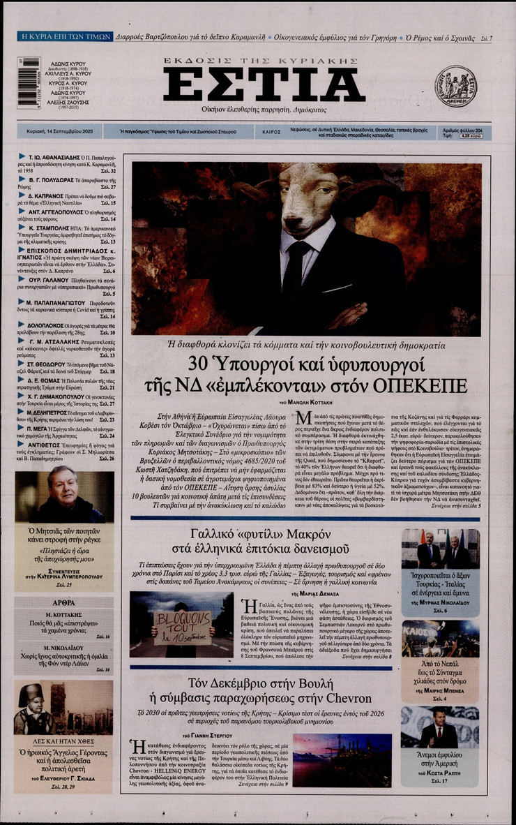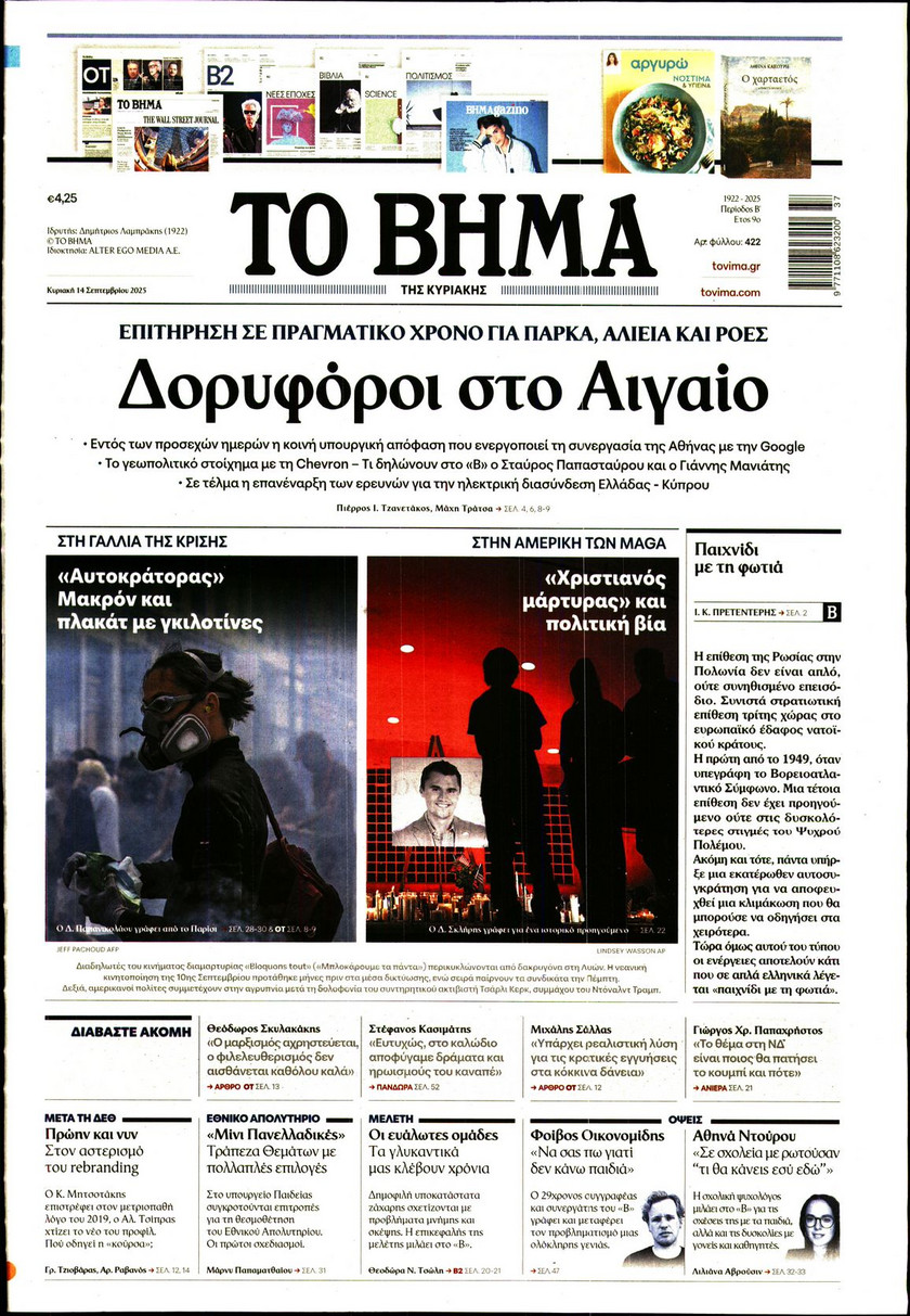 Tο σχέδιο με τις παρεμβάσεις που δρομολογεί η κυβέρνηση για την αντιμετώπιση της στεγαστικής κρίσης ώστε να πέσουν στην αγορά 25.000 ακίνητα, η κρίση στη Γαλλία με τις διαδηλώσεις του κινήματος «Μπλοκάρουμε τα πάντα», το παιχνίδι με τη φωτιά που παίζει η Ρωσία με τα drones στην Πολωνία που κινητοποίησε το ΝΑΤΟ και η δολοφονία του Αμερικανού δεξιού πολιτικού και ακτιβιστή Τσάρλι Κερκ που έχει προκαλέσει φόβο για ξέσπασμα βίαιων επεισοδίων στις ΗΠΑ ξεχωρίζουν στα πρωτοσέλιδα των κυριακάτικων εφημερίδων.
