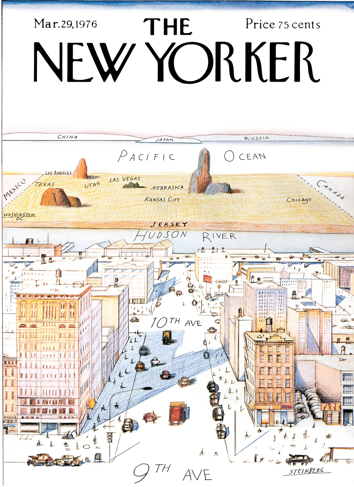 Το 1976, ο Σολ Στάινμπεργκ σχεδίασε για το New Yorker το διάσημο View of the World From 9th Avenue: λίγα τετράγωνα του Μανχάταν αποδίδονται με λεπτομέρεια, ενώ μετά τον Χάντσον όλα γίνονται μια άδεια, απλοϊκή έκταση με μακρινές αναφορές στην Αμερική και τον κόσμο. Με χιούμορ και σατιρική ματιά στη «μυωπία» των Νεοϋορκέζων, το έργο έγινε εμβληματικό και στολίζει τοίχους σε όλο τον κόσμο.