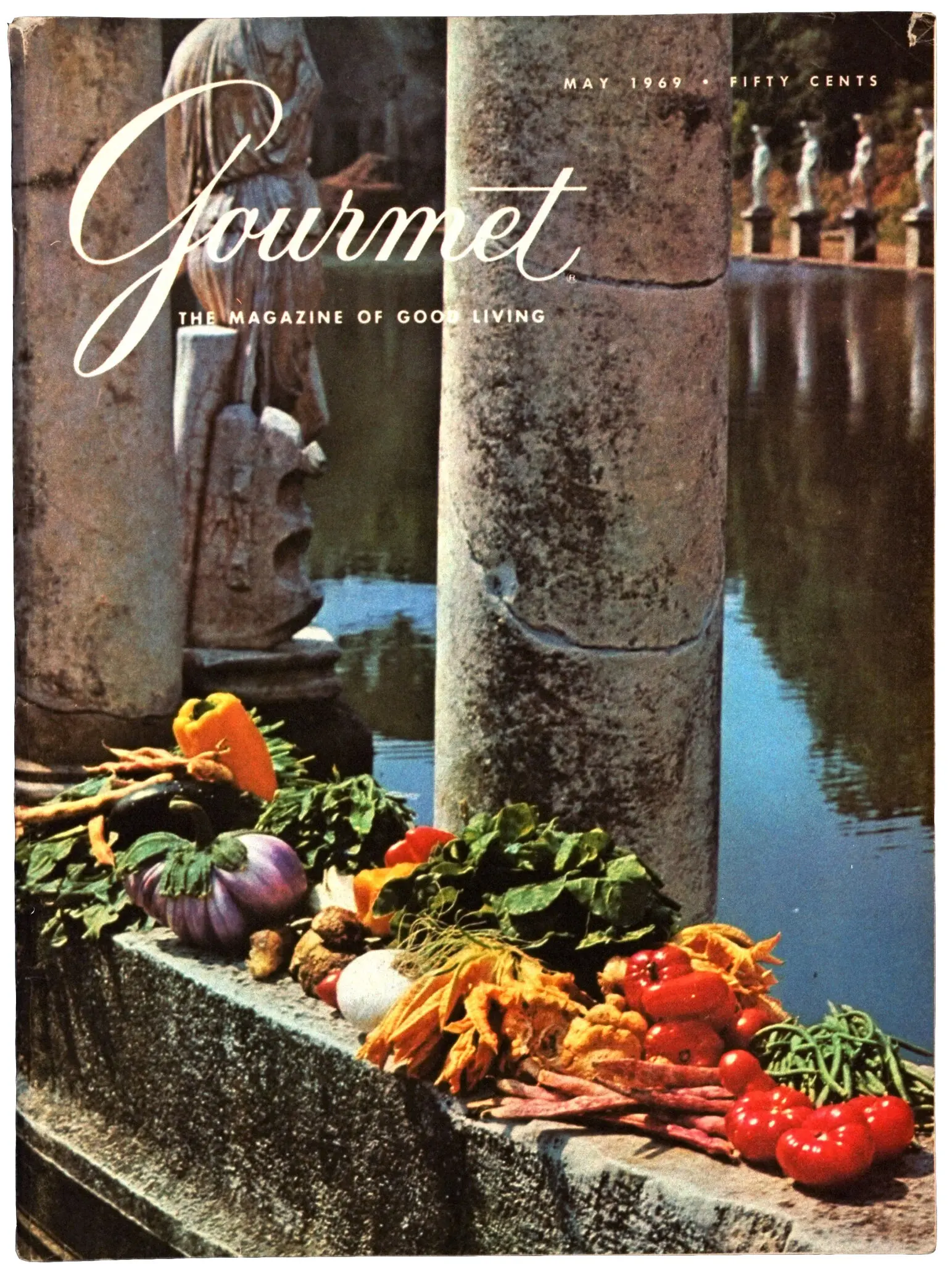 Το Gourmet, το «περιοδικό της καλής ζωής», ιδρύθηκε το 1941, εν μέσω στερήσεων και δελτίου τροφίμων, όμως ο εκδότης Ερλ ΜακΌσλαντ πόνταρε στη φαντασία γύρω από το φαγητό και κέρδισε. Στη δεκαετία του ’60, με την Τζέιν Μοντάντ στο τιμόνι, το περιοδικό ξεχώρισε για τις πλούσιες φωτογραφίες και το ταξιδιωτικό του ύφος, με πιο εμβληματικό το εξώφυλλο του Μαΐου 1969: ο φωτογράφος Ρόνι Ζακ αποτύπωσε μια ρωμαϊκή εξέδρα στη βίλα του Αδριανού, στρωμένη με λαχανικά που έλαμπαν σαν θησαυροί – από φασολάκια μέχρι μελιτζάνες Rosa Bianca. Σαν πίνακας Ολλανδών δασκάλων, προανήγγειλε την εποχή όπου το φαγητό έγινε τέχνη, πειρασμός και σύμβολο κύρους.