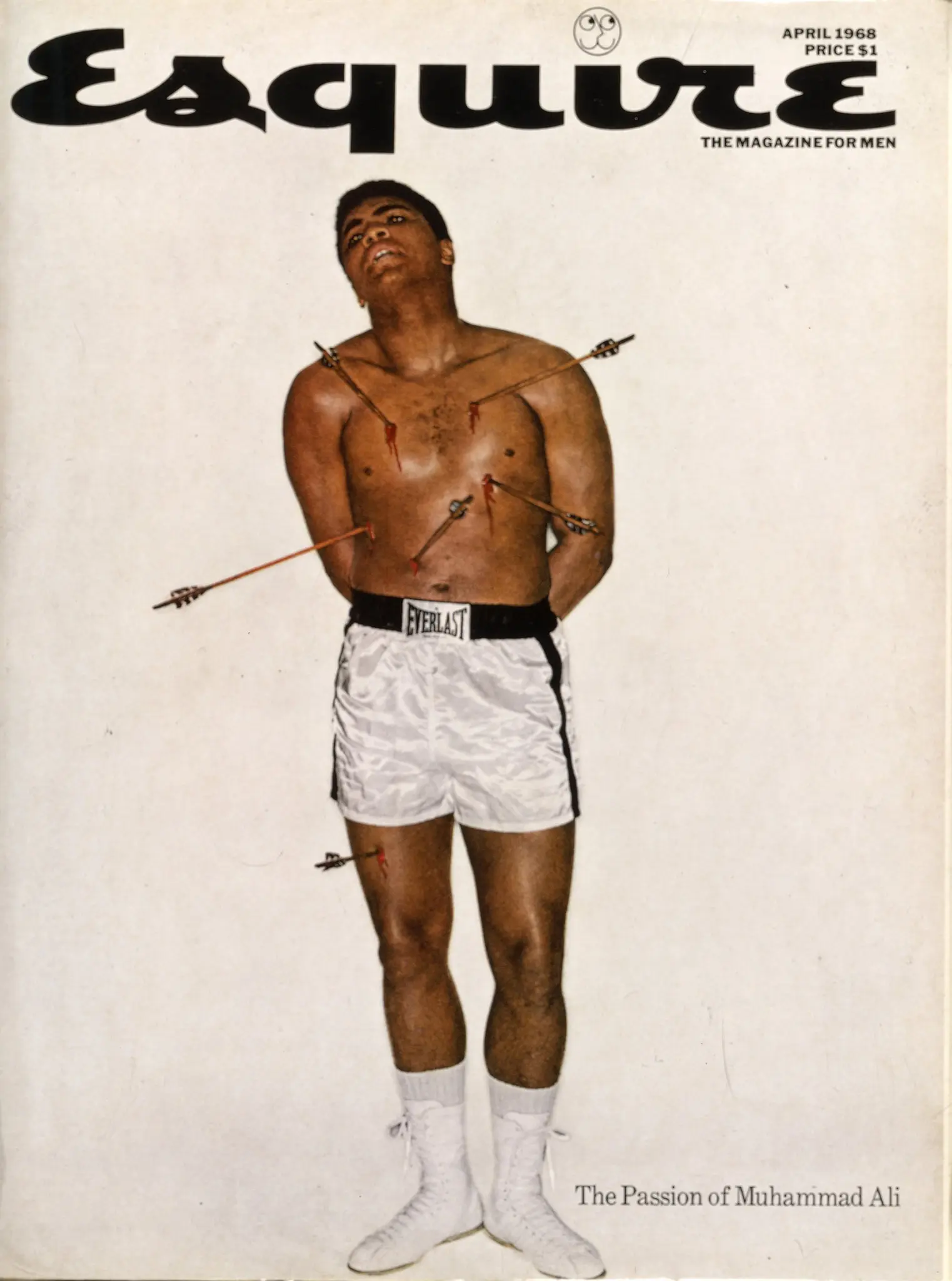 Ο Μοχάμεντ Άλι, λίγους μήνες μετά την άρνησή του να καταταγεί στον αμερικανικό στρατό για θρησκευτικούς λόγους, αποκλείστηκε από το μποξ για τρία χρόνια. Στα τέλη του 1967 φόρεσε ξανά τα λευκά σορτς Everlast, όχι στο ρινγκ αλλά για τις ανάγκες μιας φωτογράφισης του Esquire. Ο φωτογράφος Καρλ Φίσερ και ο art director Τζορτζ Λόις τον έπεισαν να υποδυθεί τον Άγιο Σεβαστιανό, εμπνευσμένοι από τον πίνακα του Φραντσέσκο Μποτιτσίνι (1465). Με ψεύτικα βέλη κολλημένα με κόλλα και πετονιά, ο Άλι παρουσιάστηκε ως μάρτυρας που αντιστέκεται.