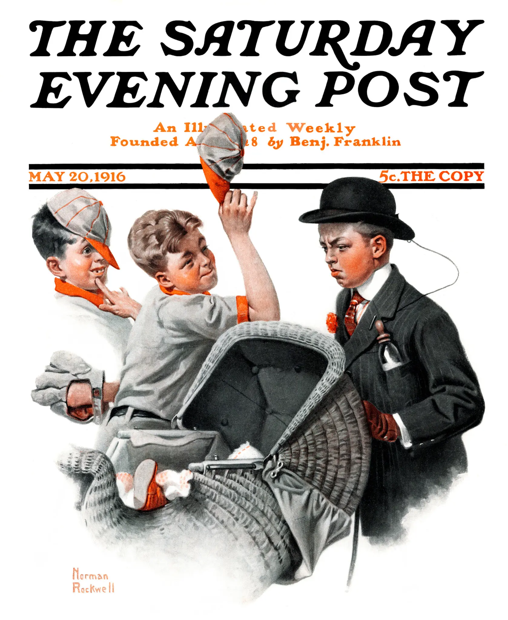 Το πρώτο εξώφυλλο του Νόρμαν Ρόκγουελ για το Saturday Evening Post το 1916, με τίτλο Boy With Baby Carriage, έδειχνε ένα αγόρι με σοβαρό ύφος να σπρώχνει καρότσι μωρού, ενώ δύο συνομήλικοί του με στολές μπέιζμπολ τον κοιτούν χλευαστικά. Σε αντίθεση με τα συνηθισμένα εξώφυλλα του περιοδικού –ιδανικές γυναικείες φιγούρες σε άψογες, σχεδόν διαφημιστικές πόζες– η εικόνα έφερε ρεαλισμό και αφήγηση από την καθημερινότητα. Ο Ρόκγουελ, μόλις 22 ετών τότε, έθεσε έτσι τον τόνο για εκατοντάδες μετέπειτα εξώφυλλά του, που ισορροπούσαν ανάμεσα στη νοσταλγία και την αλήθεια της αμερικανικής ζωής.