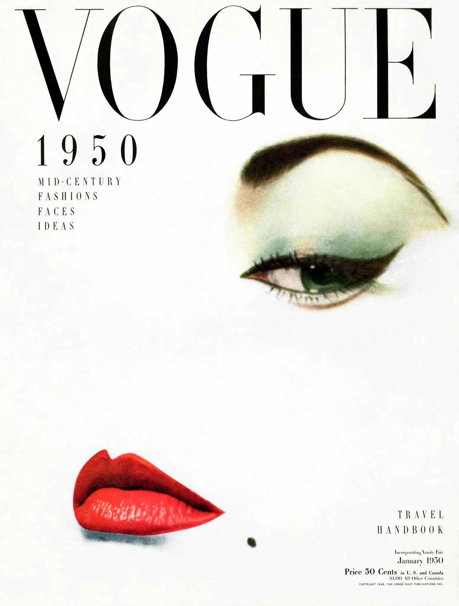 Το Vogue του Ιανουαρίου 1950 παρουσίασε ένα από τα πιο πρωτοποριακά εξώφυλλά του: ο Έρβιν Μπλούμενφελντ μείωσε το πρόσωπο του σούπερ μόντελ Τζιν Πάτσετ στα απολύτως βασικά – μια σκιασμένη πράσινη ματιά, ένα καμπυλωτό φρύδι, κόκκινα χείλη και μια ελιά που «αιωρούνταν» πάνω σε λευκό κενό. Ο καλλιτεχνικός διευθυντής Αλεξάντερ Λίμπερμαν, λάτρης του Μοντερνισμού, ενέπνευσε αυτή τη μινιμαλιστική αισθητική, που θύμιζε τις ντανταϊστικές αναζητήσεις του Μπλούμενφελντ στην Ευρώπη του ’30. Με μια απλή μετατόπιση λεπτομερειών, το εξώφυλλο έδωσε νέα πνοή στη φωτογραφία μόδας, ανοίγοντας δρόμο για πιο τολμηρά και πειραματικά οπτικά παιχνίδια.