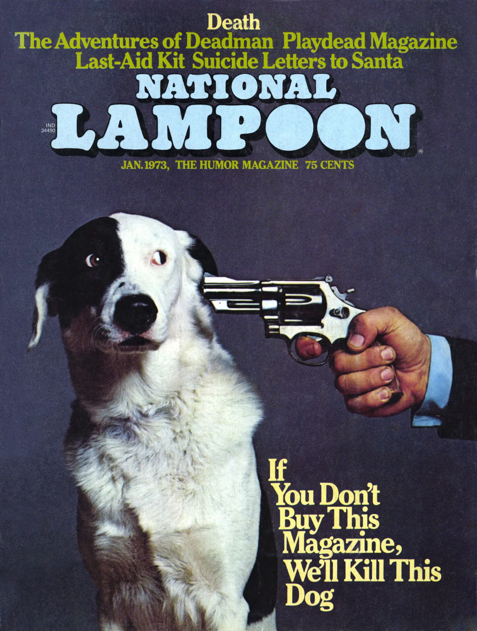 Το National Lampoon, που ξεκίνησε το 1970 από το Harvard Lampoon, έμεινε στην Ιστορία με το «Death» τεύχος του 1973. Στο εξώφυλλο, ο σκύλος Mr. Cheeseface κοιτάζει ανήσυχα ένα περίστροφο στραμμένο στο κεφάλι του, με τη φράση «If You Don’t Buy This Magazine, We’ll Kill This Dog». Η ιδέα ήταν του κωμικού Ed Bluestone, η φωτογραφία του Ronald G. Harris και η επιτυχία της βασίστηκε στο βλέμμα του σκύλου. Το εξώφυλλο έγινε εμβληματικό, επηρεάζοντας περιοδικά όπως το Spy και το George να δοκιμάζουν τα όρια της σάτιρας.