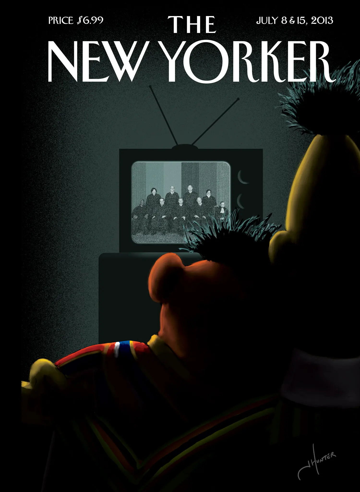Τον Ιούνιο του 2013, δύο αποφάσεις του Ανώτατου Δικαστηρίου των ΗΠΑ (στις υποθέσεις Windsor v. United States και Hollingsworth v. Perry) άνοιξαν τον δρόμο για την ομοσπονδιακή αναγνώριση των γάμων ομοφύλων. Για να σηματοδοτήσει τη στιγμή, το The New Yorker δημοσίευσε ένα τρυφερό εξώφυλλο του καλλιτέχνη Jack Hunter: ο Μπέρτ και ο Έρνι από το «Sesame Street» κάθονται αγκαλιασμένοι στον καναπέ, με το φως της τηλεόρασης να προβάλλει τις σκιές τους, καθώς παρακολουθούν τους εννέα δικαστές.