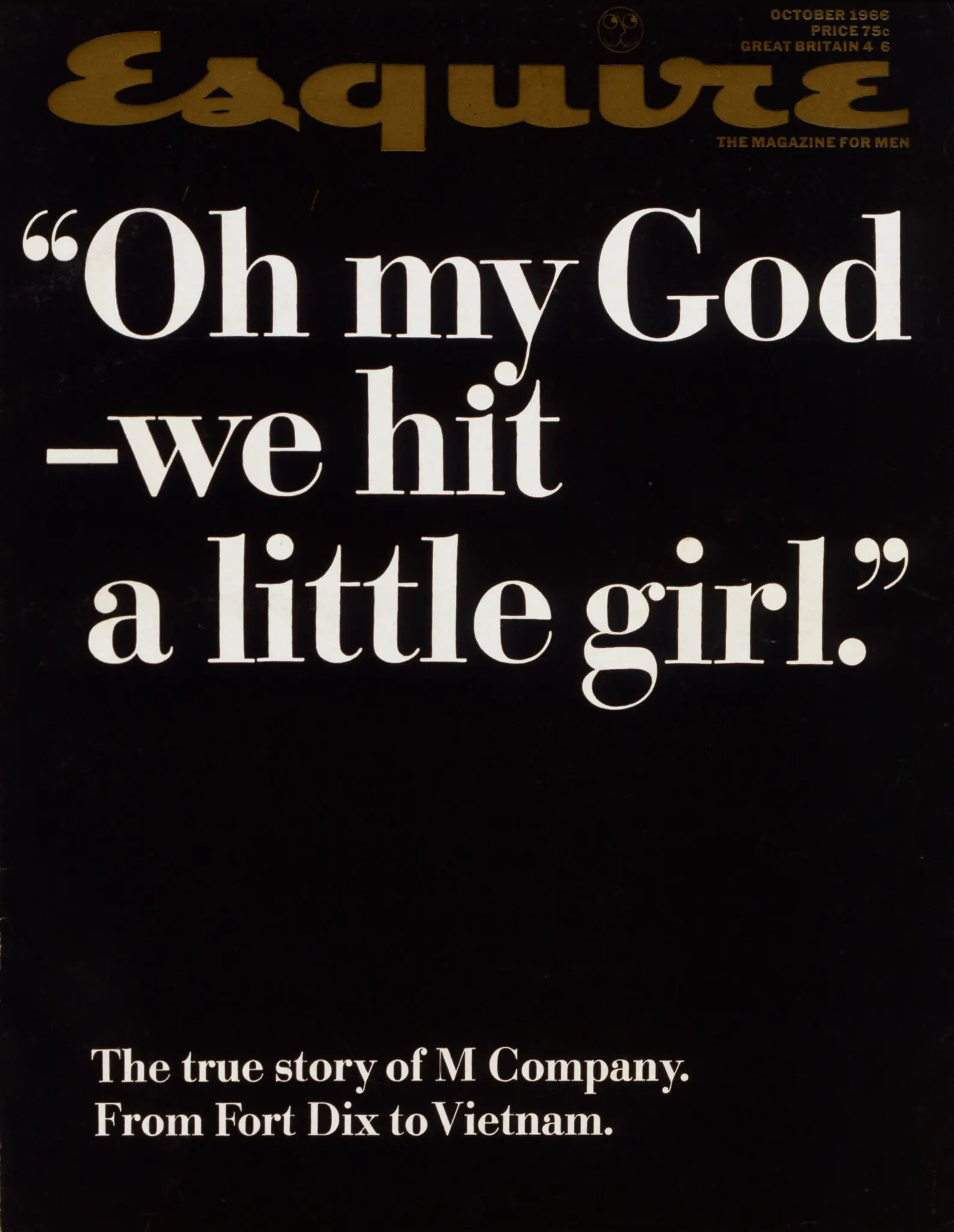 Τον Οκτώβριο του 1966, το Esquire κυκλοφόρησε με ένα από τα πιο συγκλονιστικά εξώφυλλα της εποχής, στηριγμένο στο ρεπορτάζ του δημοσιογράφου John Sack, που είχε ακολουθήσει στρατιώτες των ΗΠΑ στο Βιετνάμ. Στην πρώτη τους επιχείρηση, ένας στρατιώτης εκτόξευσε χειροβομβίδα σε μια καλύβα· το αποτέλεσμα ήταν ο θάνατος ενός μικρού κοριτσιού. «Oh my God — we hit a little girl», ήταν η φράση που εκτυπώθηκε σε λευκά γράμματα πάνω σε μαύρο φόντο.