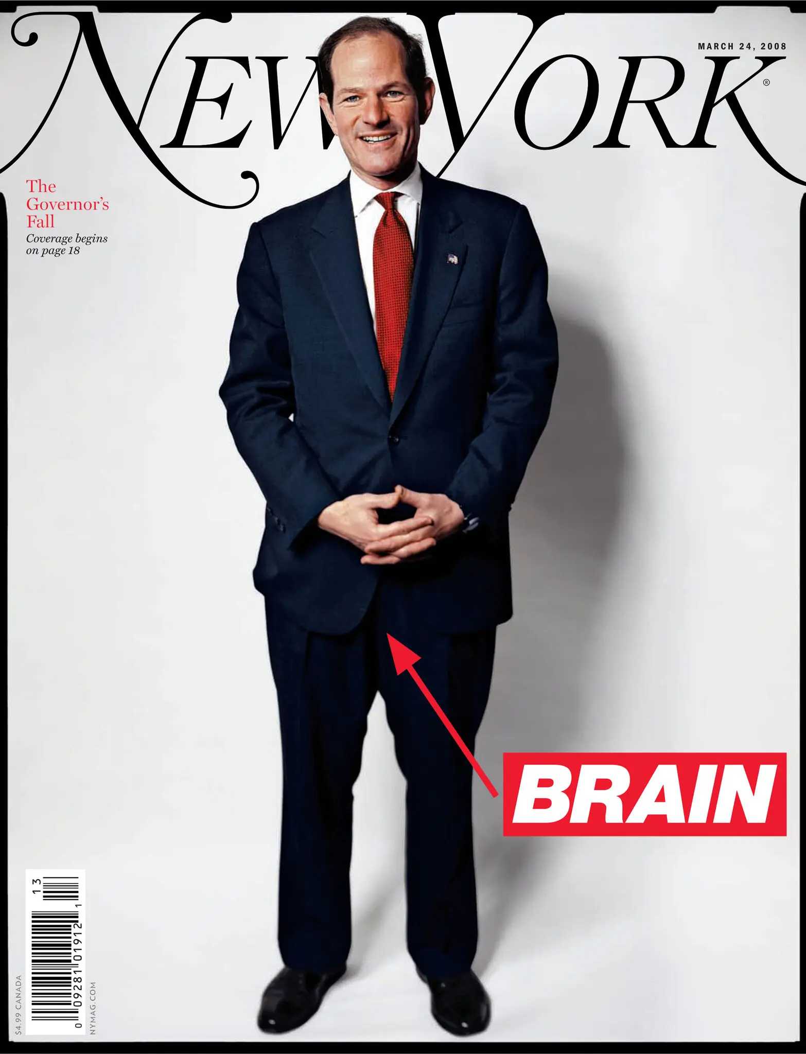 Τον Μάρτιο του 2008, όταν ο κυβερνήτης της Νέας Υόρκης Έλιοτ Σπίτσερ αποκαλύφθηκε ως «Πελάτης 9» σε σκάνδαλο πορνείας, ο τότε διευθυντής του New York Magazine Άνταμ Μος πέταξε το προγραμματισμένο εξώφυλλο και ζήτησε νέο. Η Τζόντι Κουόν προσέγγισε καλλιτέχνες για ιδέες και η Μπάρμπαρα Κρούγκερ έδωσε την πιο καίρια: πάνω σε πορτρέτο του Σπίτσερ πρόσθεσε τη λέξη «BRAIN» και ένα βέλος που έδειχνε στη βουβωνική του χώρα.