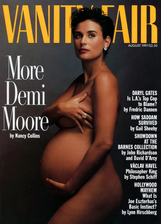 Το 1991, στο τέλος μιας φωτογράφισης με την Άνι Λίμποβιτς, η Ντέμι Μουρ –έγκυος στο δεύτερο παιδί της– πόζαρε γυμνή, καλύπτοντας με τα χέρια το στήθος και την κοιλιά της. Η αρχισυντάκτρια του Vanity Fair Τίνα Μπράουν, που μόλις είχε αποκτήσει κι εκείνη παιδί, διάλεξε τη φωτογραφία για το εξώφυλλο του Αυγούστου. Η Μουρ ήταν ενθουσιασμένη, αλλά δεν περίμενε την καταιγίδα αντιδράσεων: αλυσίδες σούπερ μάρκετ αρνήθηκαν να κυκλοφορήσουν το τεύχος και κατήγοροι μιλούσαν για «έκθεση παιδιών» σε ακατάλληλο περιεχόμενο. Έκτοτε αμέτρητες γυναίκες την έχουν αντιγράψει, αποδεικνύοντας ότι η εγκυμοσύνη όχι μόνο μπορεί να θεωρείται σέξι, αλλά αξίζει να φαίνεται.