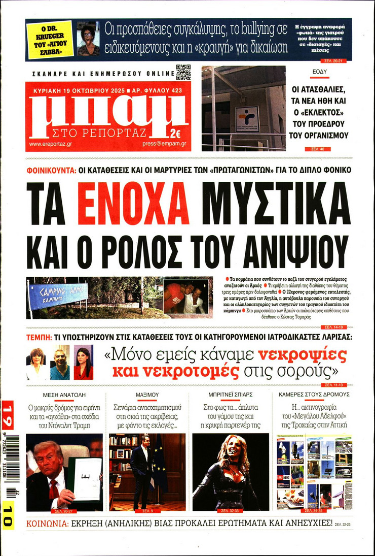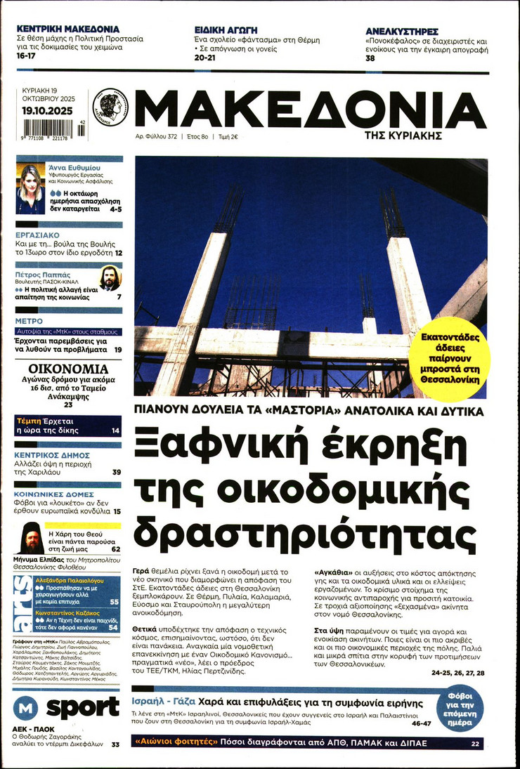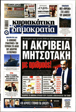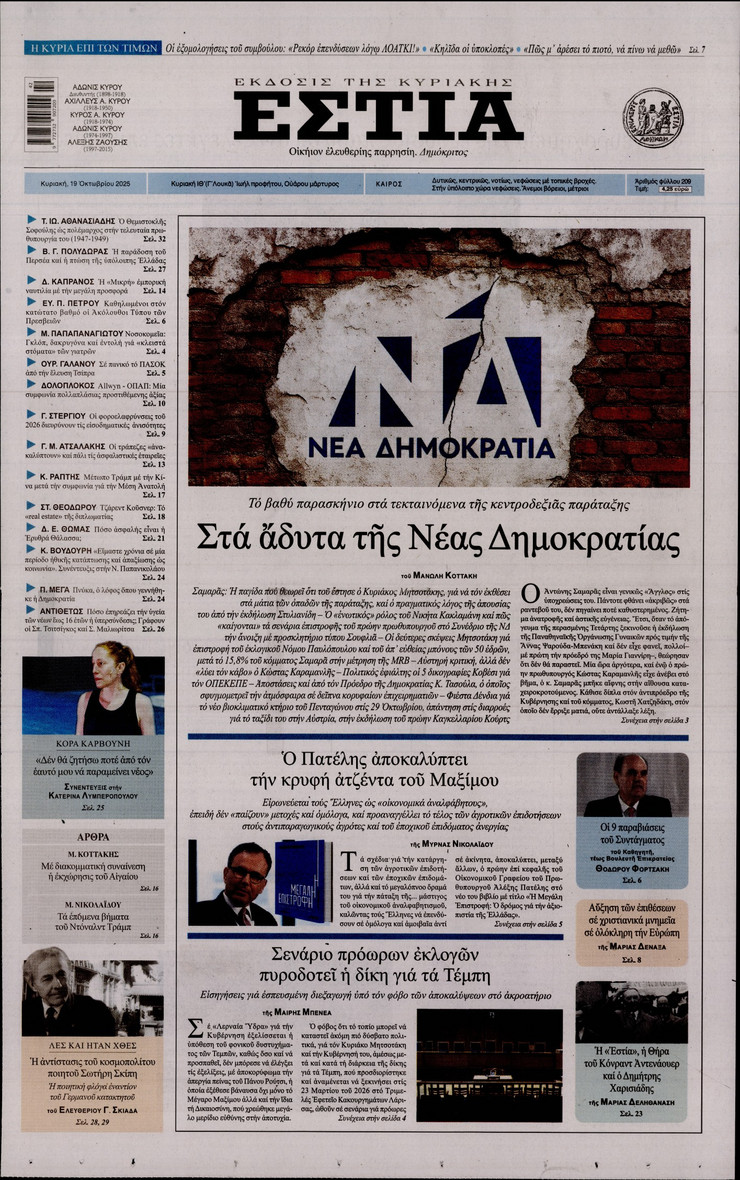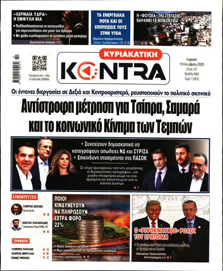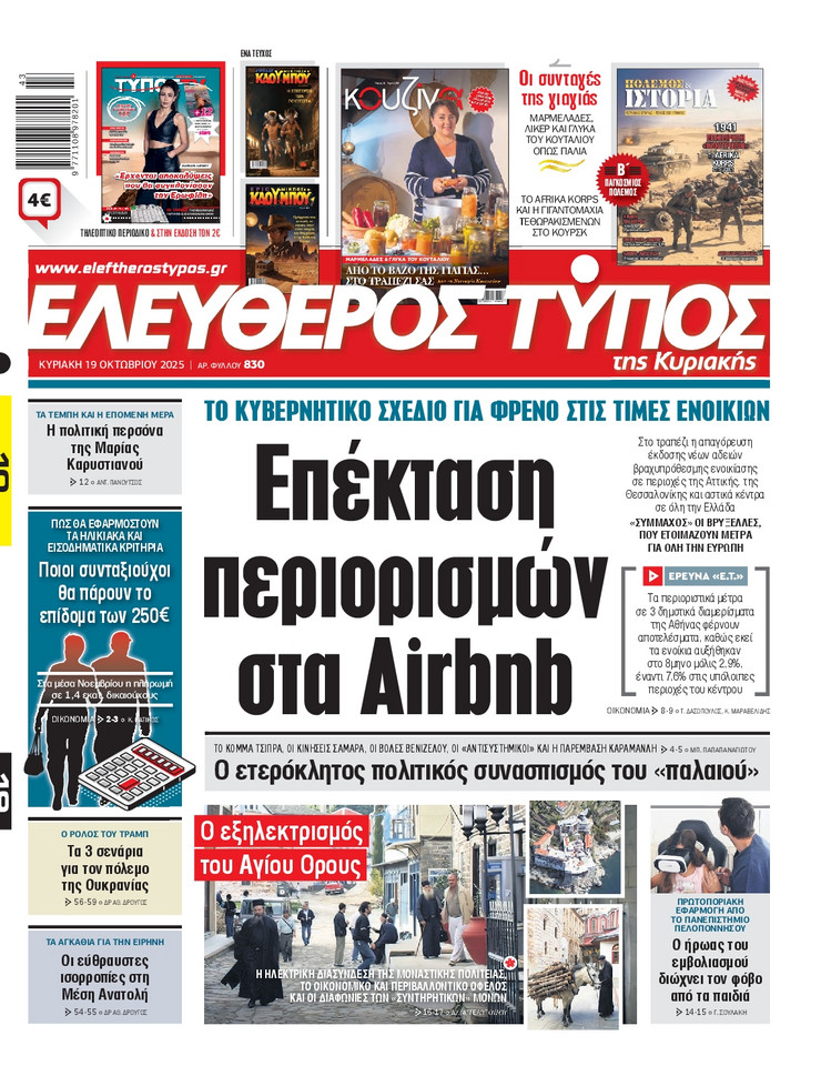 Η εύθραυστη εκεχειρία στη Γάζα και η επόμενη ημέρα στη Μέση Ανατολή με την ενεργό συμμετοχή της Ελλάδας μετά τη συμφωνία του Σαρμ Αλ Σέιχ. όλο το παρασκήνιο για την ηλεκρική διασύνδεση Ελλάδας-Κύπρου, ο νέος «εμφύλιος» στον ΣΥΡΙΖΑ και τα κόμματα της Αριστεράς μετά τις κινήσεις του Αλέξη Τσίπρα και το σχέδιο της κυβέρνησης για φρένο στις τιμές των ενοικίων ξεχωρίζουν στα πρωτοσέλιδα των κυριακάτικων εφημερίδων.
