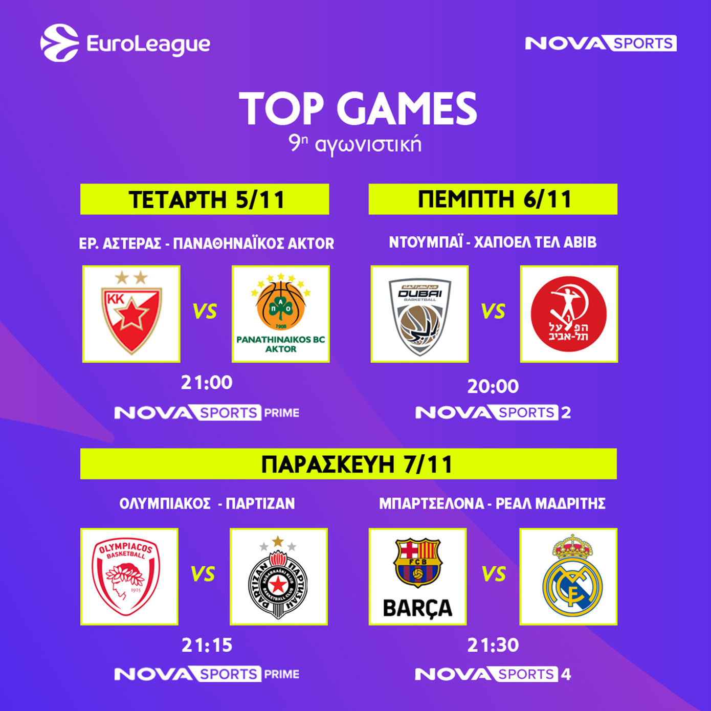 Η EuroLeague, η κορυφαία ευρωπαϊκή διασυλλογική διοργάνωση στο χώρο του μπάσκετ και μεγαλύτερη όλων των εποχών, ετοιμάζεται για τη συναρπαστική 9η αγωνιστική με ελληνοσερβικές μονομαχίες και El Clasico στο παρκέ του Novasports! O Παναθηναϊκός AKTOR ταξιδεύει για το Βελιγράδι εκεί όπου θα αναμετρηθεί με τον Ερυθρό Αστέρα (5/11, 21:00), ενώ ο Ολυμπιακός θα υποδεχτεί στο ΣΕΦ την Παρτίζαν (7/11, 21:15). Από το υπόλοιπο πρόγραμμα ξεχωρίζει το El Clasico, Μπαρτσελόνα – Ρεάλ Μαδρίτης (7/11, 21:30).