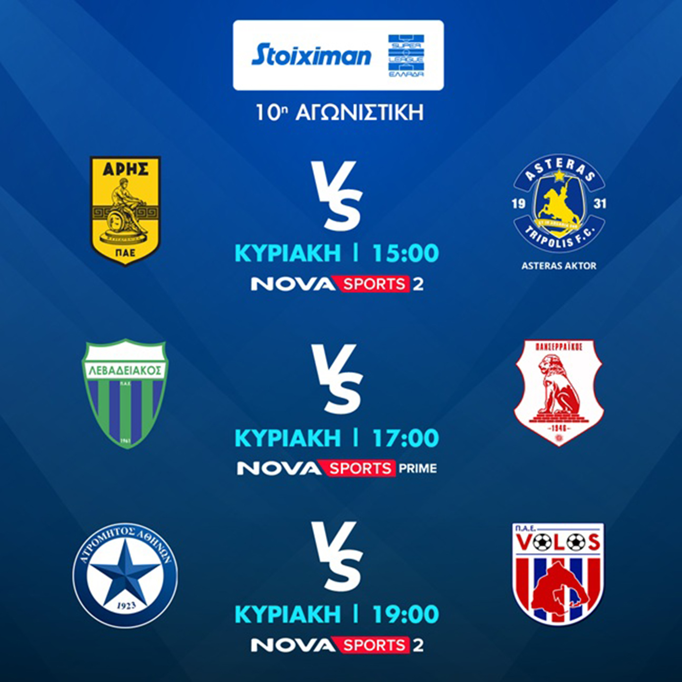 Η Stoiximan Super League, συνεχίζεται με την 10η αγωνιστική και τις αναμετρήσεις Άρης – Asteras Aktor (9/11, 15:00), Λεβδειακός – Πανσερραϊκός (9/11, 17:00), Ατρόμητος – Βόλος ΝΠΣ (9/11, 19:00) που θα μεταδοθούν στα κανάλια Novasports. Στα κανάλια Cosmote Sport θα μεταδοθεί το ντέρμπι Παναθηναϊκός – ΠΑΟΚ (9/11, 21:00) καθώς και τα παιχνίδια Παναιτωλικός – ΑΕΛ Novibet (8/11, 17:00), Κηφισιά – Ολυμπιακός (9/11, 15:00), ΟΦΗ – ΑΕΚ (9/11, 17:30). Οι αγώνες του ελληνικού πρωταθλήματος θα πλαισιωθούν στο Novasports με την αγαπημένη εκπομπή των φιλάθλων «Η Ώρα των Πρωταθλητών» με τους Γιαννίκο Δούσκα, Λίλα Κουντουριώτη, Αποστόλη Λάμπο, καθώς και με την εκπομπή «Monday Football Club» με τους Γιάννη Πάγκο και Ντέμη Νικολαΐδη.