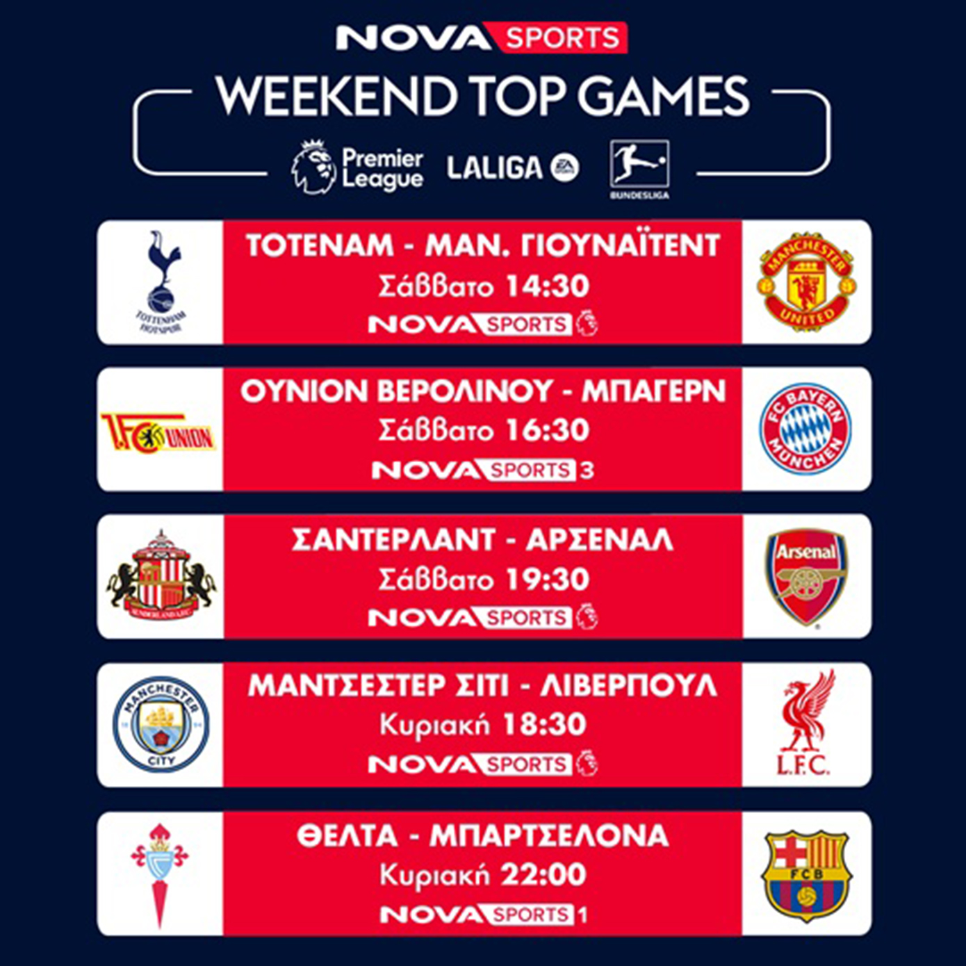 H Premier League, το κορυφαίο πρωτάθλημα στον κόσμο και τη φωνή του Χρήστου Σωτηρακόπουλου στα κανάλια Novasports, συνεχίζεται με την 11η αγωνιστική όπου τα βλέμματα στρέφονται στα ντέρμπι Μάντσεστερ Σίτι – Λίβερπουλ (9/11, 18:30) και Τότεναμ – Μάντσεστερ Γιουνάιτεντ (8/11, 14:30). Από τις υπόλοιπες αναμετρήσει ξεχωρίζουν Σάντερλαντ – Άρσεναλ (8/11, 19:30), Τσέλσι – Γουλβς (8/11, 22:00), Νότιγχαμ Φόρεστ – Λιντς (9/11, 16:00). Η Premier League θα πλαισιωθεί με τις εκπομπές «Premier League Kick Off» και «Premier League The Show» με τον Άγγελο Στυλιάδη και τον Γιώργο Σαμαρά.