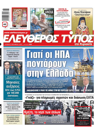 Οι νέες συμφωνίες για LNG και υδρογονάνθρακες που υπέγραψε η Ελλάδα και την αναβαθμίζουν στον νέο ενεργειακό χάρτη της Ευρώπης, η νέα βεντέτα στα Βορίζια της Κρήτης που δείχνει ότι ένα κομμάτι της κοινωνίας θεωρεί την οπλοκατοχή «παράδοση» και την εκδίκηση «δικαίωση» και οι πρώτες 7 ημέρες της Κίμπερλι Γκιλφόιλ στην Ελλάδα ξεχωρίζουν στα πρωτοσέλιδα των κυριακάτικων εφημερίδων.