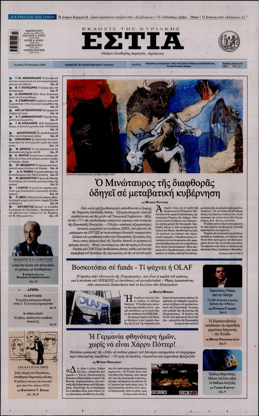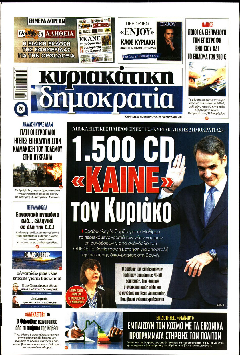 To ειρηνευτικό σχέδιο 28 σημείων του Ντόναλντ Τραμπ για τον τερματισμό του πολέμου στην Ουκρανία, το οποίο εξετάζεται από Κίεβο, Μόσχα και ευρωπαϊκές κυβερνήσεις και που ουσιαστικά αποτελεί ένα σκληρό τελεσίγραφο προς τον Ουκρανό πρόεδρο Βολοντίμιρ Ζελένκσι, οι επτά μεγάλες αλλαγές που προωθεί η κυβέρνηση για διαθήκες και κληρονομίες, ο «πόλεμος» ΗΠΑ και Κίνας για τα λιμάνια και τους αγωγούς στην Ελλάδα και και ο νέος «κόφτης» που προωθεί το υπουργείο Οικονομικών στα Airbnb, ξεχωρίζουν στα πρωτοσέλιδα των κυριακάτικων εφημερίδων.