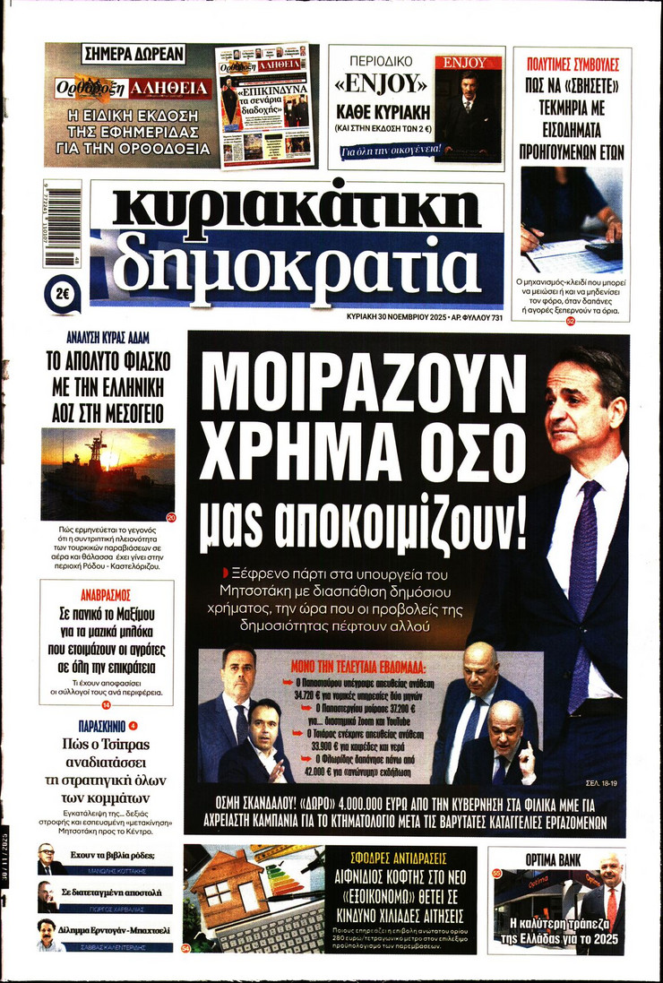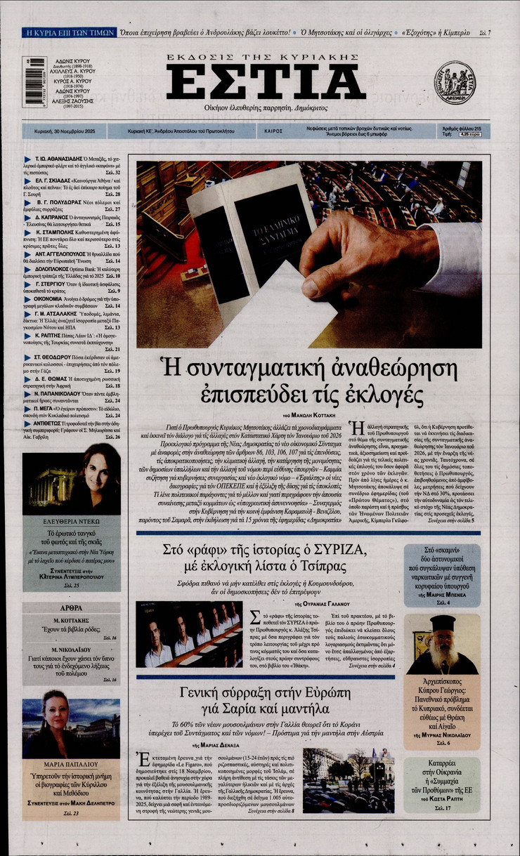 Το νέο πολιτικό σκηνικό που διαμορφώνεται μετά την κυκλόφορία του βιβλίου του πρώην πρωθυπουργού Αλέξη Τσίπρα «Ιθάκη», τα γεωπολιτικά «παιχνίδια» και ο «πόλεμος» διπλωματίας που διαξάγεται για τον τερματισμό του πολέμου στην Ουκρανία, όλα όσα αλλάζουν στις κληρονομιές και στις διαθήκες και οι παρεμβάσεις που σχεδιάζει η κυβέρνηση για την ελάφρυνση νοικοκυριών και επιχειρήσεων ξεχωρίζουν στα πρωτοσέλιδα των κυριακάτικων εφημερίδων.