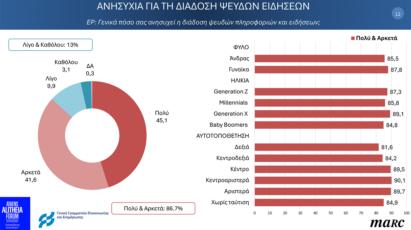 Από τα ευρήματα της έρευνας προκύπτει επίσης ότι το 86,7% των ερωτηθέντων ανησυχούν για τη διάδοση ψευδών ειδήσεων και κατά 73,5% πιστεύουν πως ο μέσος πολίτης δύσκολα μπορεί να διακρίνει μια ψευδή είδηση.